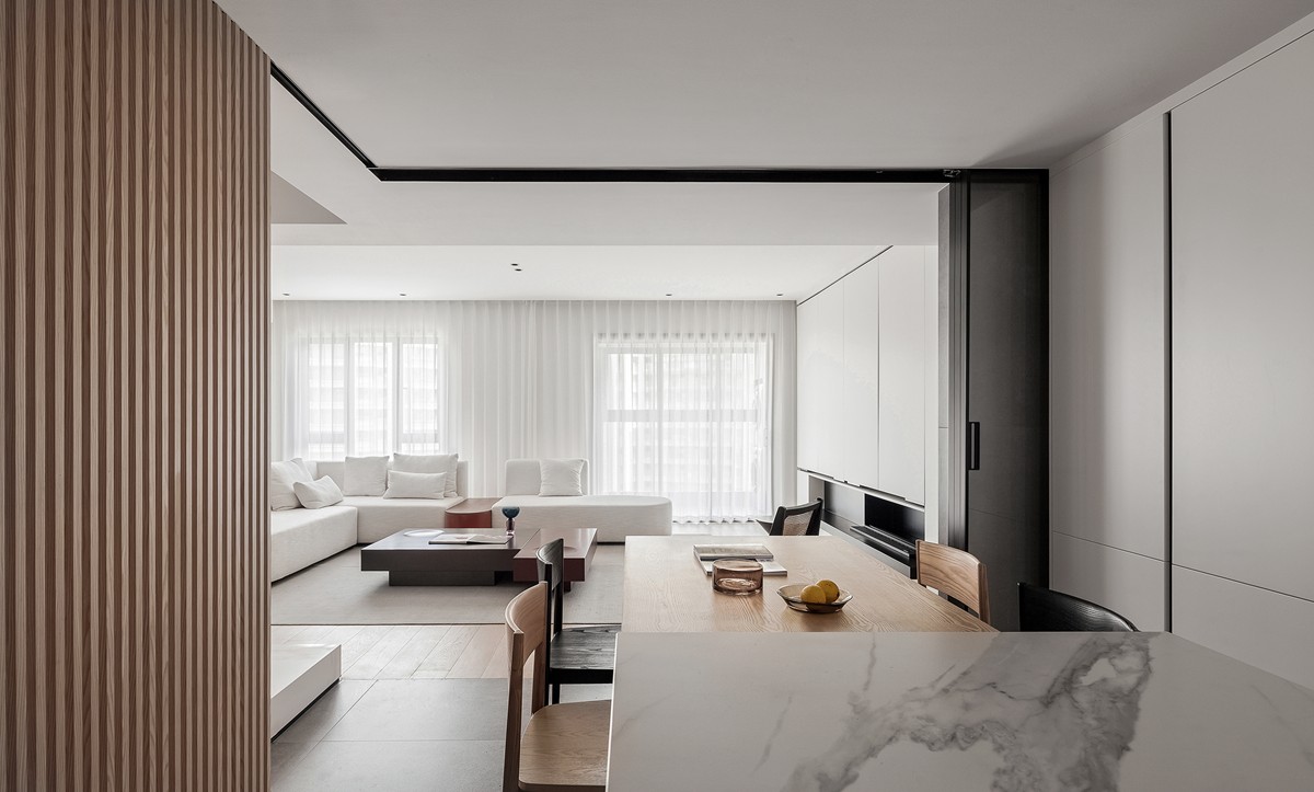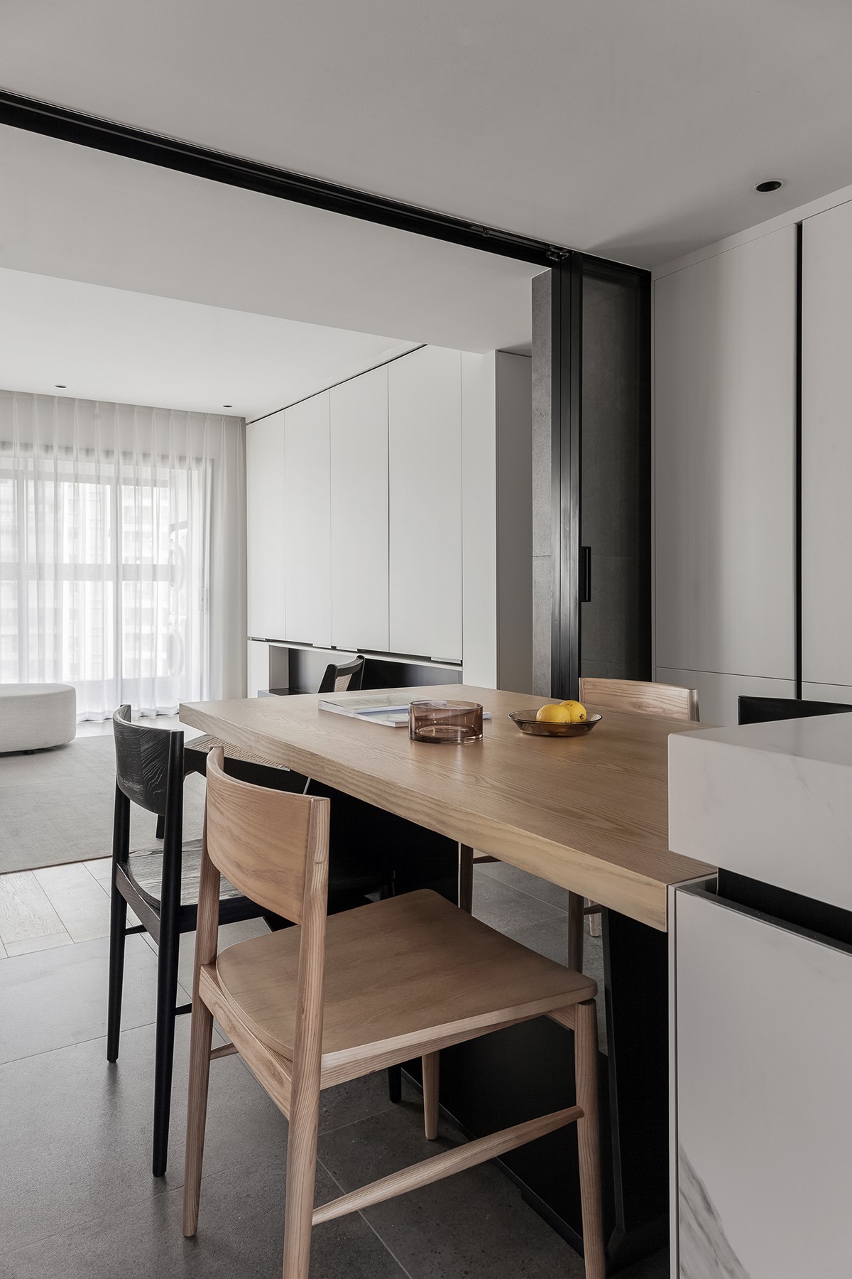折叠移门让餐厨“可开可合”——朋友聚餐时推开门,烟火气和客厅的松弛感连在一起;