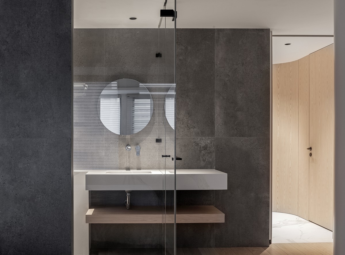 灰白瓷砖里嵌着原木柜,圆形镜和独立浴缸的搭配,把“功能性”做成了“氛围感”——泡澡时,百叶窗滤过的光漫进来,连独处都成了享受。