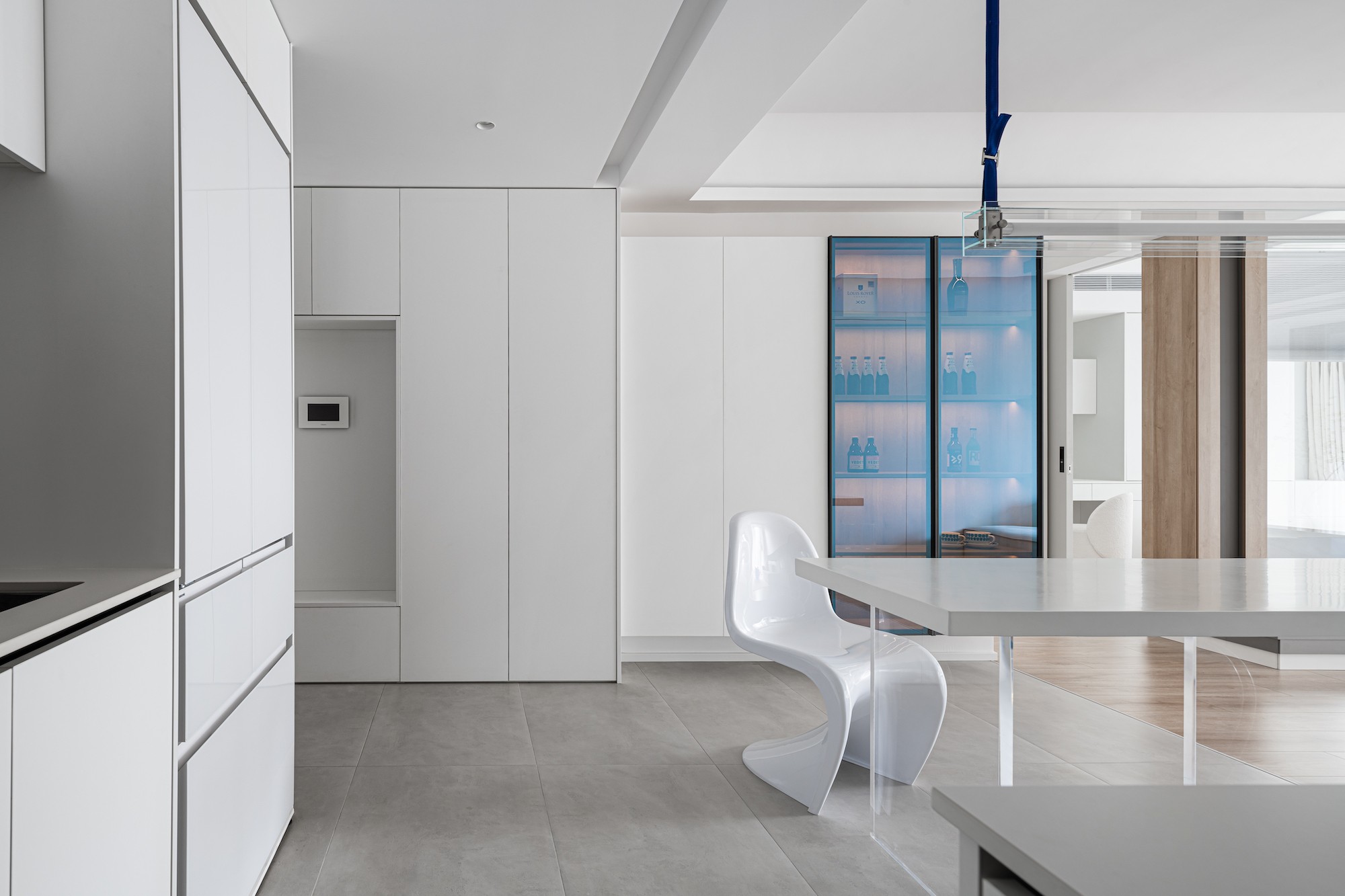 餐厅的蓝色玻璃酒柜是“通透小心机”:灯光透过玻璃漫开,既藏了酒饮,又成了空间的“发光装饰”;透明椅+悬浮桌的组合,让餐厨区连空气都透着轻盈。