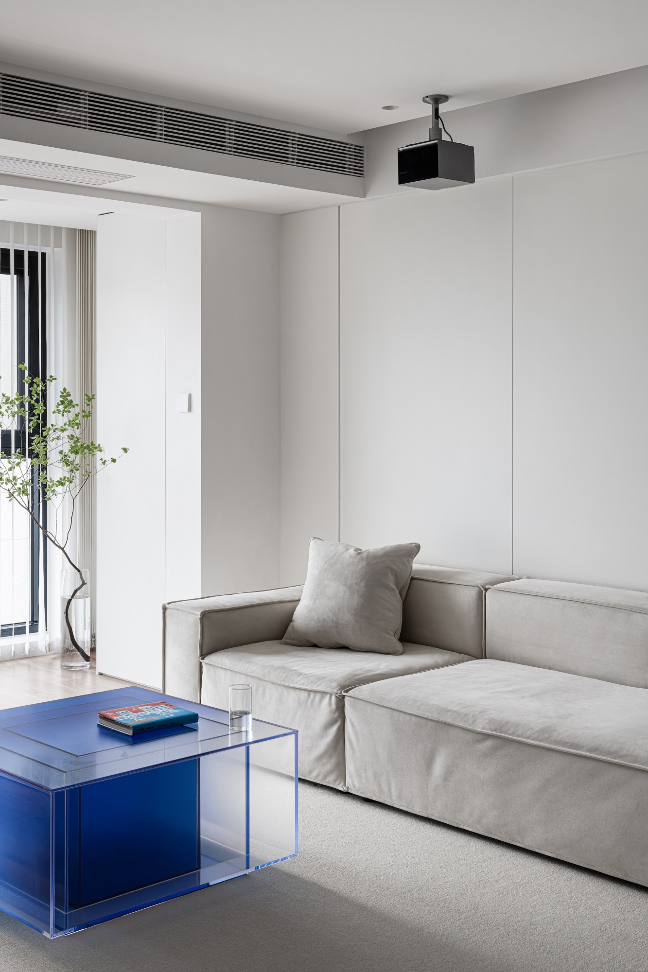 奶油色矮沙发贴墙而放,留出通透动线;克莱因蓝亚克力茶几是点睛之笔——冷调玻璃的轻盈感,让空间瞬间跳出沉闷,连光影都跟着灵动起来。