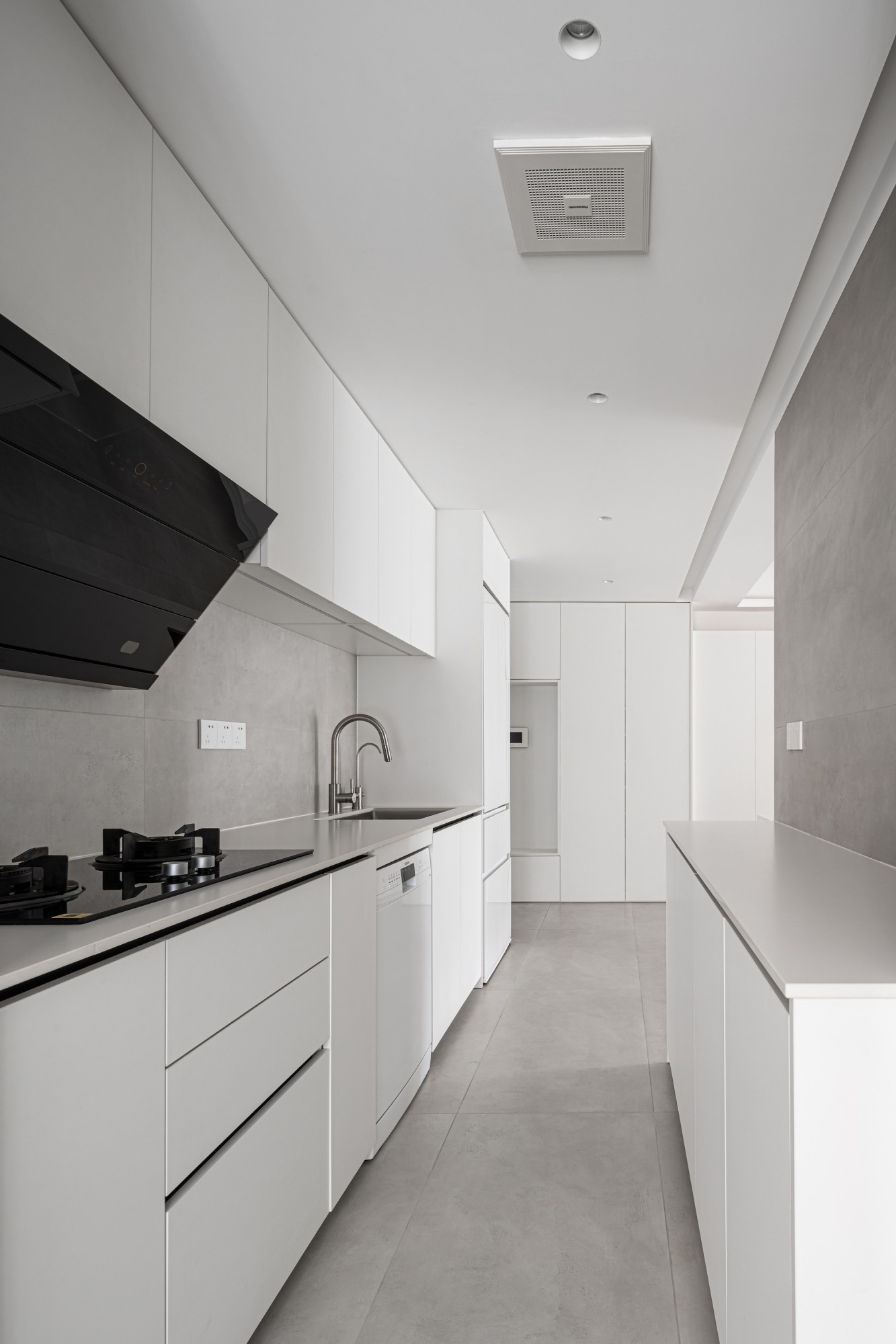 厨房用“全隐柜+无把手”藏起所有烟火气,台面与墙面的同色处理,让操作区干净得像幅极简画;