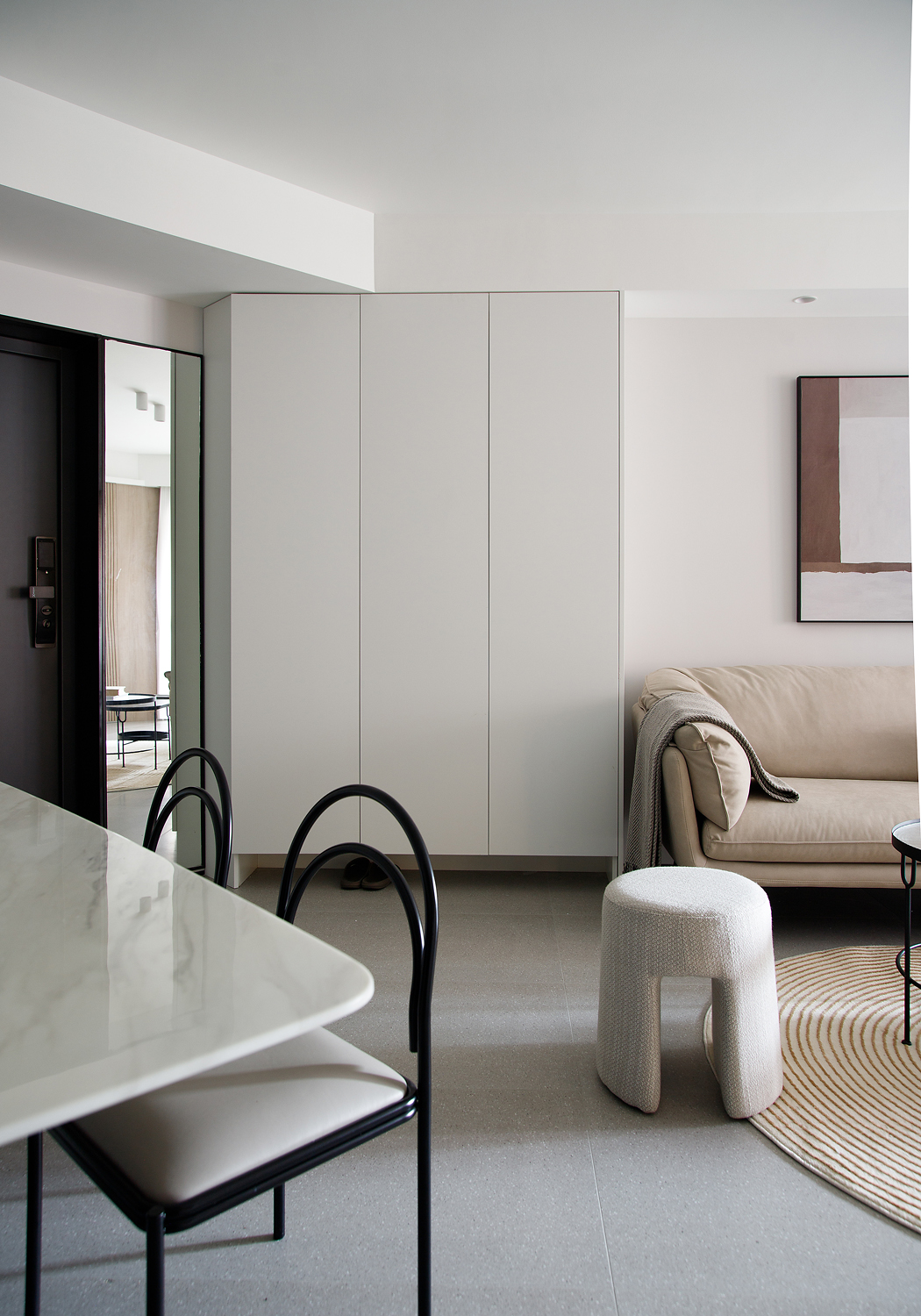 这个家没有“用力的精致”,只有“刚刚好的温柔”:是光脚踩在暖调地砖上的温度,是陷进沙发时的包裹感,是极简里藏着的、触手可及的松弛。