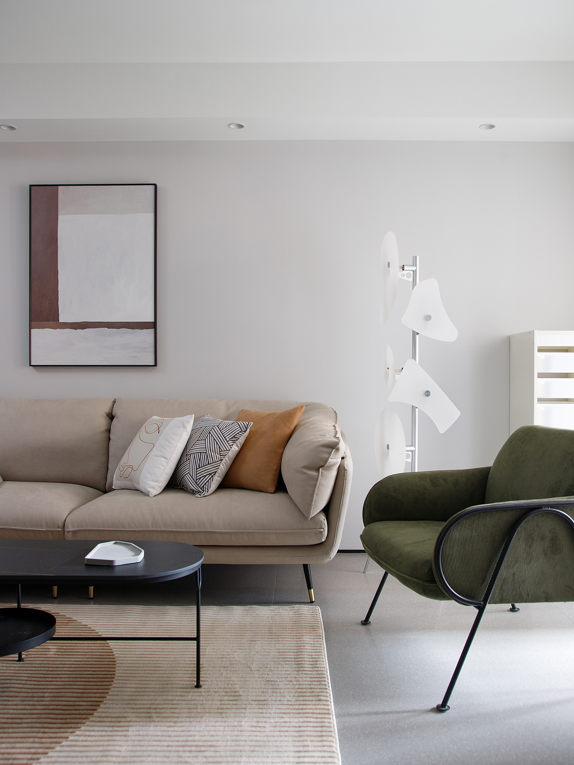 奶杏色沙发像块被晒软的棉花,橄榄绿单人椅是角落里的“小惊喜”,波浪纹地毯踩着像踩在云朵边。