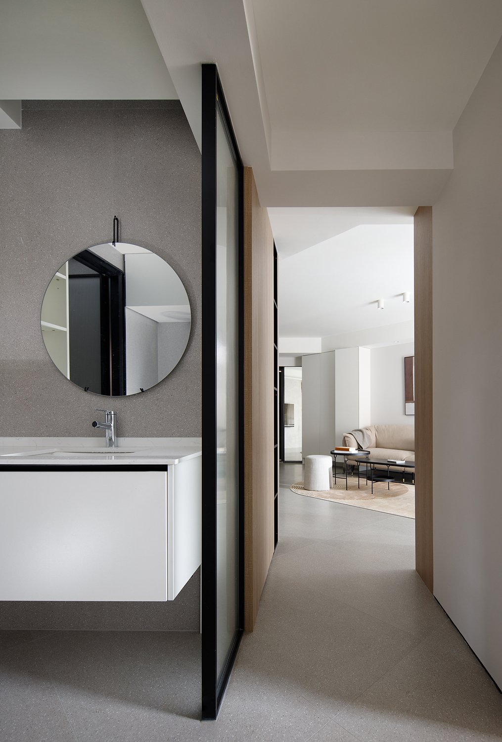 白色台盆+黑色金属边,像块刚切好的“黑白巧克力”,拱形镜的曲线是冷调里的“小温柔”。