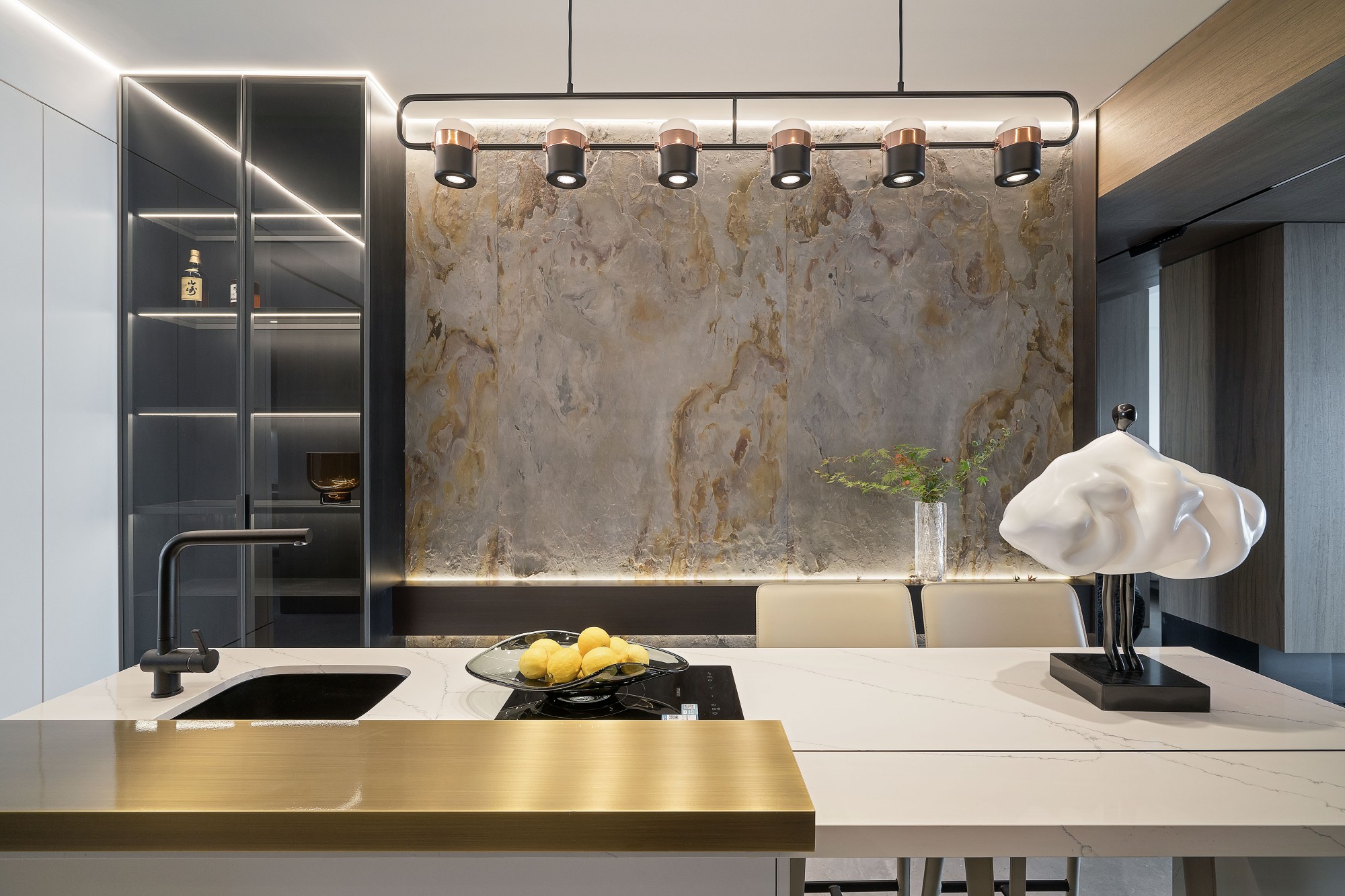 大理石岛台是“烟火与体面”的纽带——一边是铜色灯轨衬着岩板墙的冷调高级,一边是云朵灯、柠檬果盘的软萌;