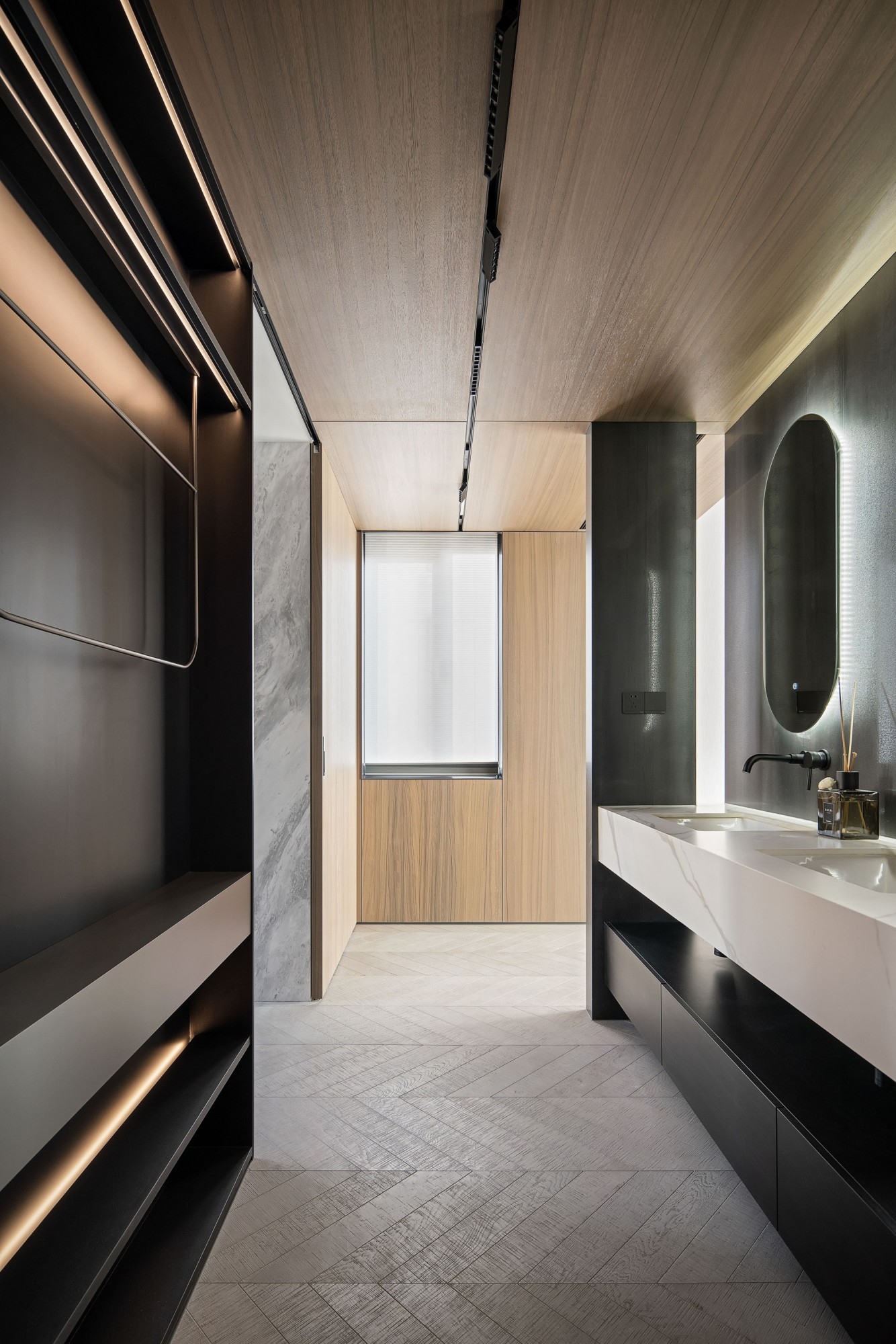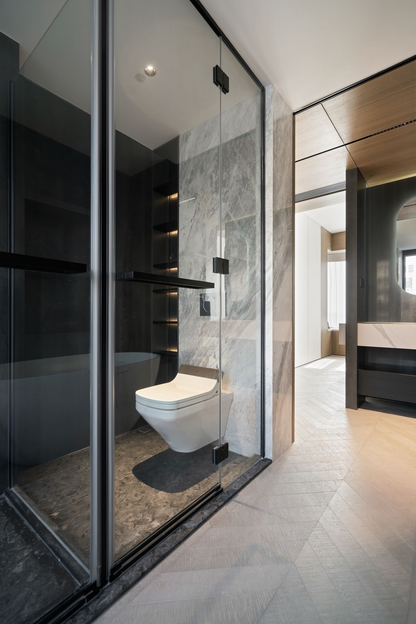 玻璃隔断让空间“隔而不闷”,石纹砖的冷与木饰面的暖撞出质感,连五金件都藏着“不抢镜的精致”——哪怕是清晨赶时间,也能在利落的空间里,找到不慌不忙的节奏。