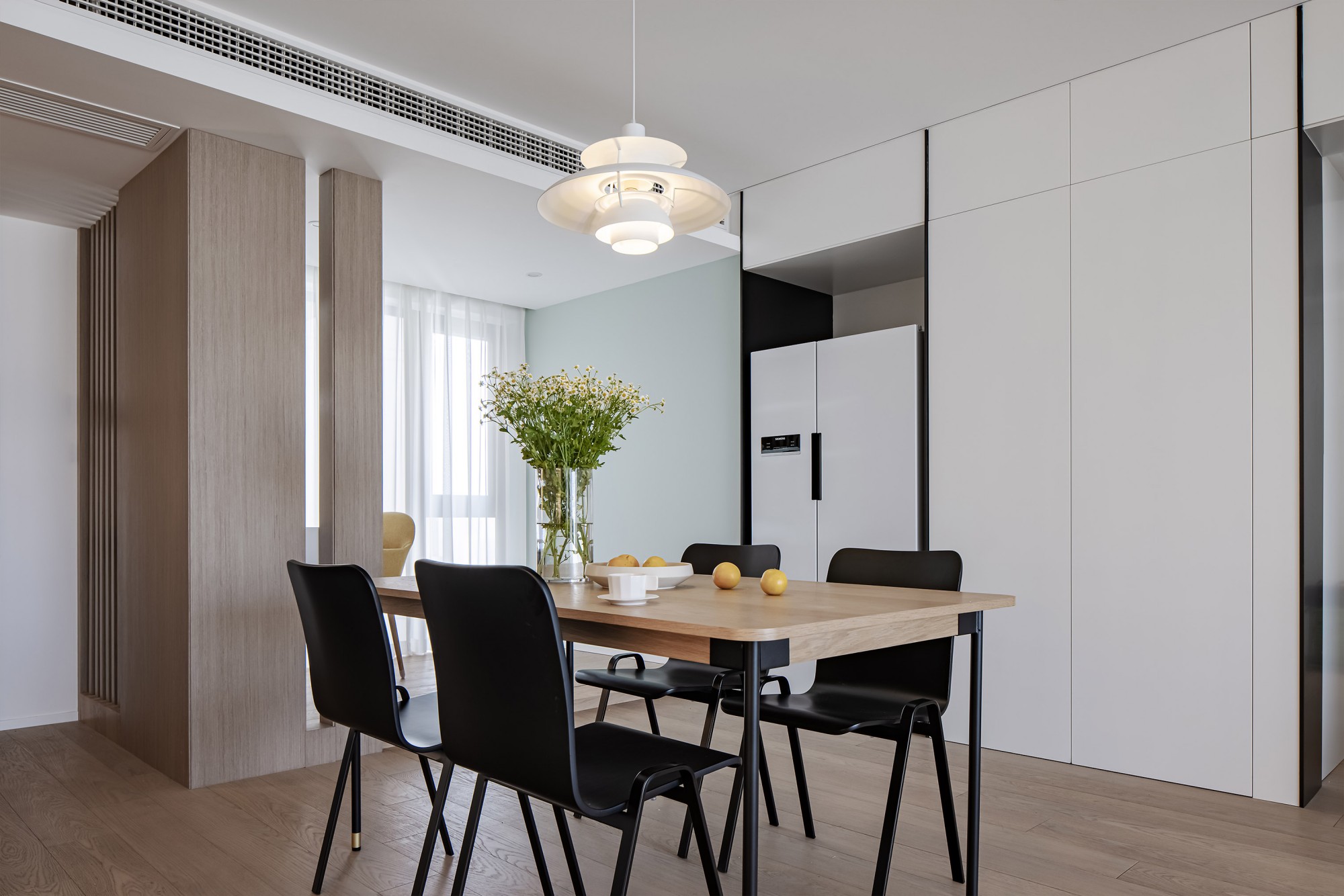 餐边柜藏起锅碗瓢盆,留个开放格摆束小雏菊,连冰箱都“隐身”在柜面里——好看和实用,原来不用二选一。