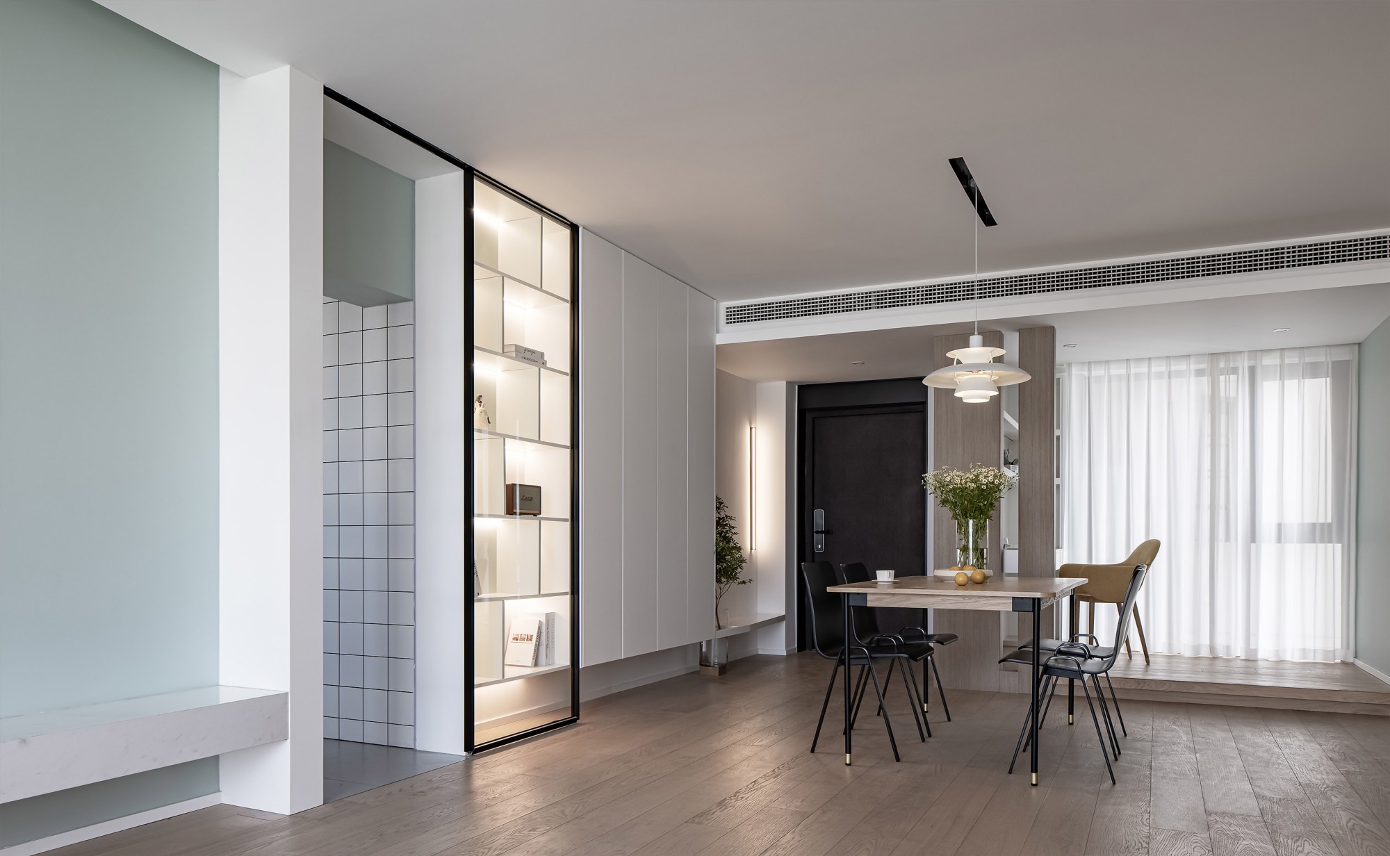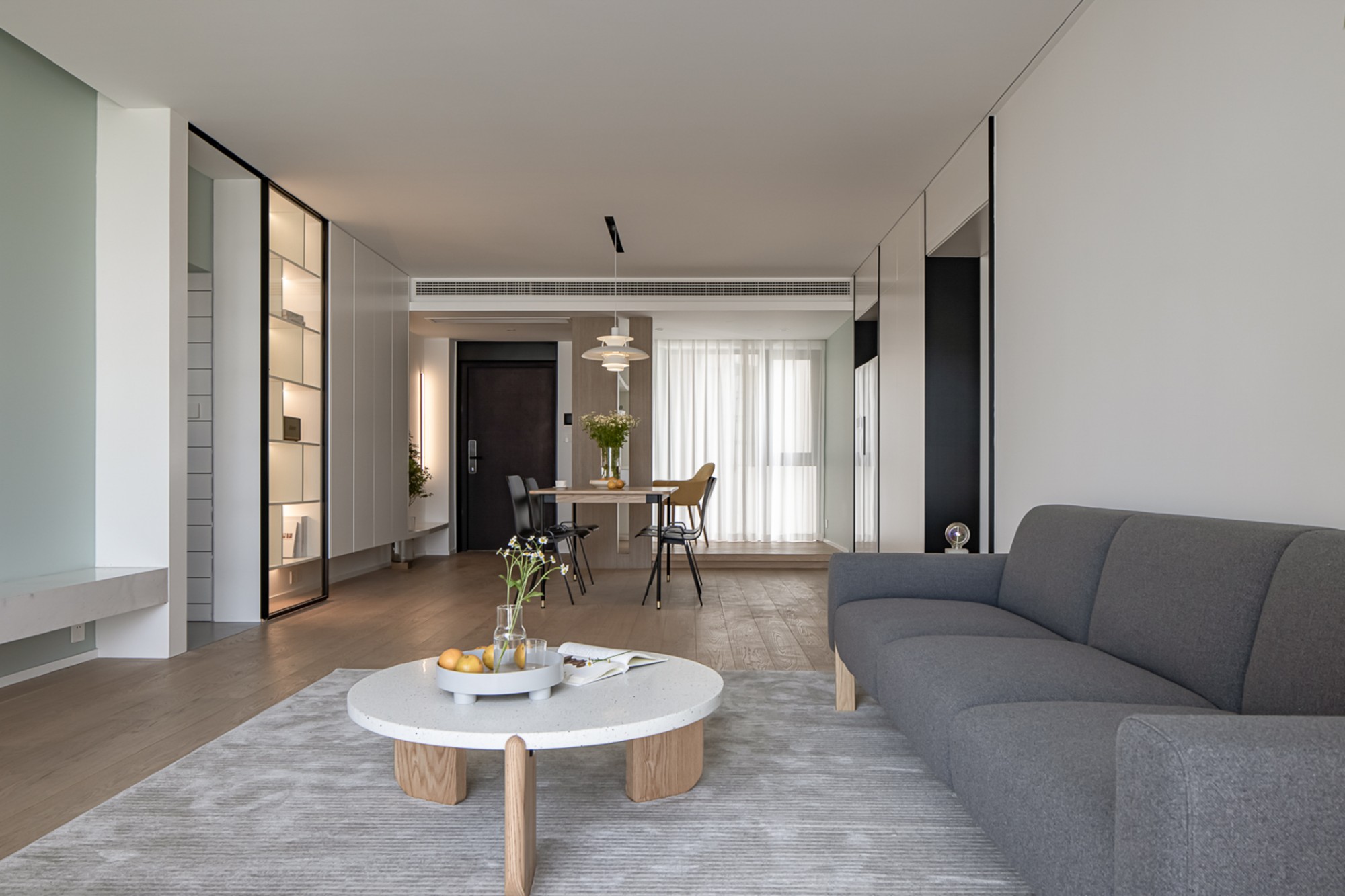 黑白灰里掺了点原木暖调,长桌+皮质椅是“日常吃饭”和“朋友小聚”的中间解。