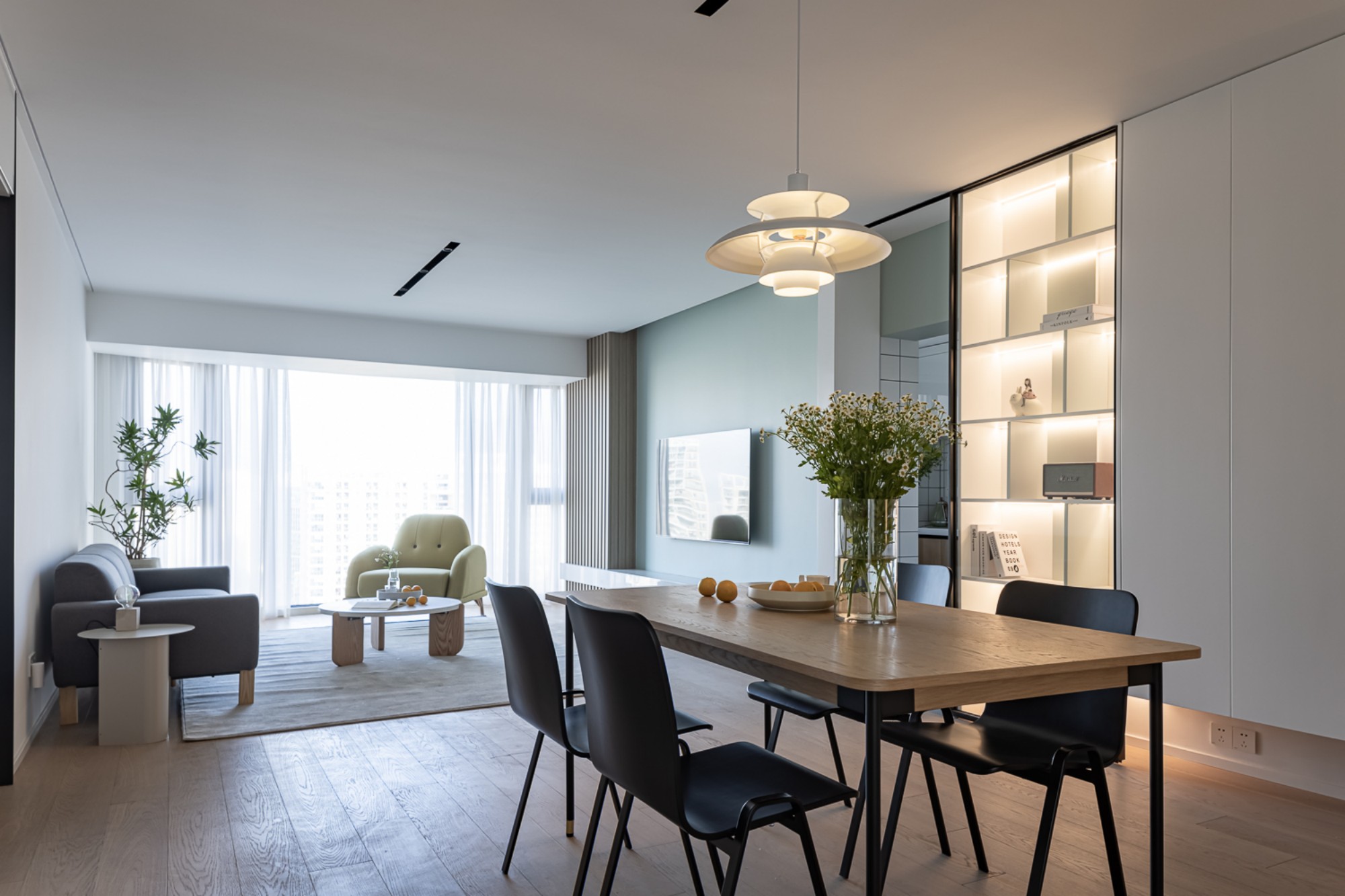 无主灯+悬浮电视柜灯带,白天借落地窗把城市景框成画,晚上暖光一落,窝在沙发里追剧就像裹进云朵里。
