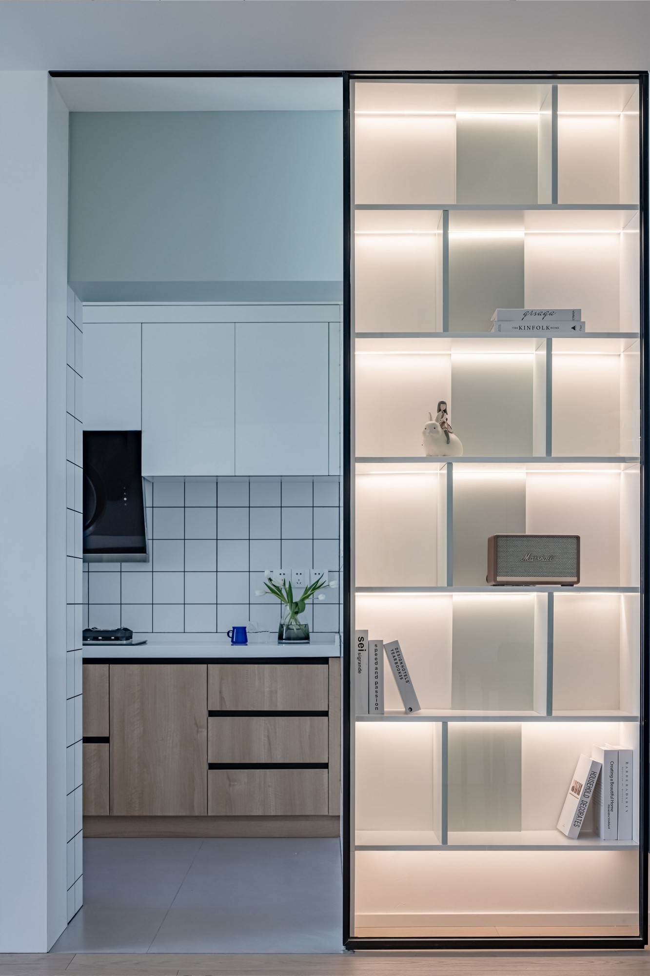 旁边的玻璃隔层摆了书和香薰,做饭时抬眼就是温柔,连油烟都像轻了半分。