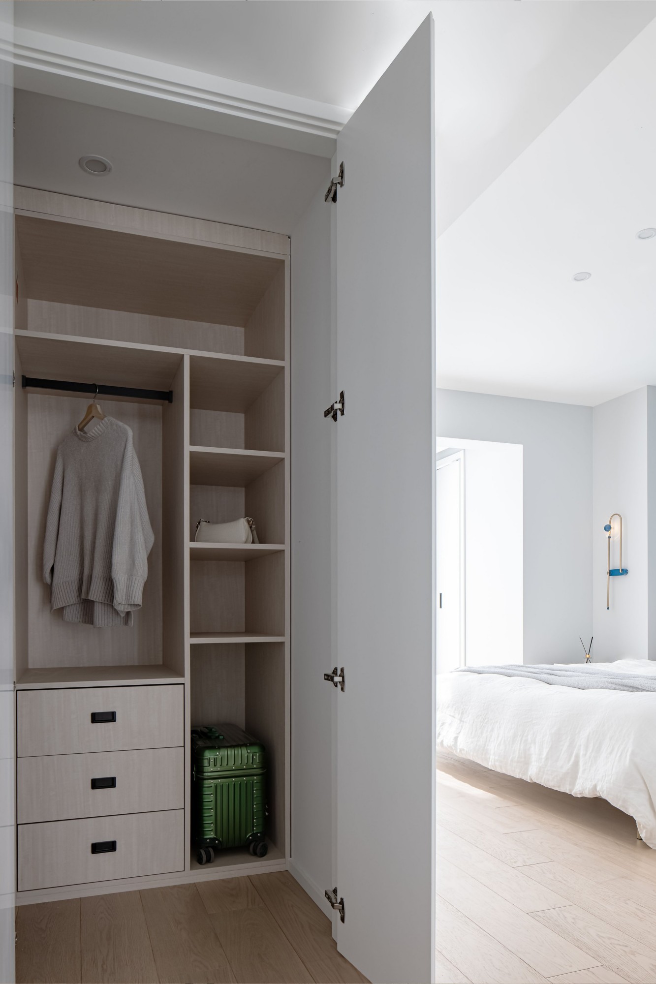 雾霾蓝墙面像睡前的一杯温牛奶,软包床头、褶皱床品裹着蓬松的安全感,壁灯的光揉在窗帘里,连梦都是轻的。