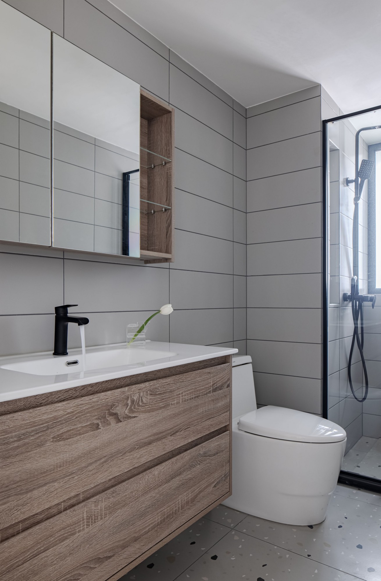 浅灰大砖拉满高级感,悬浮柜+黑龙头是“冷调里的暖意”,花洒的水落在瓷砖上,连独处的时间都变得安静又舒展。