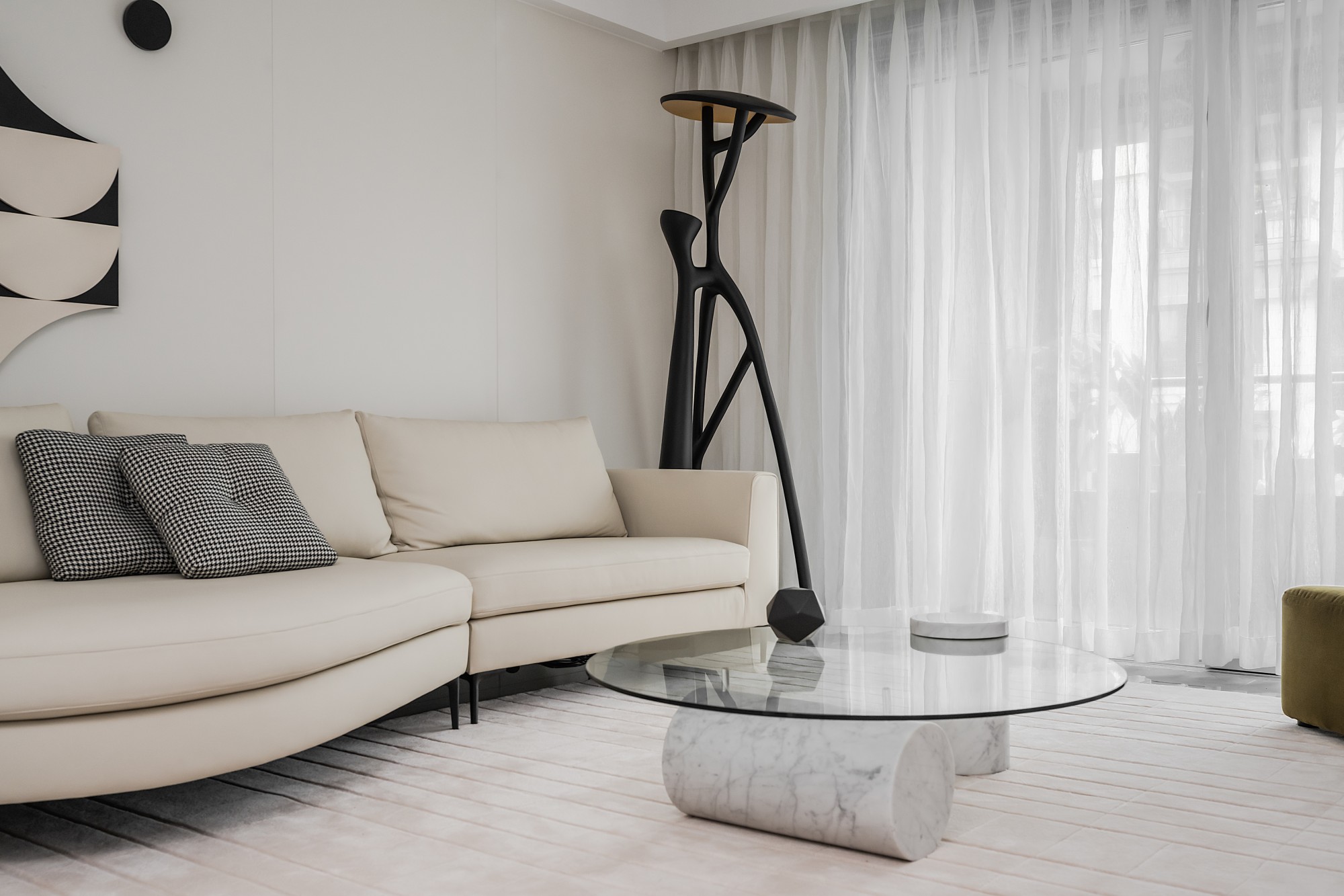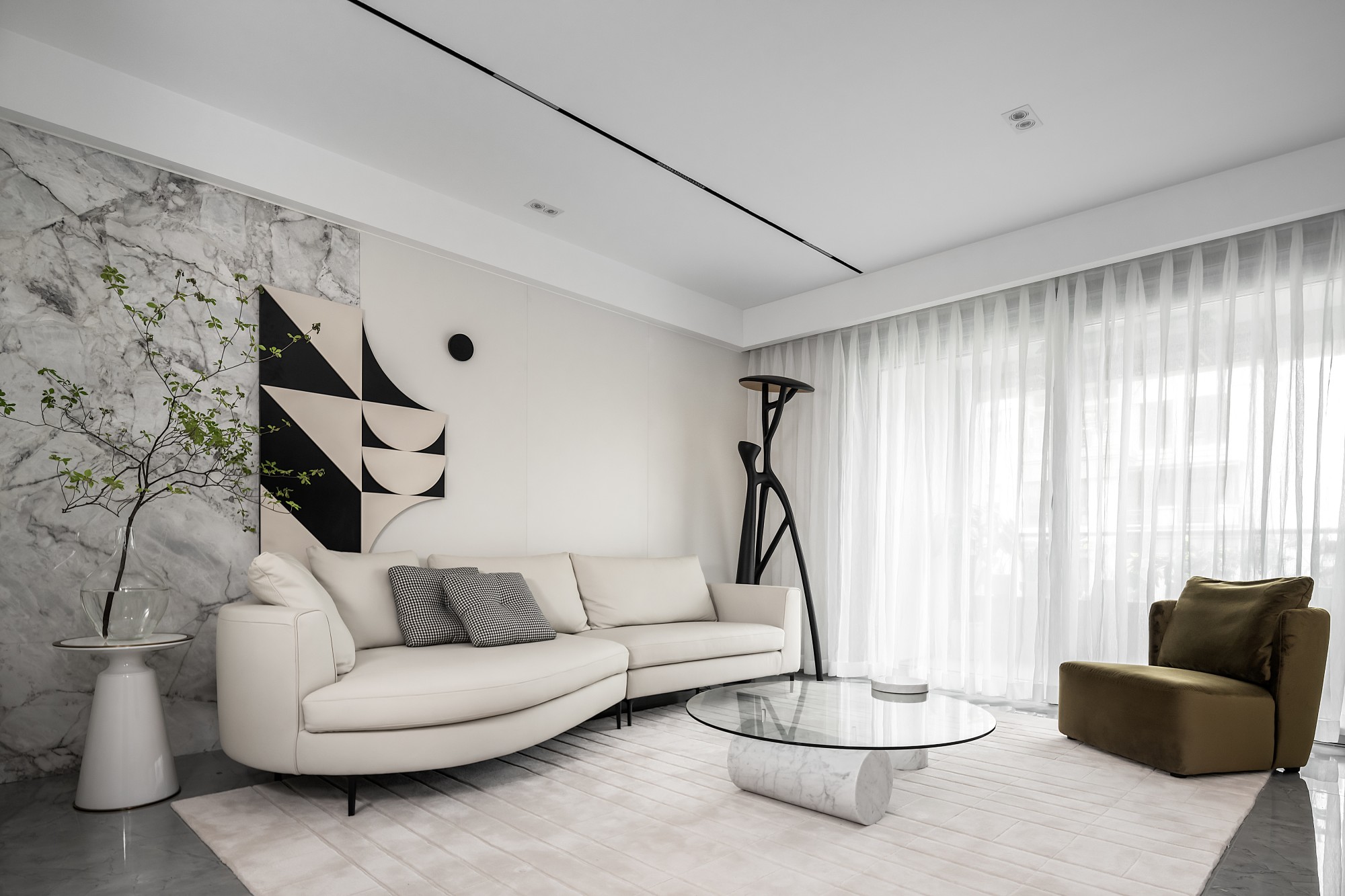 弧形米白沙发自带慵懒松弛感,搭配千鸟格抱枕,在纯色基底里添了复古细节;背景墙一半是大理石纹理的冷调高级,一半是奶白护墙板的柔和,中间的几何装饰画用黑/米色块打破单调,又和沙发抱枕形成呼应。