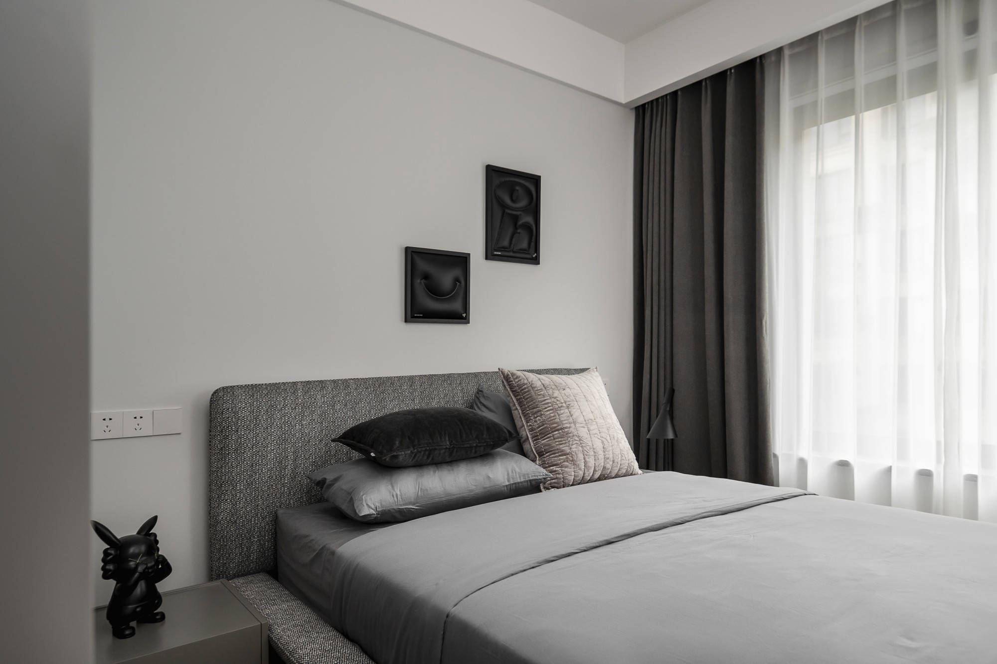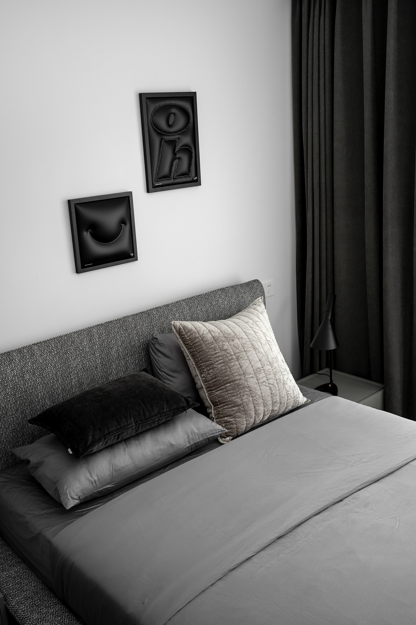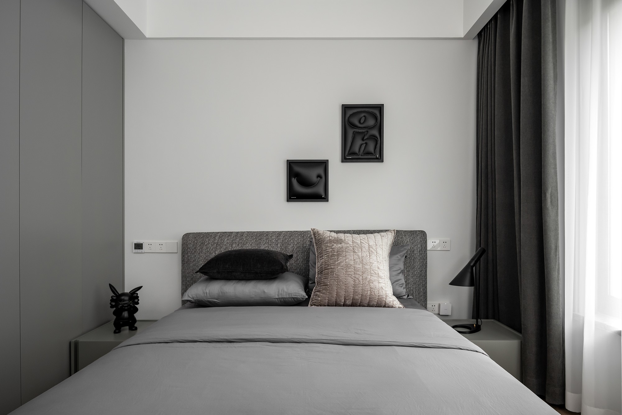 浅灰床品+深灰绒面抱枕,搭配肌理感床头,用同色系的不同材质制造层次;墙面的黑色抽象装饰画,是冷调里的艺术锐度,又和深灰窗帘形成呼应。