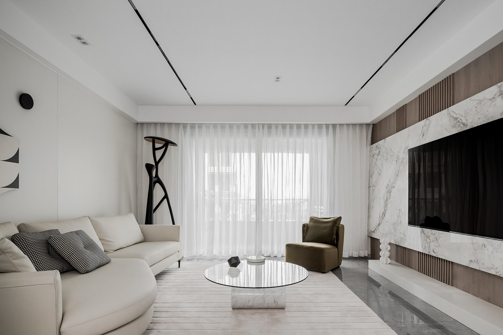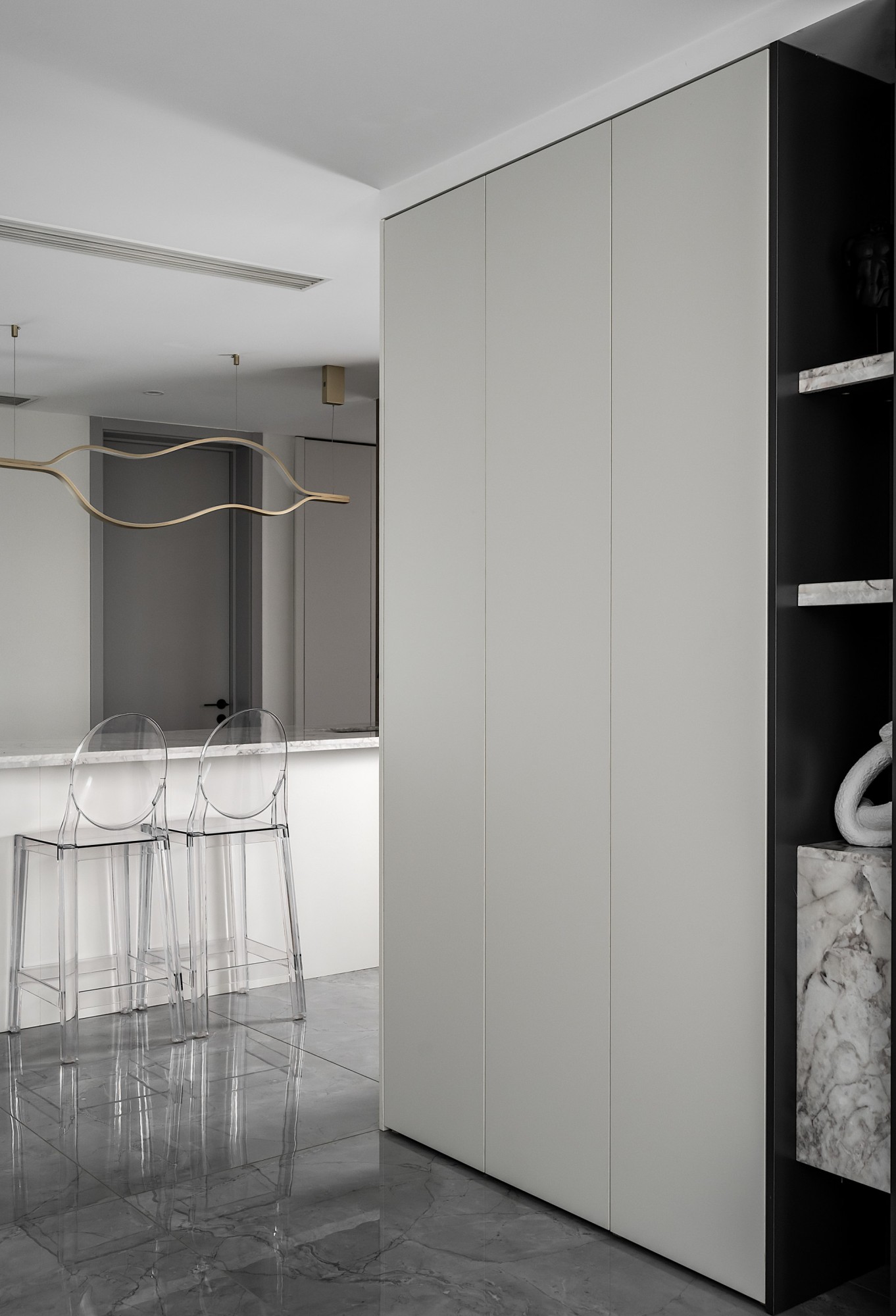 这套住宅是现代极简与轻奢质感的融合设计,从公共空间到私密卧室,每个区域都用细节营造出高级且松弛的氛围: