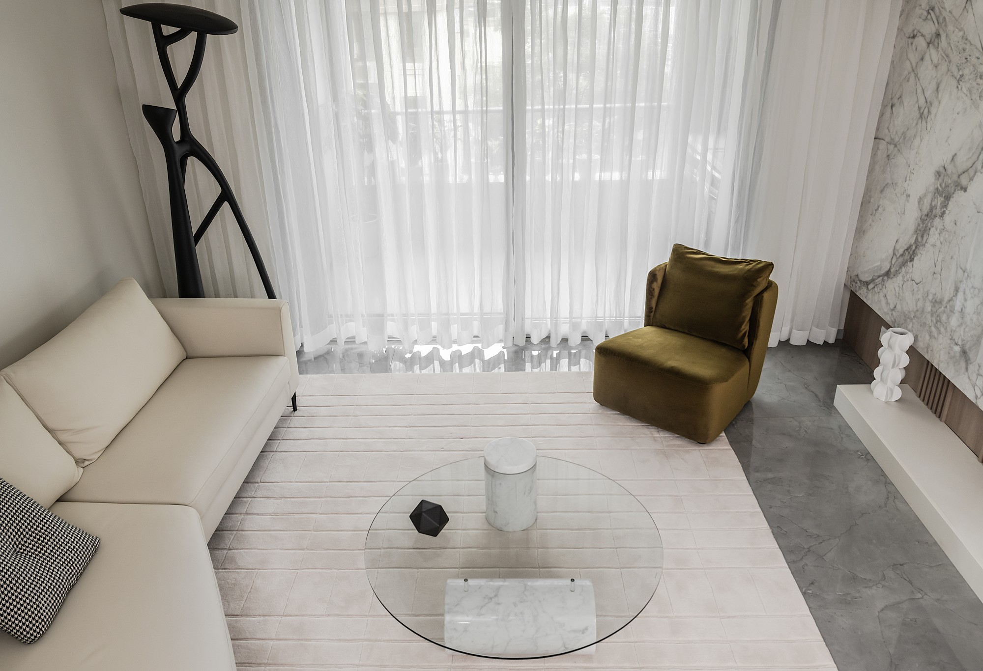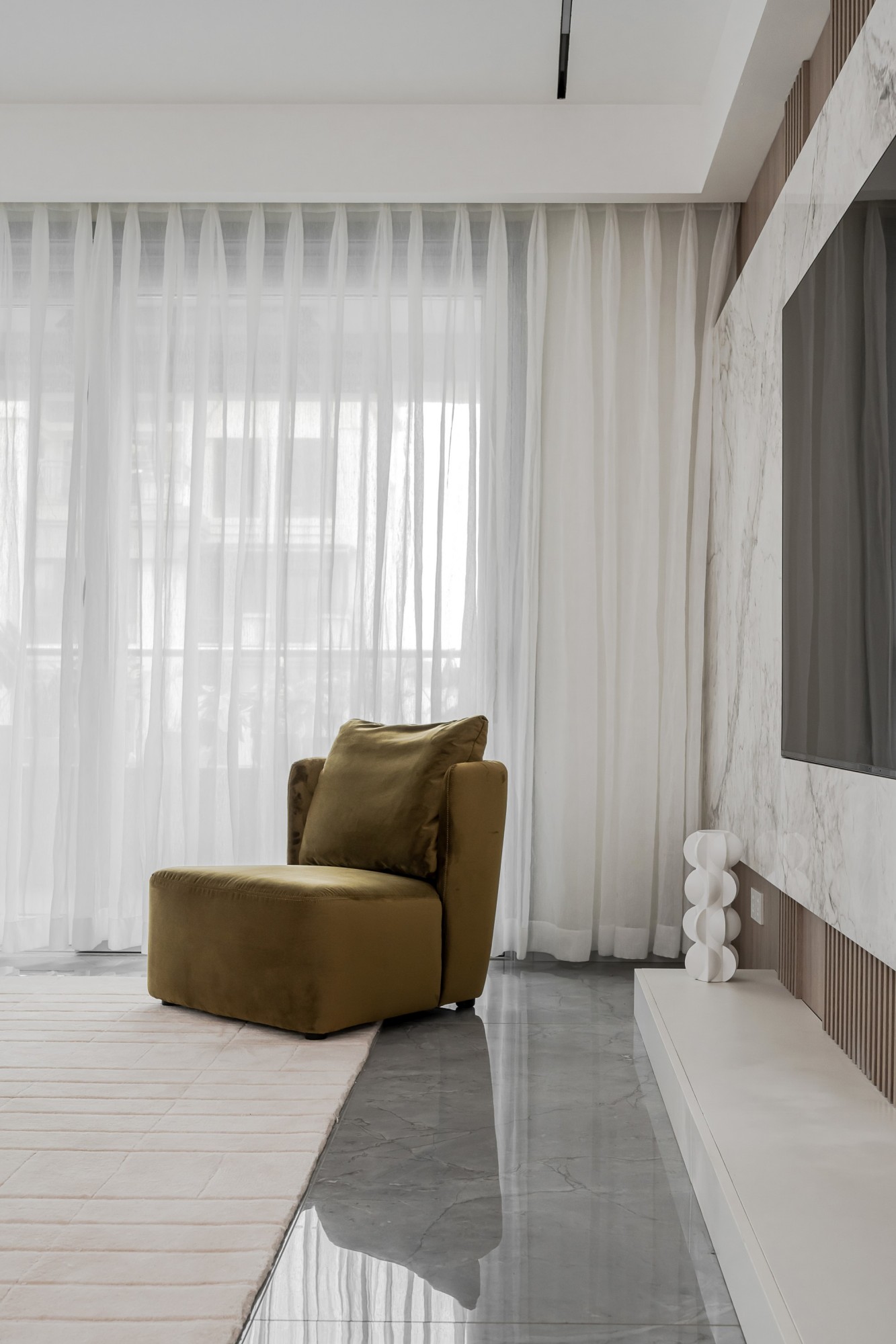玻璃圆茶几+大理石底座的组合,把“轻”与“奢”平衡得刚好;旁边的橄榄绿单人椅是点睛的暖调,配上造型感十足的黑色落地灯,让空间在极简里多了艺术张力。