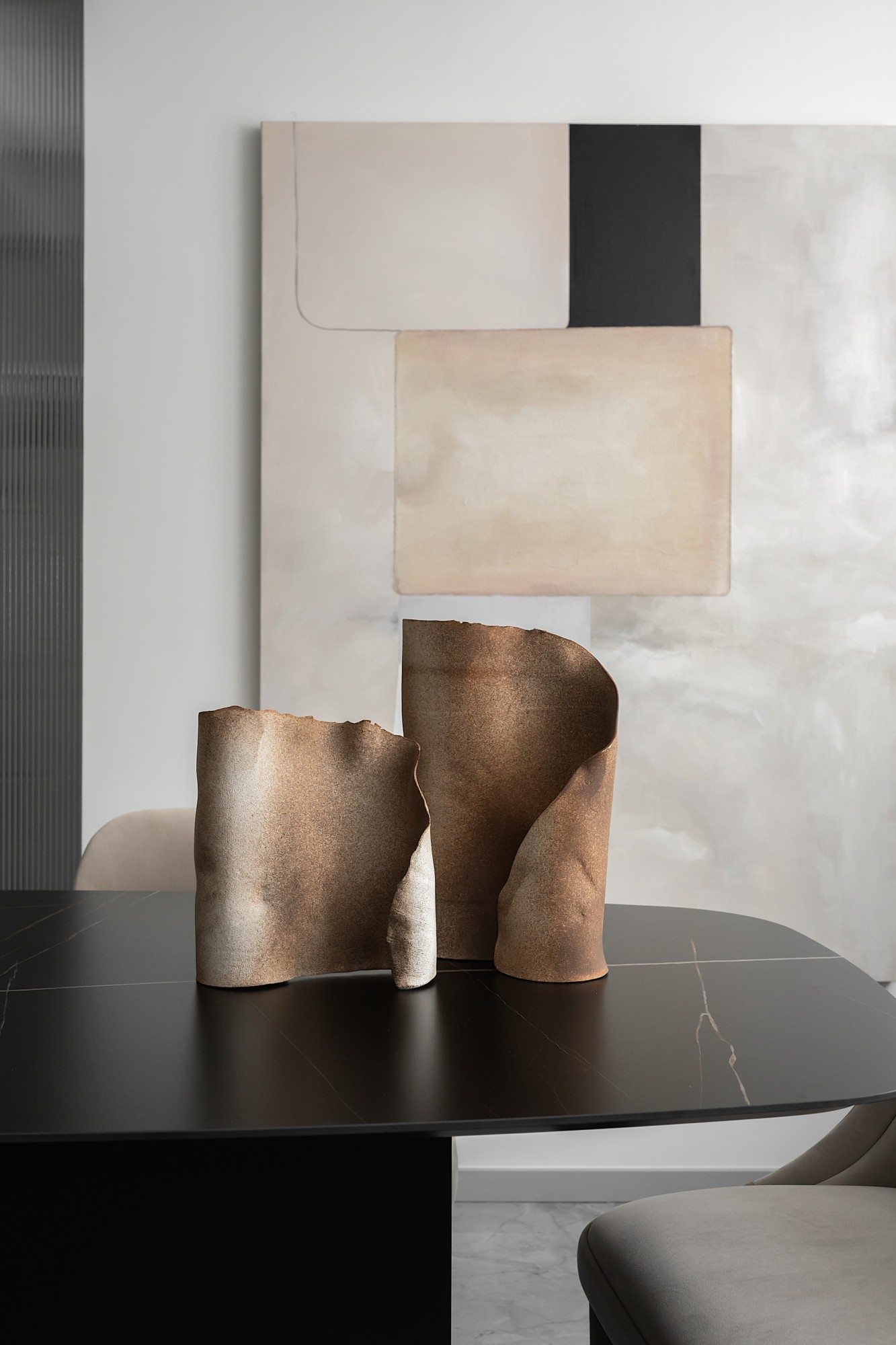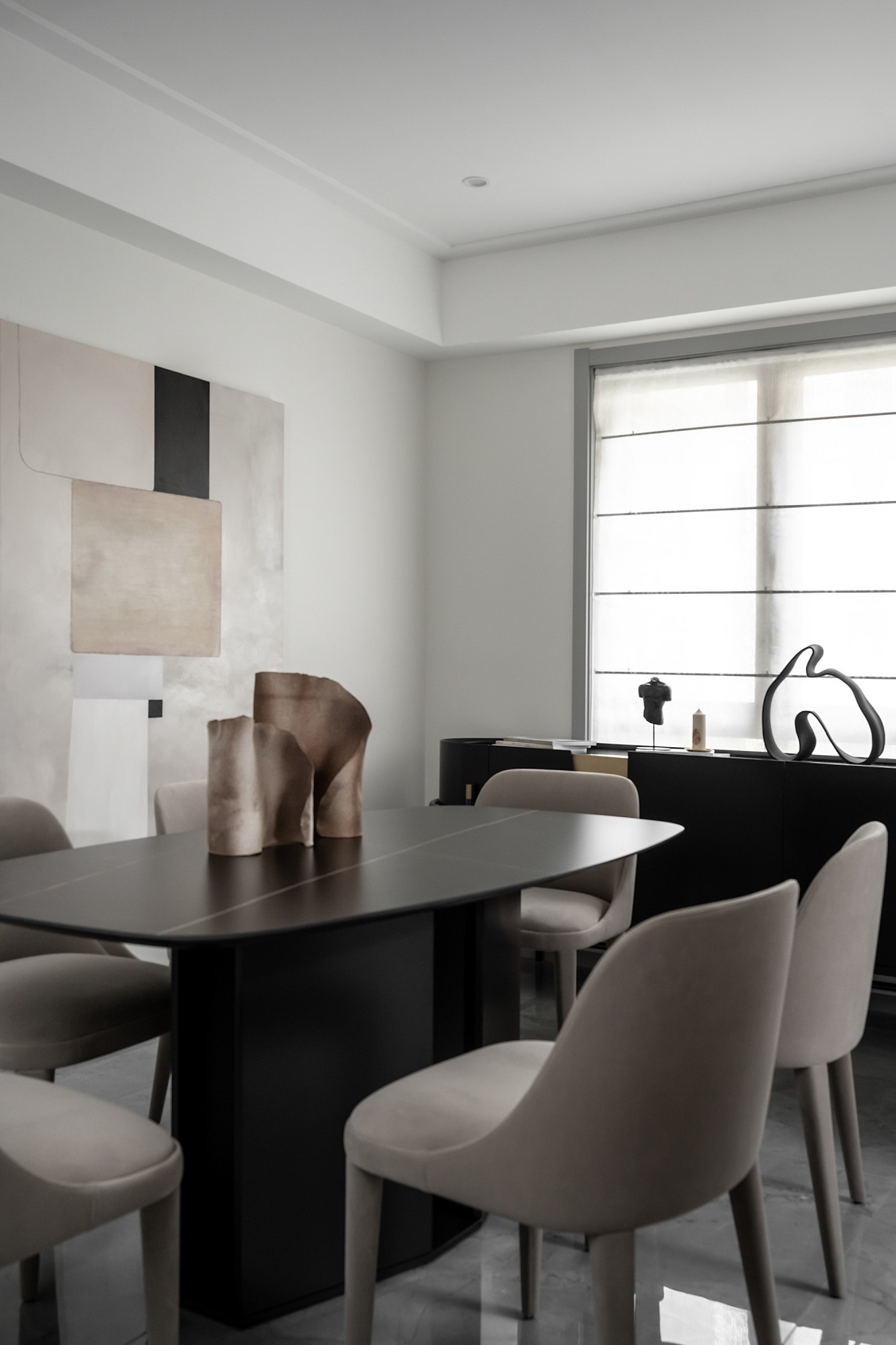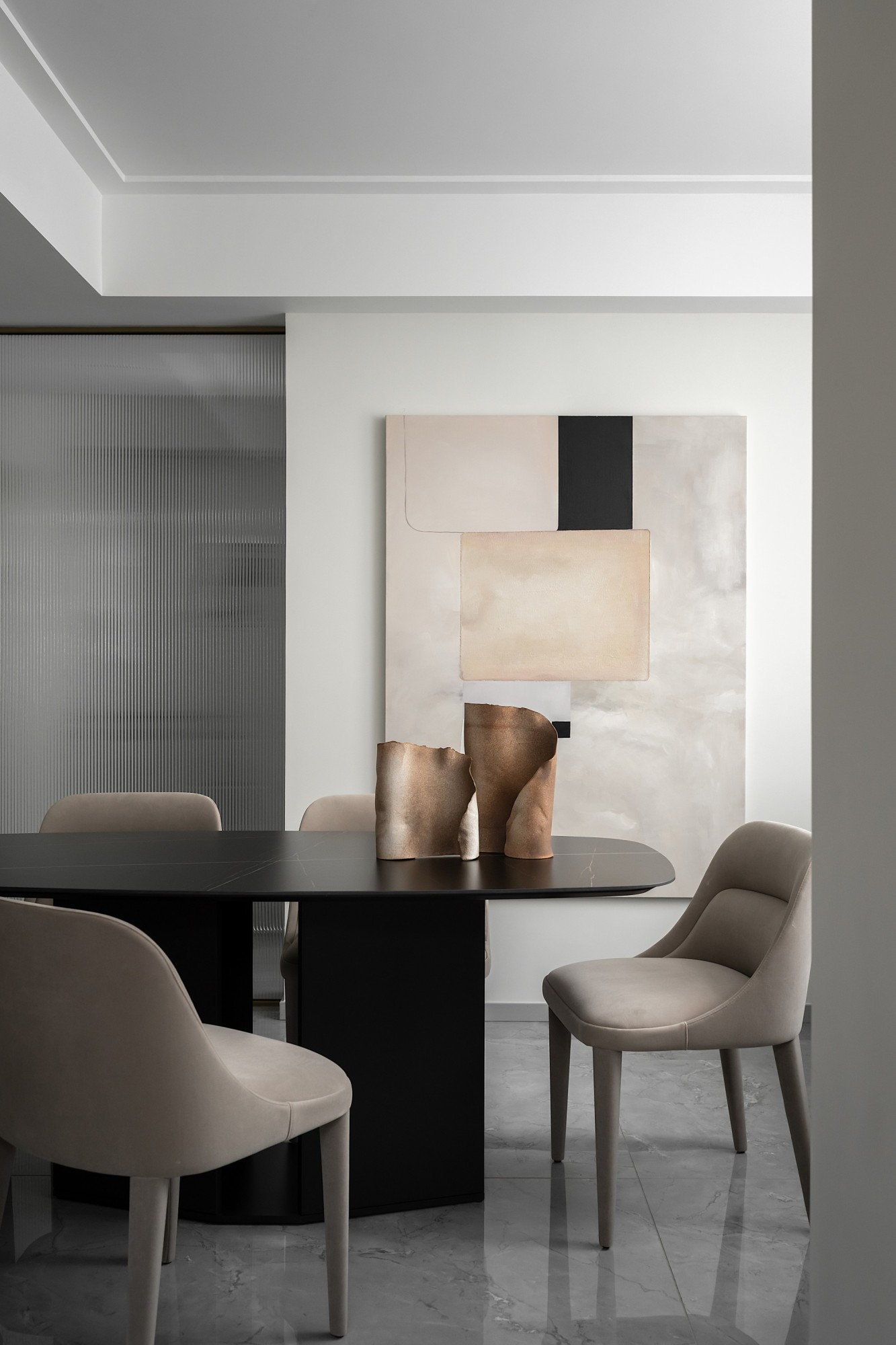 深色餐桌和浅米色餐椅形成明暗对比,餐椅的弧形靠背又柔化了深色的厚重感;墙面的拼贴装饰画,用不同肌理的米/灰/黑块,和餐桌的色调无缝衔接。
