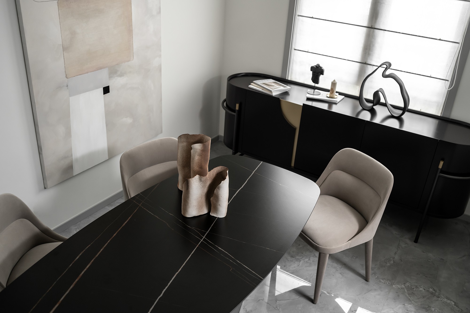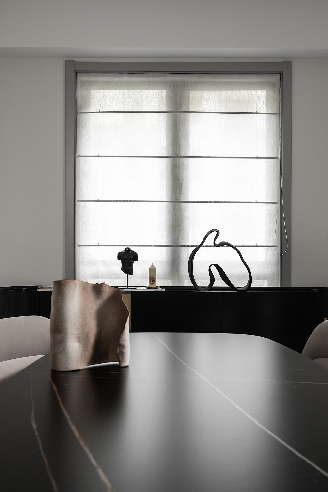 窗边的黑色曲线摆件、金属烛台,是小而精的轻奢点缀,百叶窗透进来的柔光,让整个用餐区既冷静又有温度。