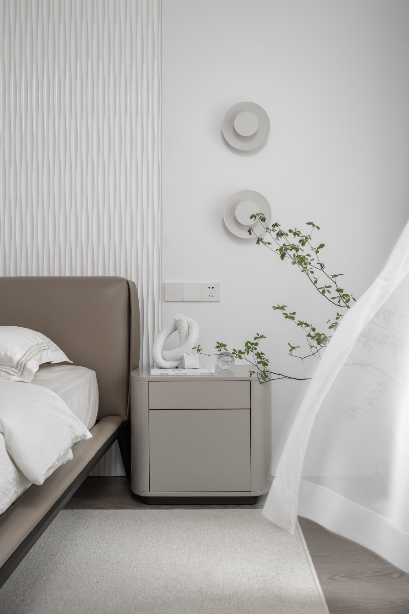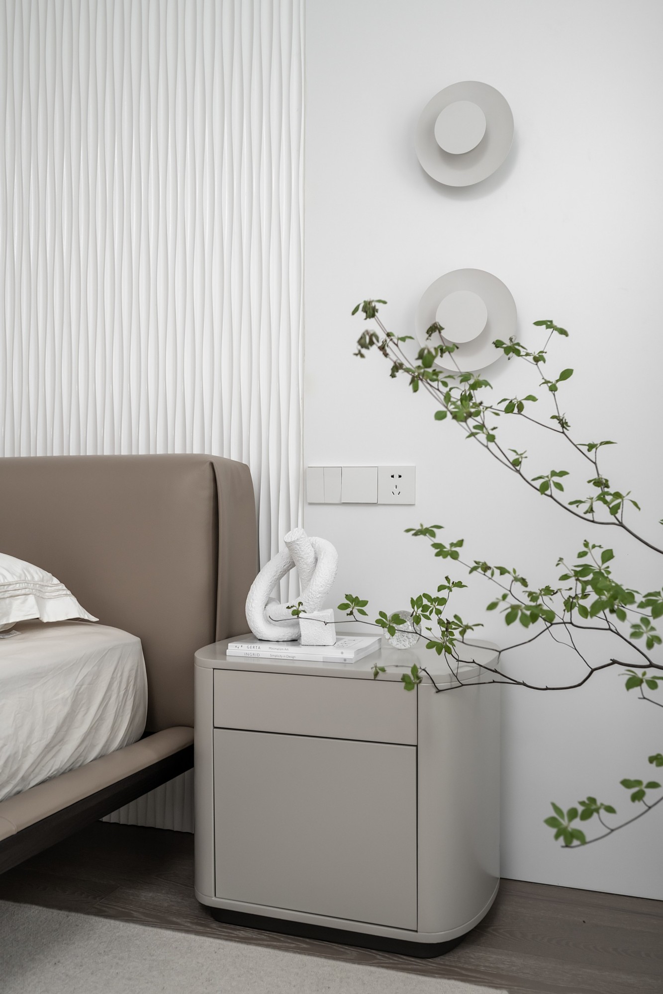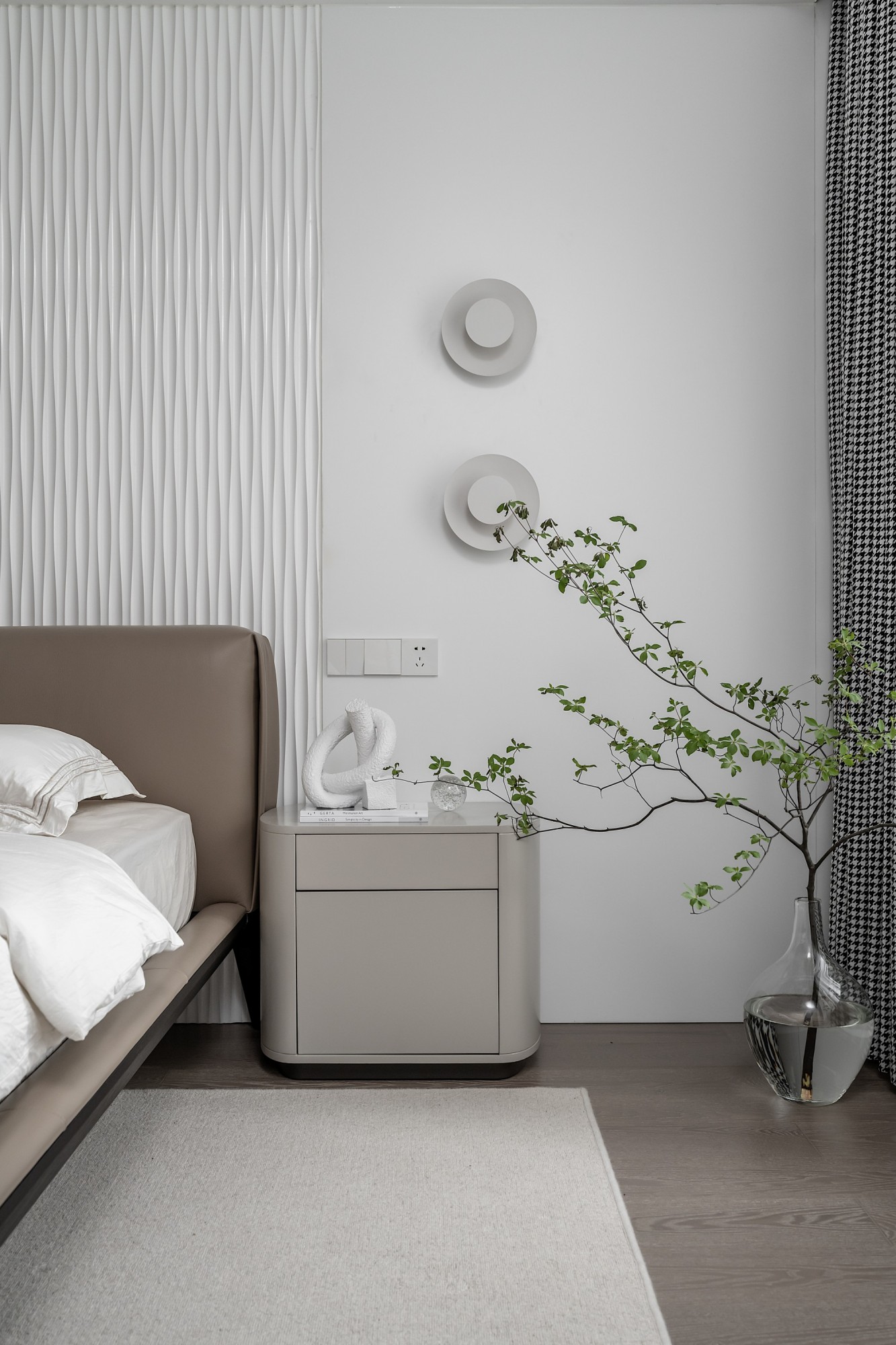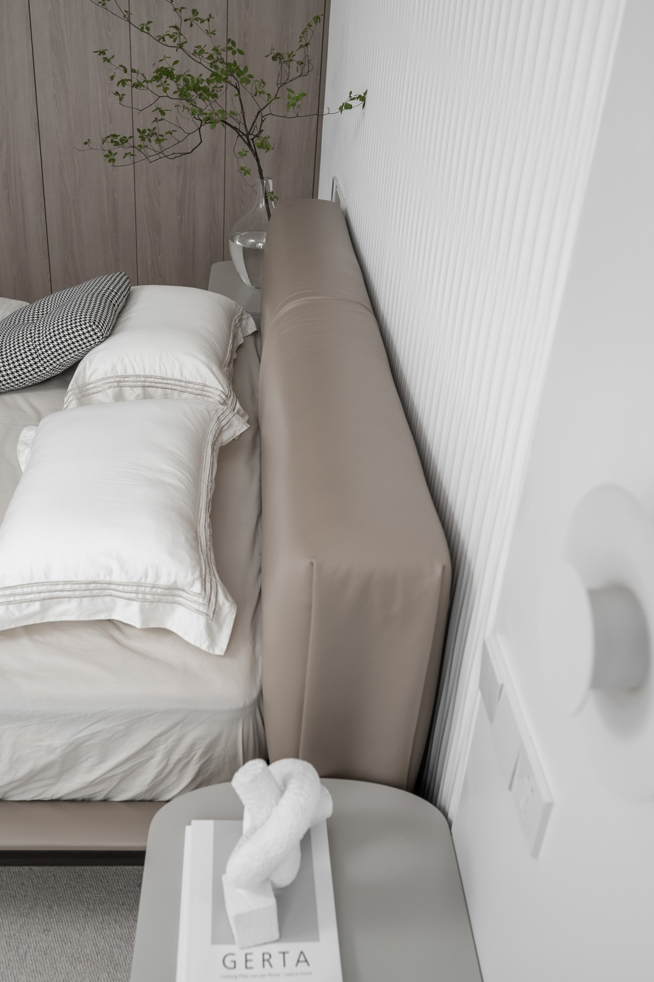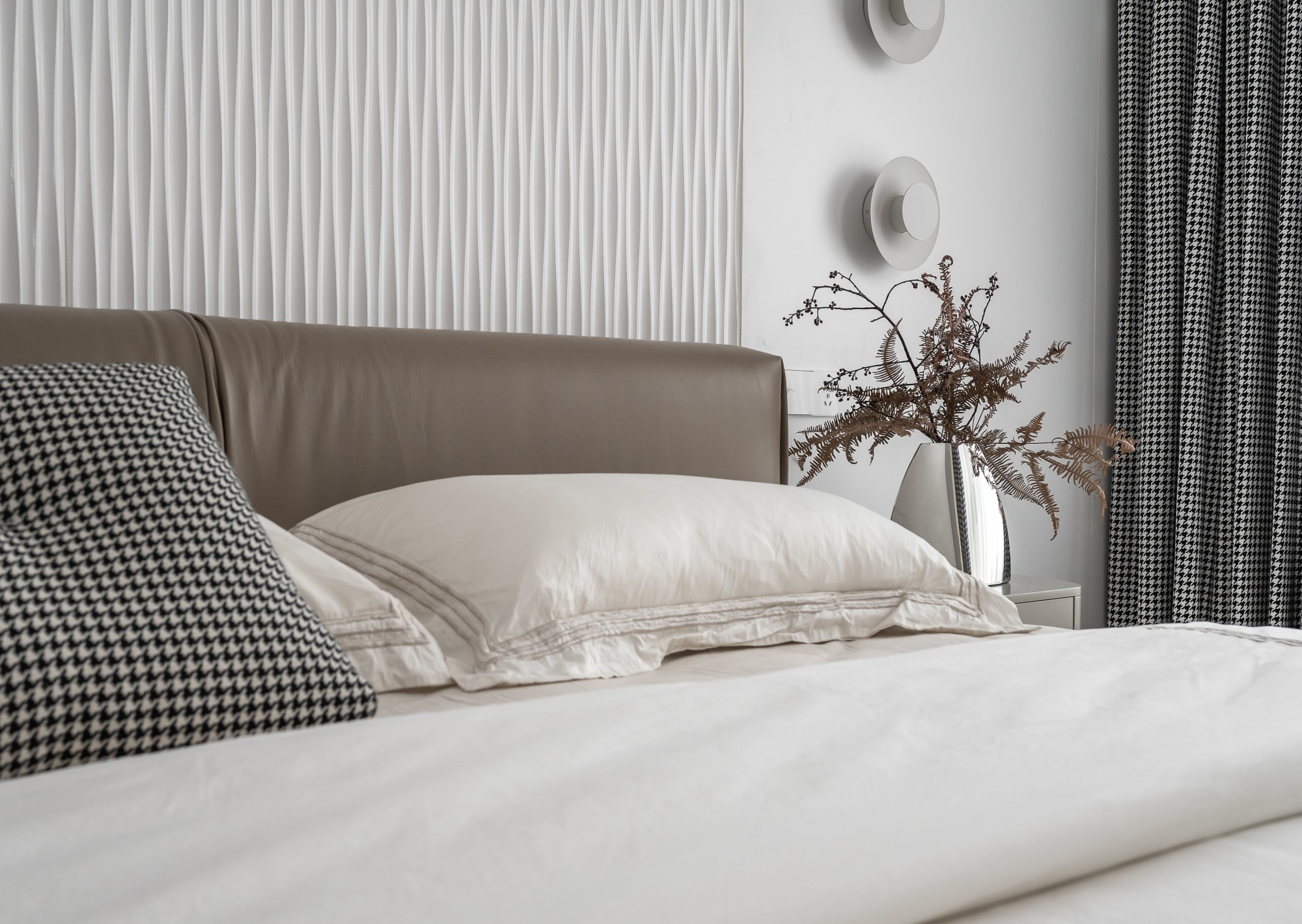 背景墙的竖纹肌理板,让纯白空间有了细腻的层次变化;深棕色皮质床头带着低调的奢华感,千鸟格抱枕再次呼应客厅元素,让空间风格更统一。