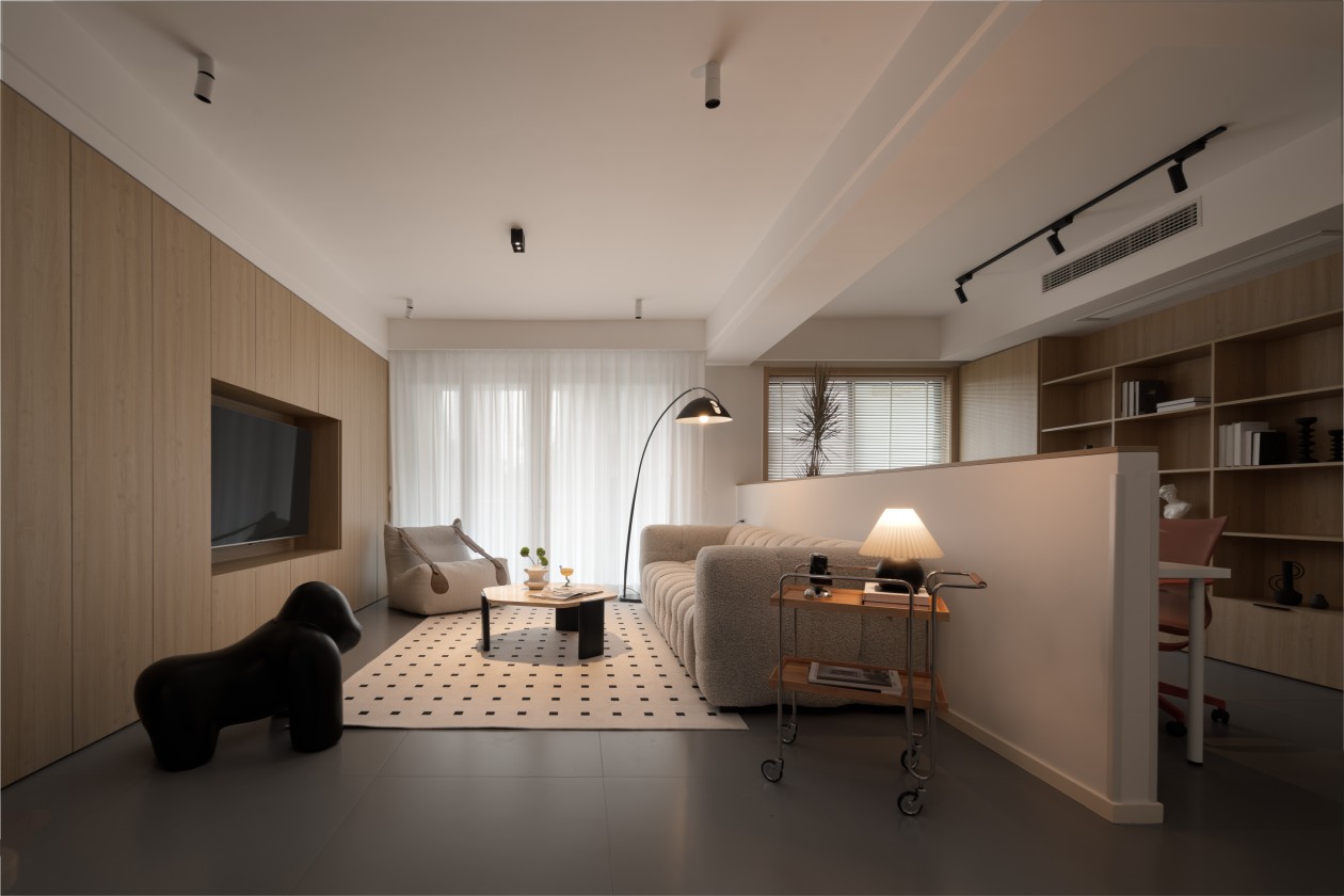 整面浅木色柜体藏起电视和杂物,把空间衬得温暖又整洁;米灰色沙发带着软乎乎的褶皱肌理,配上黑白波点地毯,在柔和里添了点俏皮。
