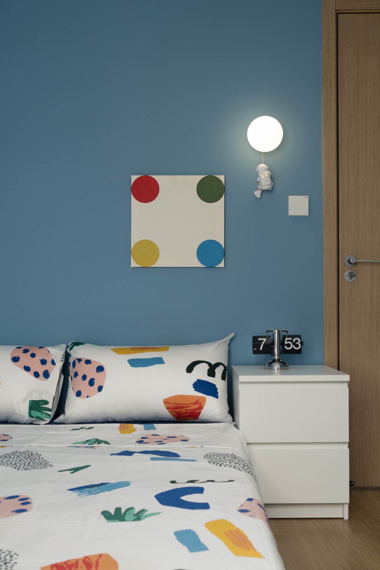 雾霾蓝墙面是清爽的底色,配上彩色波点画和涂鸦床品,像把“打翻的调色盘”搬进了房间;宇航员小摆件挂在壁灯旁,偷偷藏着孩子气的浪漫。