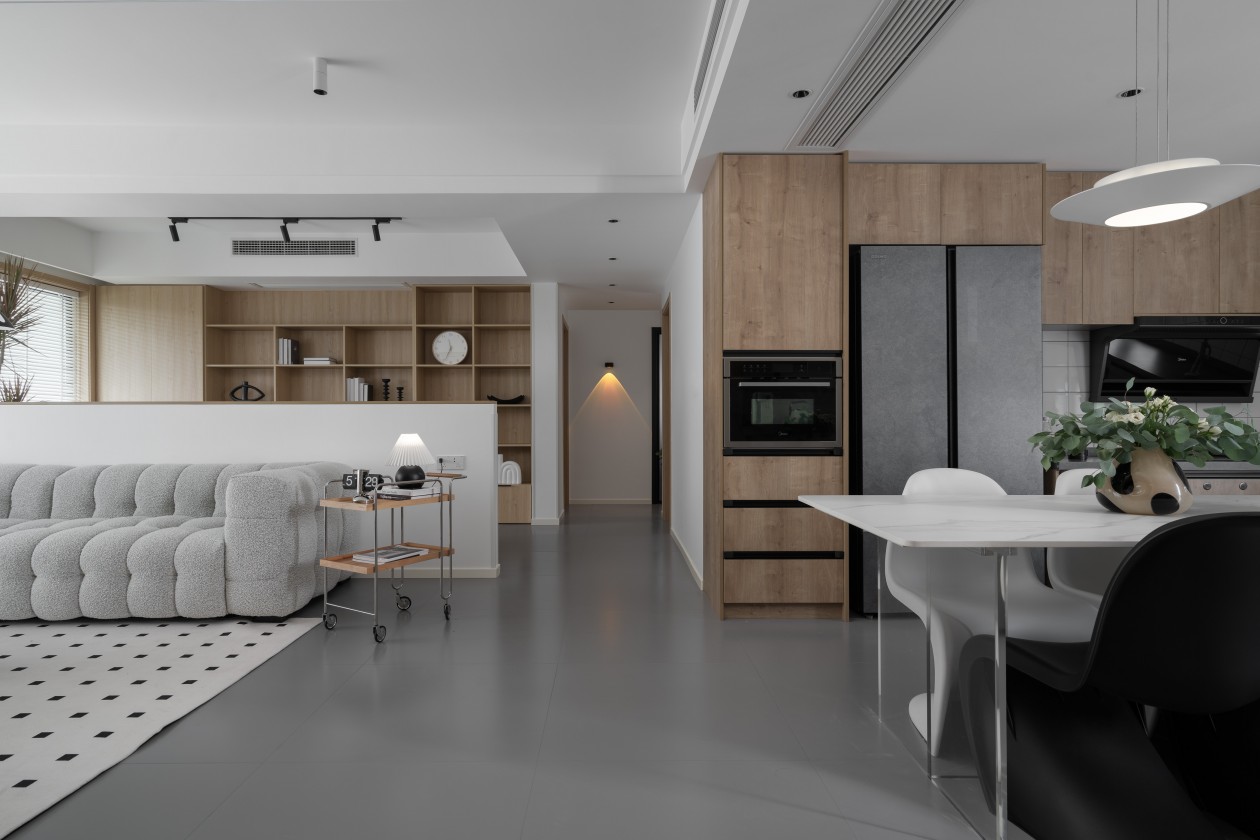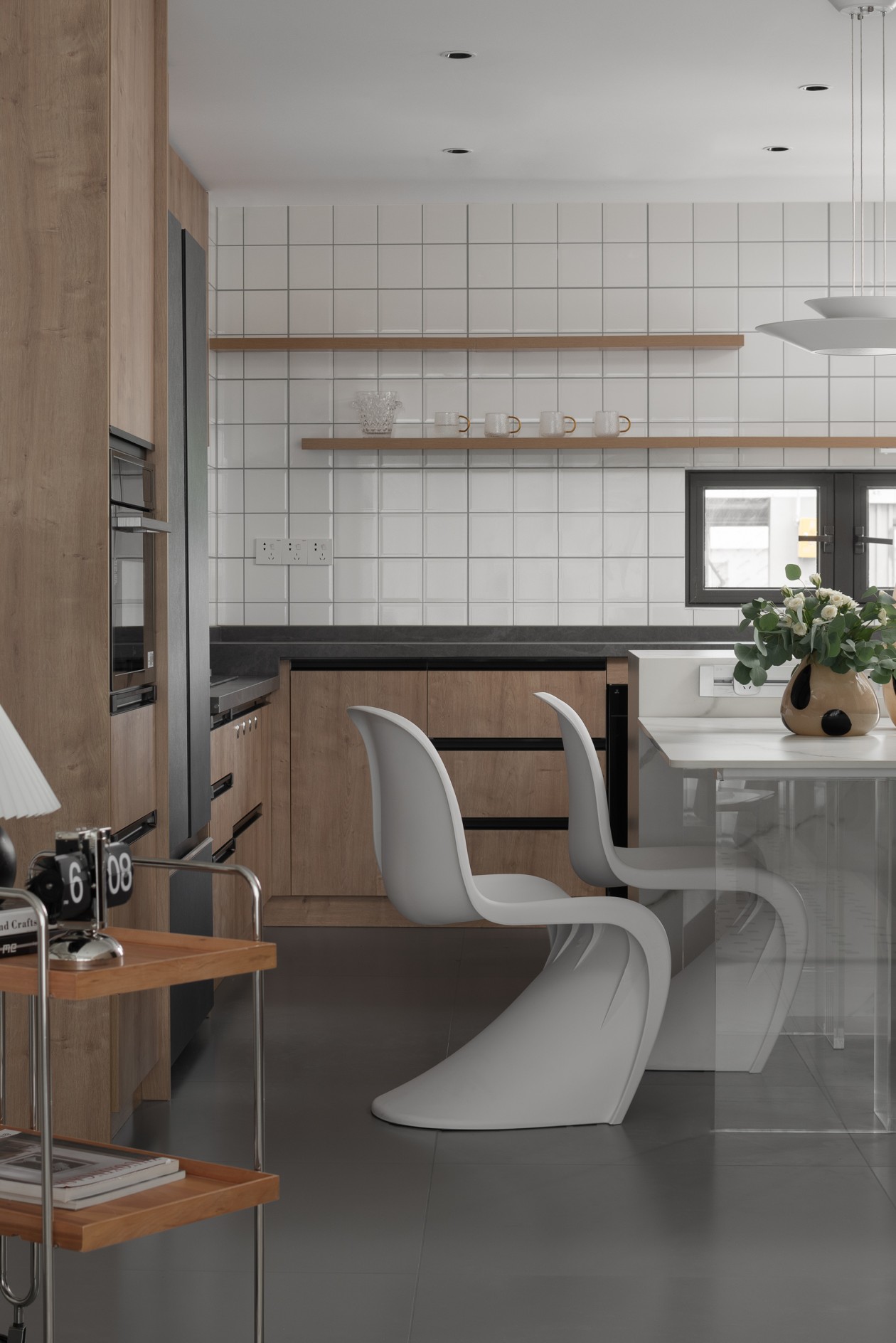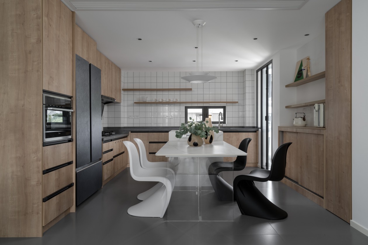浅木柜+白瓷砖的基底干净清爽,透明餐桌+黑白一体成型椅,用“轻透感”消解了空间的紧凑感。