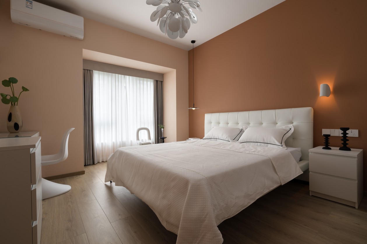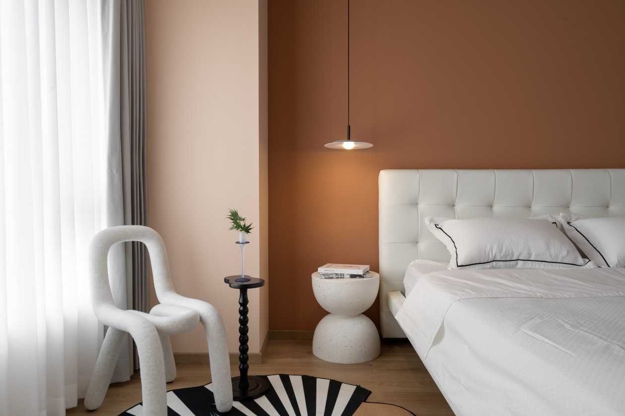暖棕色墙面像裹了层焦糖,和白色软包床头、床品形成温柔撞色;球形壁灯的暖光一透,连空气都变得软乎乎的。