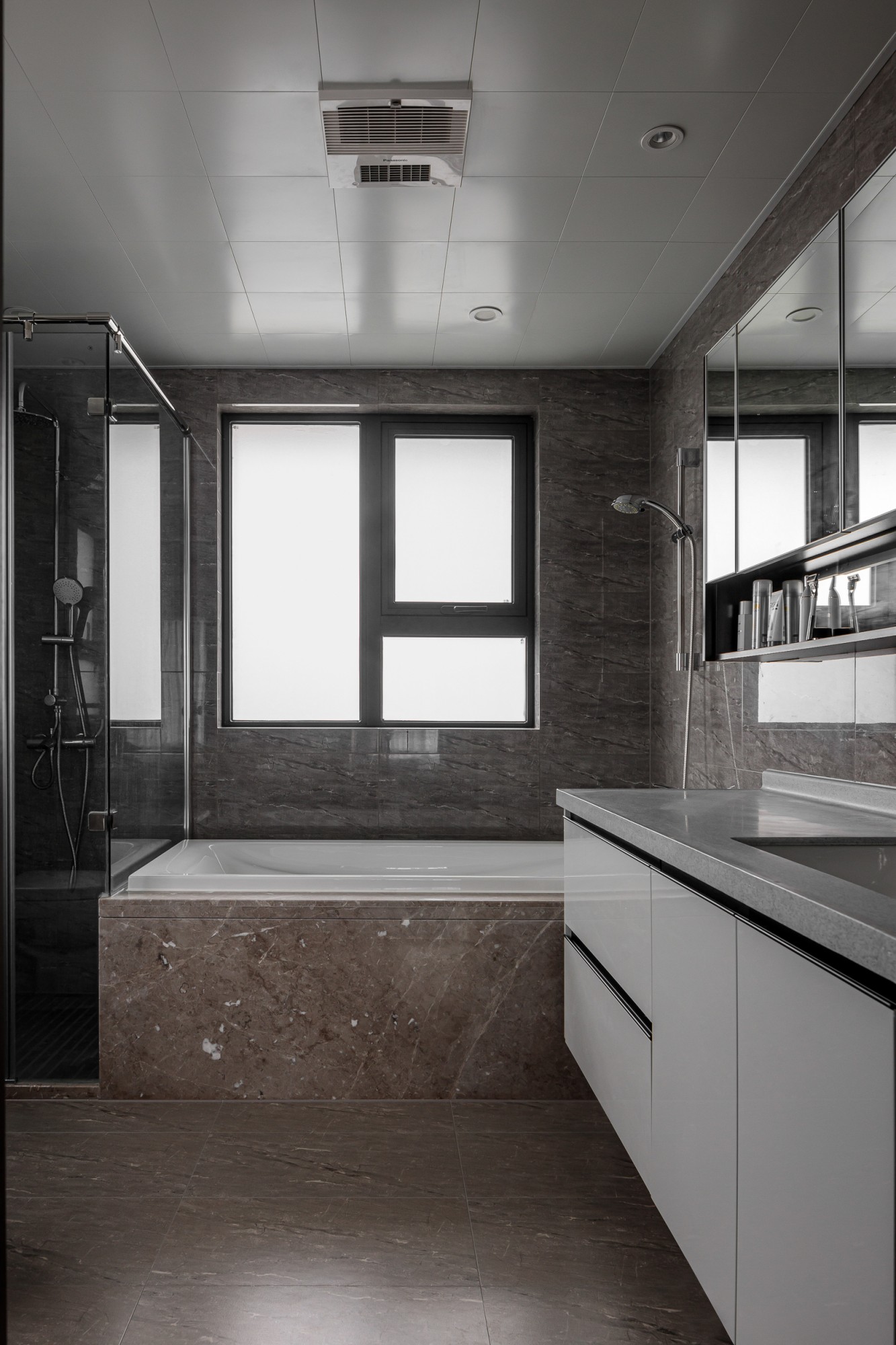 深石纹墙砖+浅灰柜面,冷调里带着点高级感。嵌入式浴缸和淋浴区做了玻璃隔断,干湿分离又不影响通透感。镜柜和抽屉柜把洗漱用品藏得明明白白,台面连瓶瓶罐罐都看不见,洁癖星人狂喜~顶部的风暖一体机和嵌入式灯,连细节都透着“实用不花哨”的舒服。