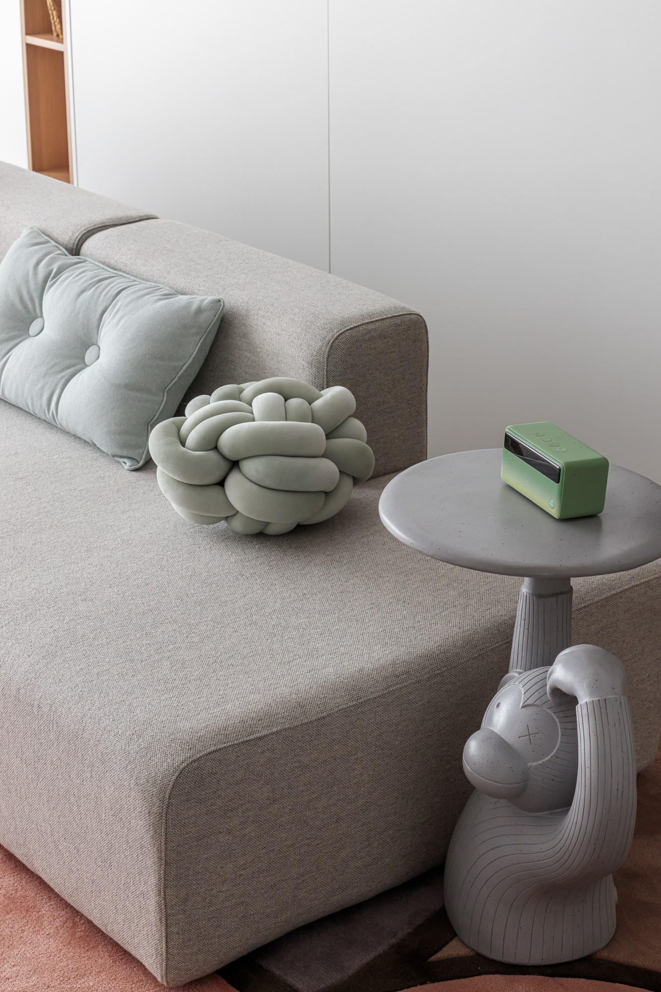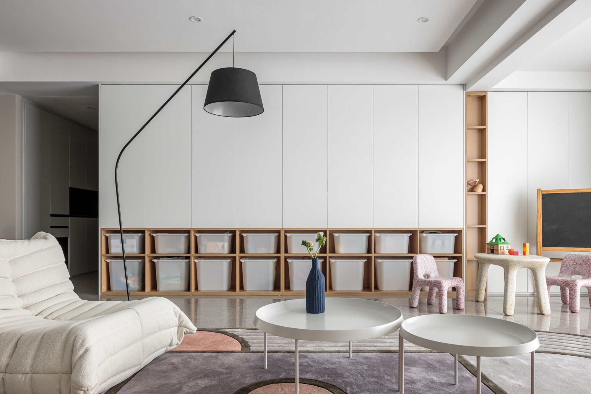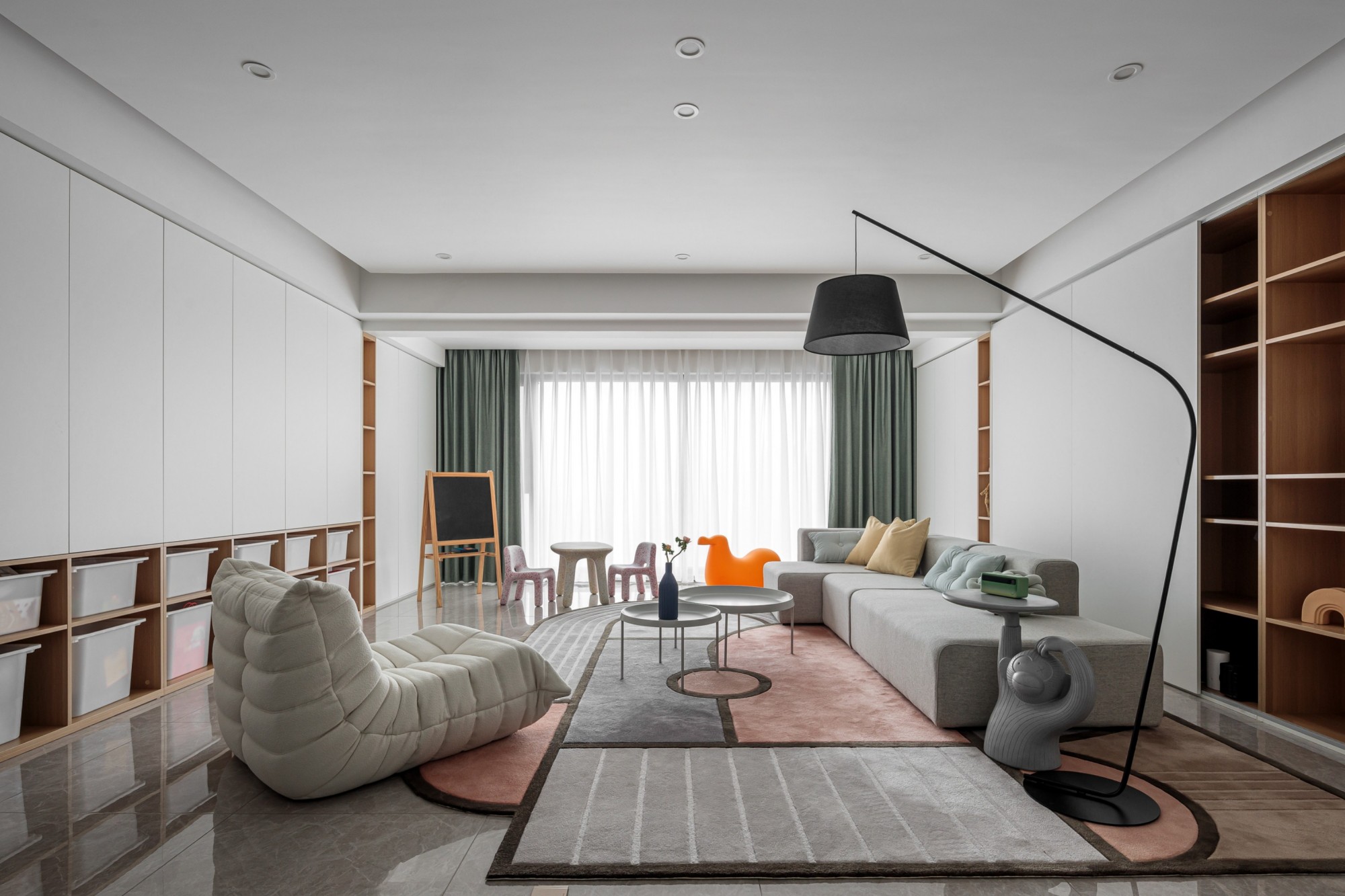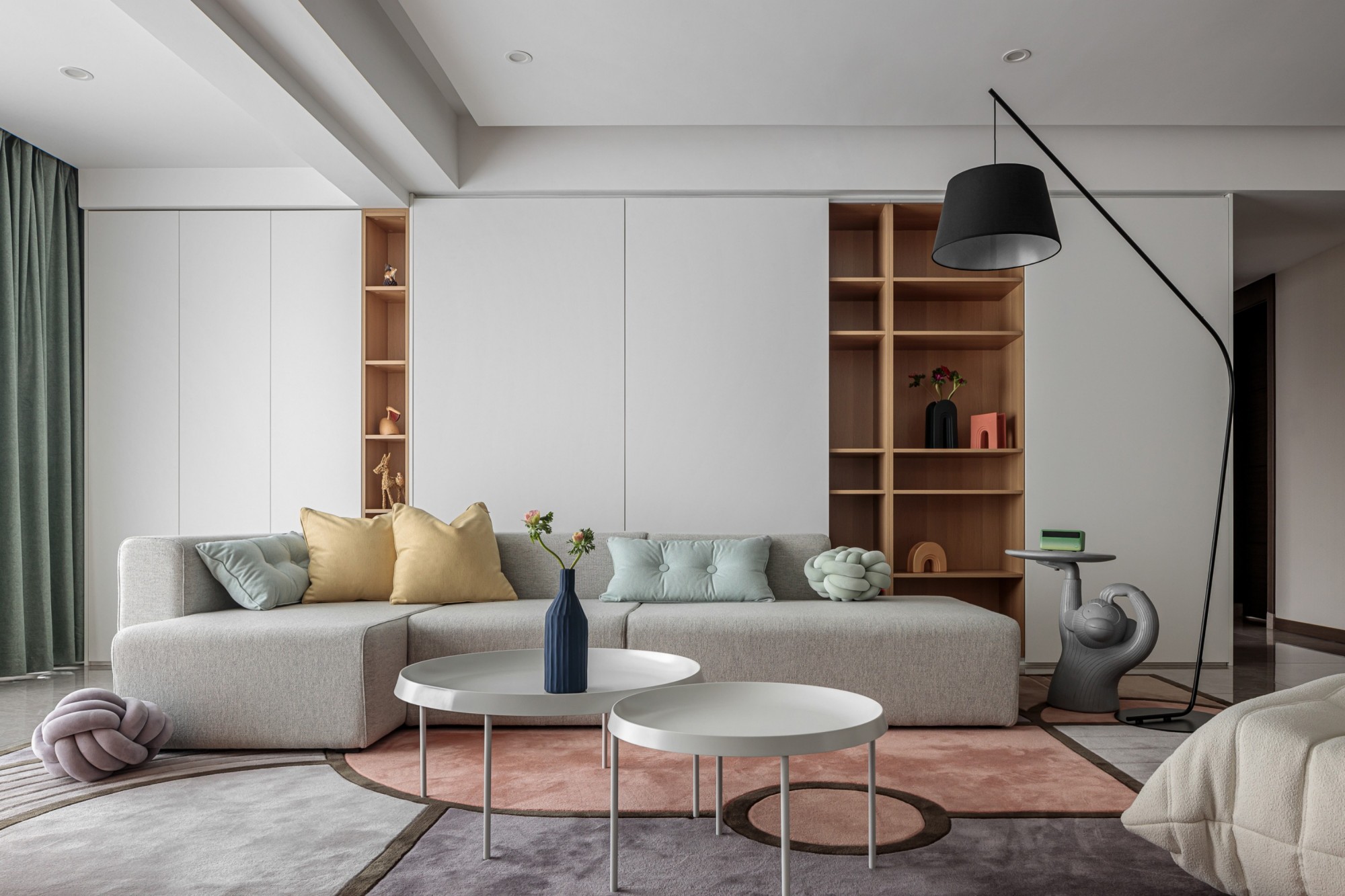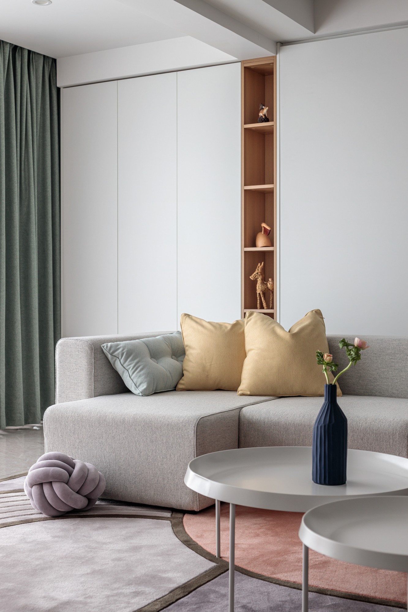 浅灰色模块沙发搭配低饱和的鹅黄、薄荷绿抱枕,像把春天的软乎乎揉进了家里~背景墙做了“隐形柜+开放格”的组合:大面积白色柜门藏起杂物,原木色开放格既能摆装饰小摆件,又能透出点温柔的暖调。地面的拼色地毯用粉棕、灰紫过渡,配上细腿圆茶几,让空间看着轻盈不笨重。黑色弧线落地灯是点睛之笔,冷硬线条中和了整体的柔和感,时髦又不抢戏。