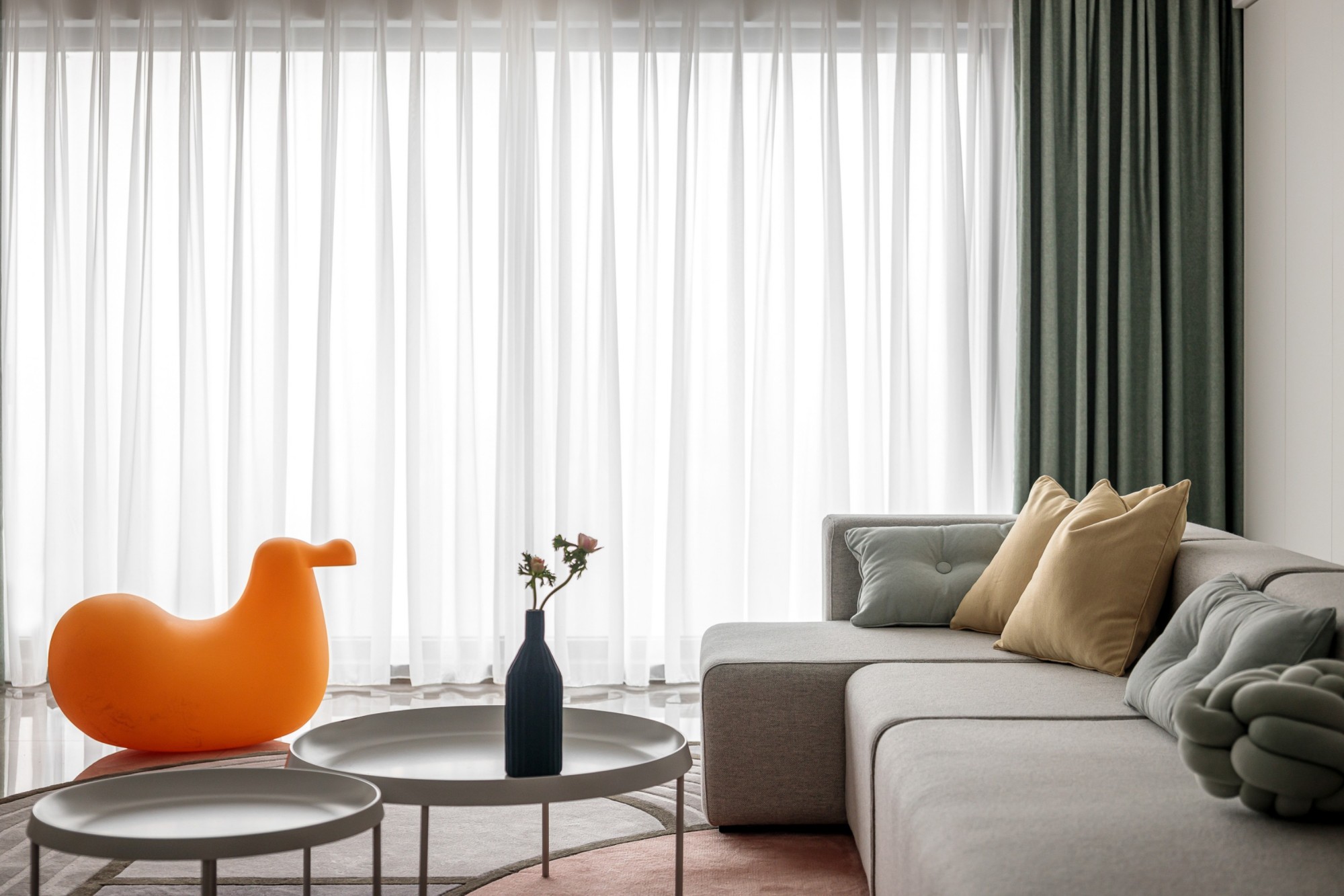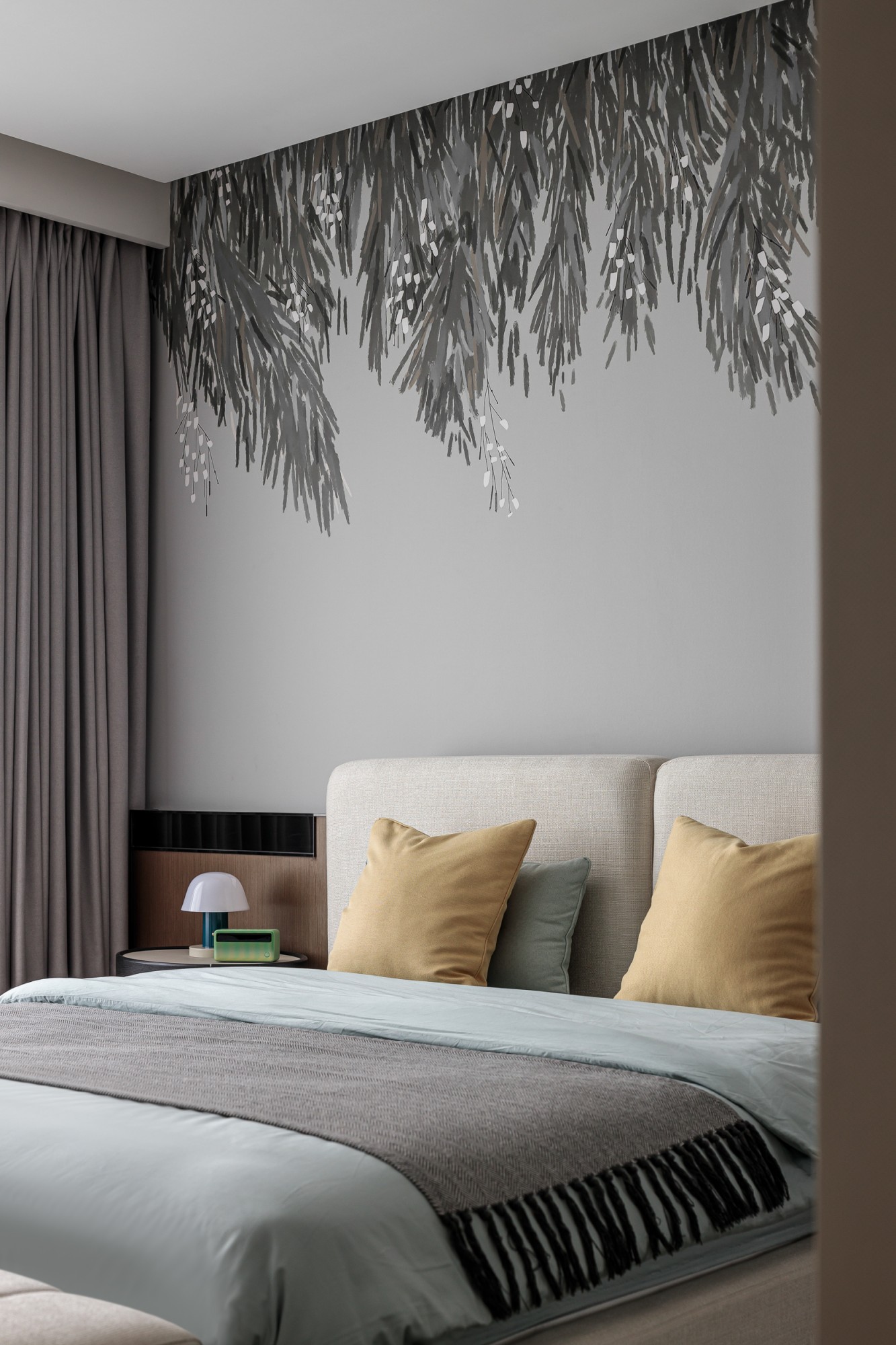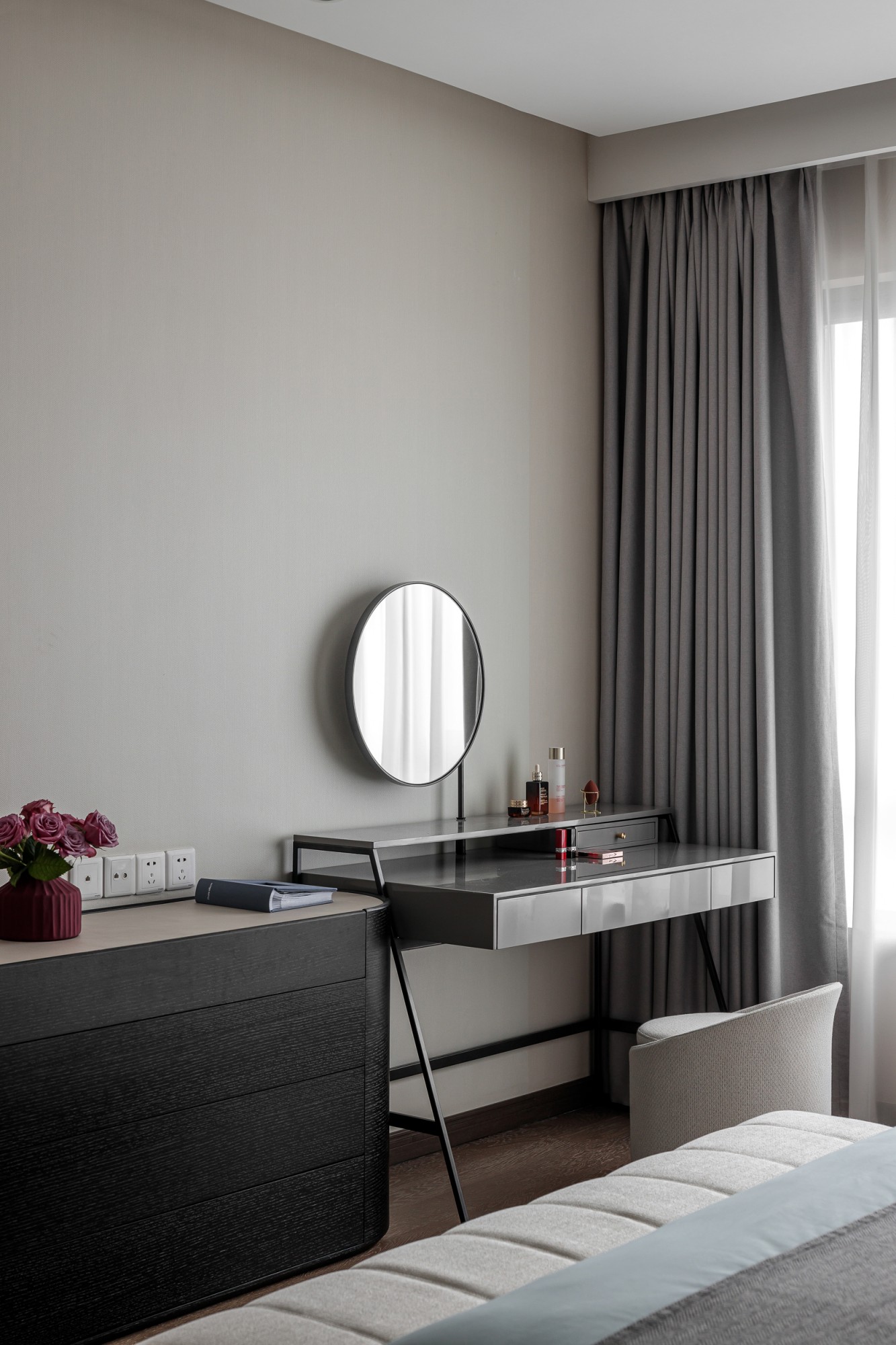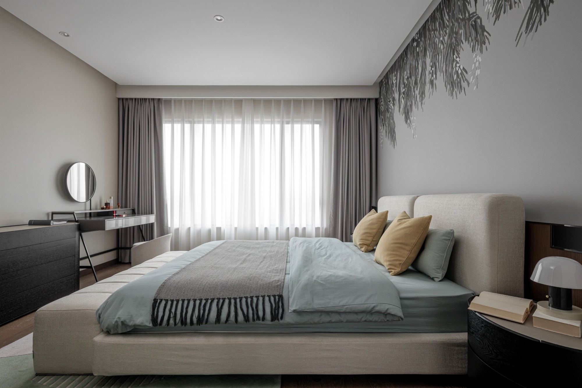 浅米色软包床自带包裹感,薄荷绿床品+鹅黄抱枕和客厅呼应,躺在床上像陷进了软乎乎的云朵里~窗边的纱帘+灰调布帘,既能透进柔光灯,又能拉上隔绝外界,睡眠安全感直接拉满。梳妆台做了悬浮设计,搭配细腿椅子,看着轻盈不压空间,连收纳柜都选了哑光黑,和床头的深色边柜呼应,低调又高级。