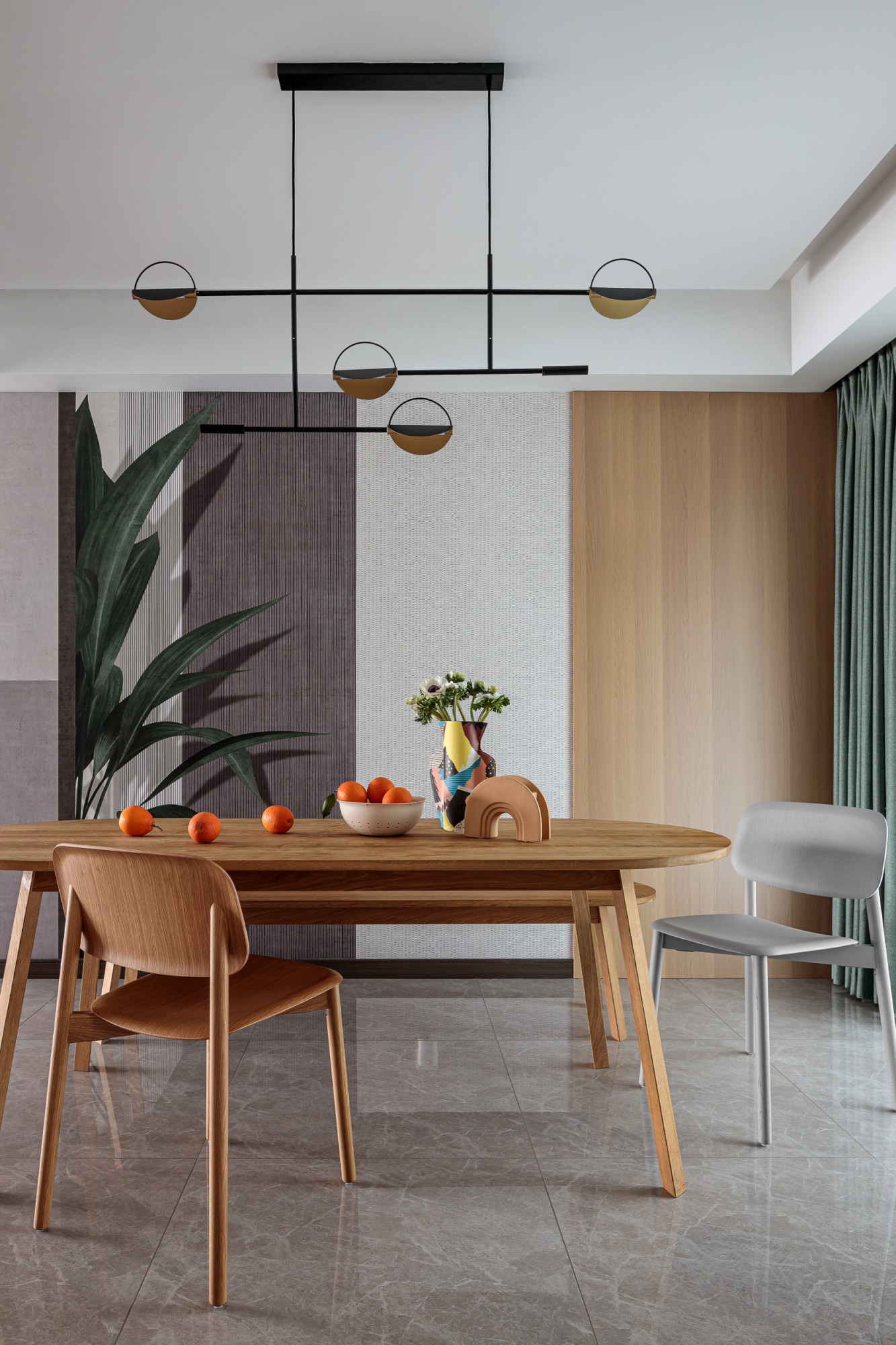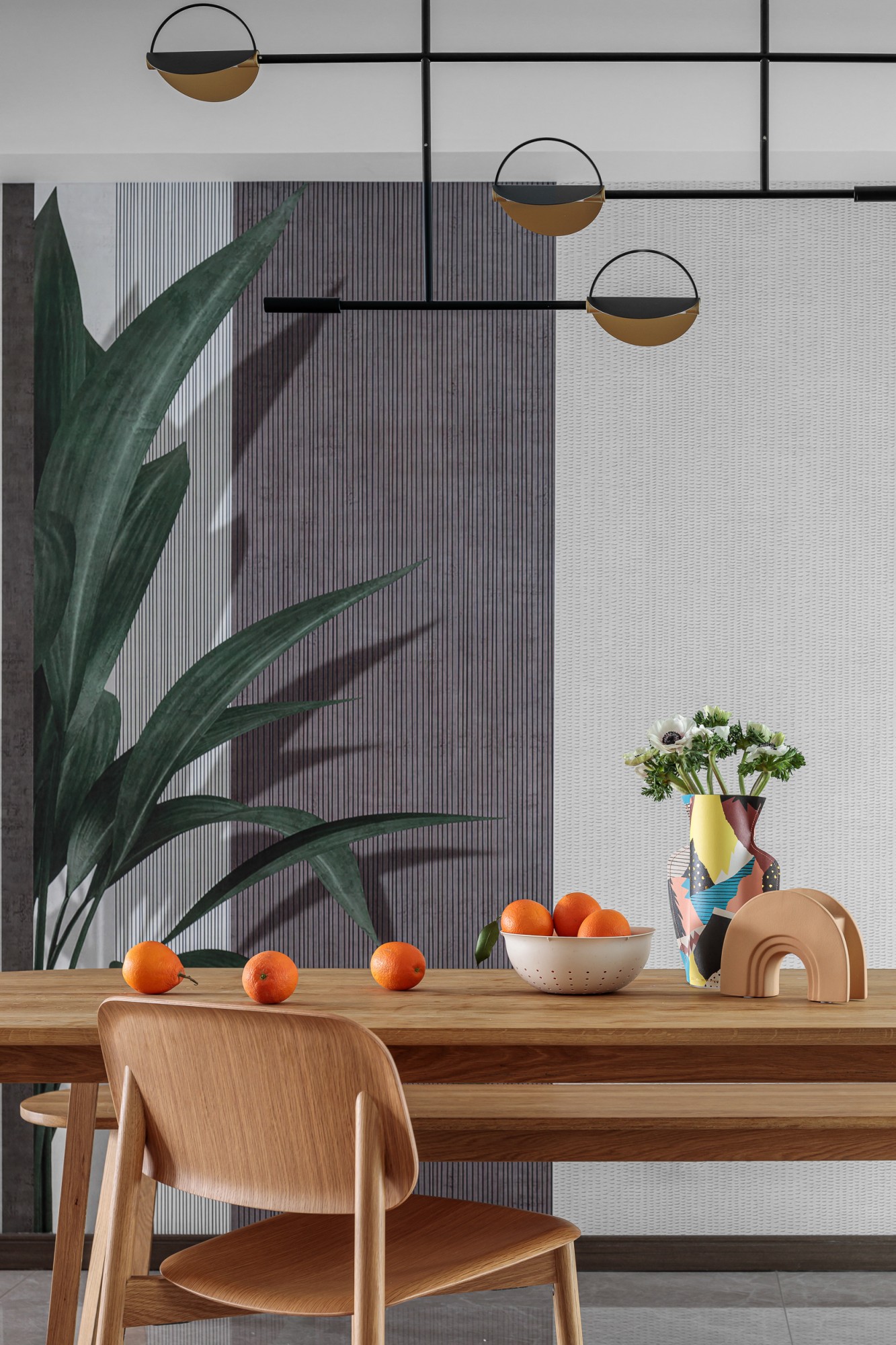 墙面用了“竖纹木饰面+肌理墙布”拼接,深浅纹理一撞,质感直接拉满。原木餐桌配半木半灰的椅子,松弛感拿捏~顶部的黑色轨道灯带点工业风,暖光打在餐桌上,吃饭都变得有氛围啦。旁边的大绿植不仅是装饰,还能给空间“透透气”,和客厅的窗帘颜色呼应,整个家的色调更连贯。