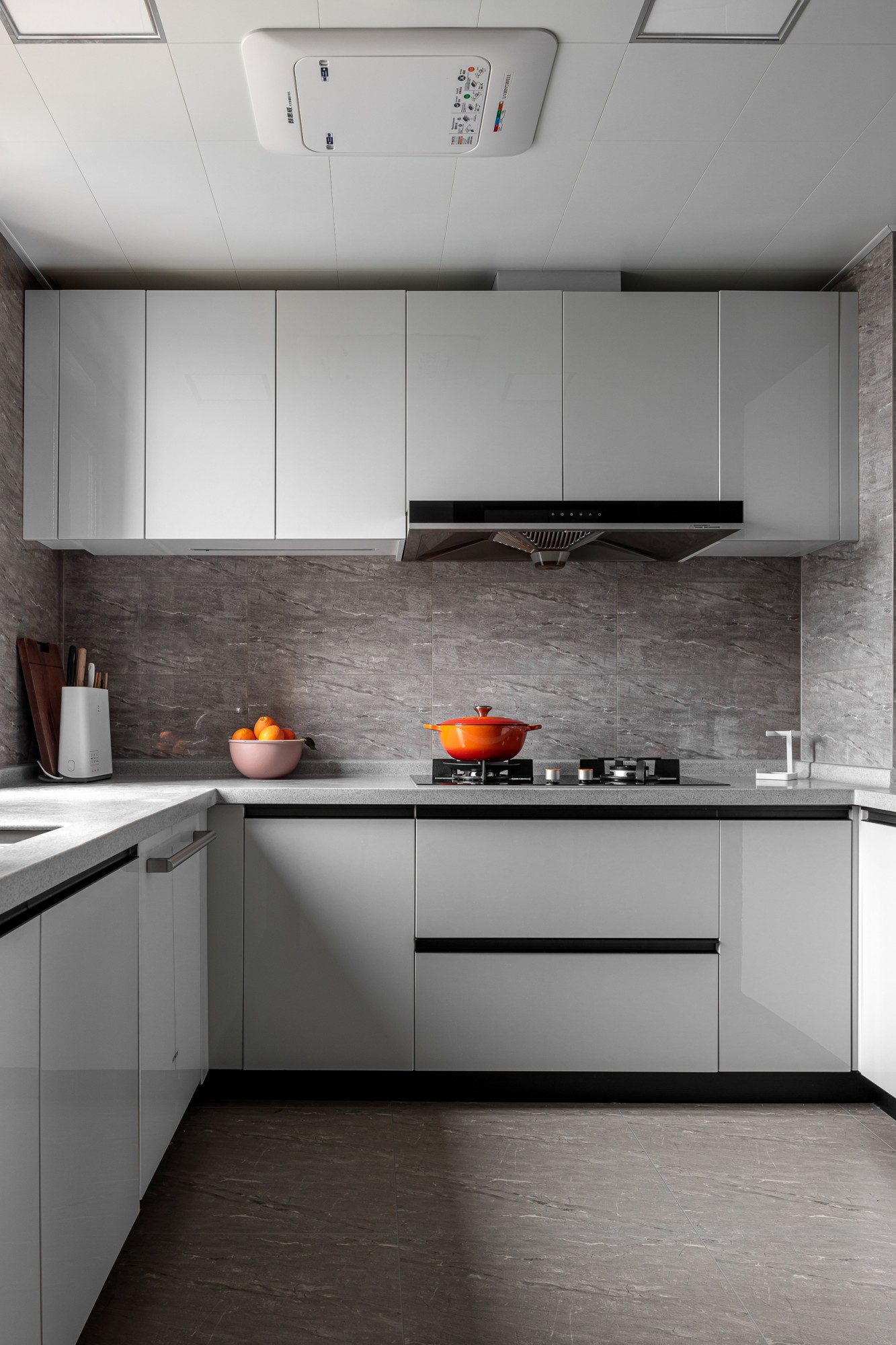 全哑光浅灰橱柜+石纹墙砖,看着干净又耐脏。台面选了带细闪的石英石,不显单调还好打理。橙色珐琅锅是厨房的小亮点,冷调空间里跳点暖色,做饭的心情都变好了~嵌入式家电把“极简”贯彻到底,连调料都藏在收纳盒里,台面清清爽爽的,做饭都更顺手。