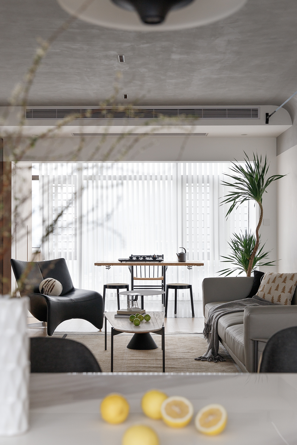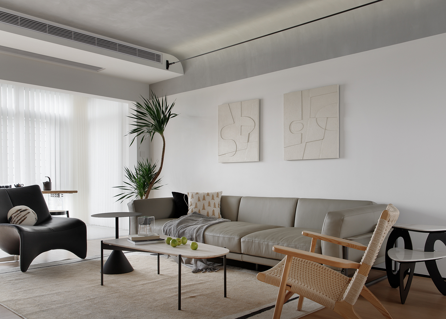 浅灰皮质沙发自带高级感,搭配藤编椅和黑色单人位,冷硬线条里混进了自然的暖调~墙面的立体肌理画是点睛之笔,素净的白墙瞬间有了层次,不用复杂装饰就很耐看。大株绿植往窗边一放,像给空间开了个“透气口”,连百叶帘透进来的光都变得柔和了,坐着发呆都舒服。
