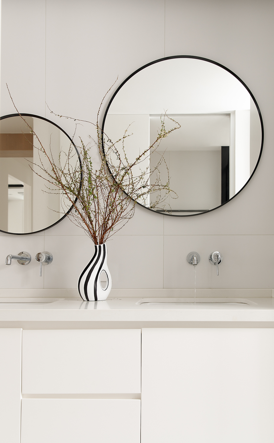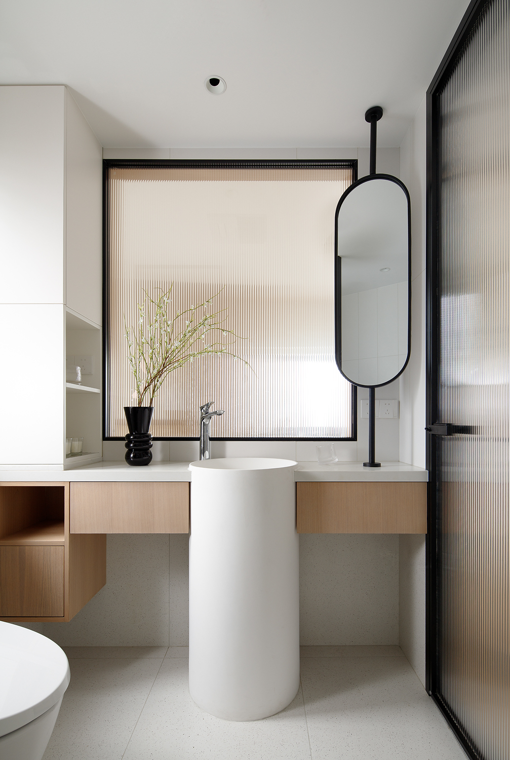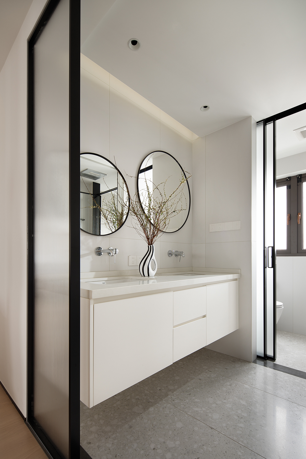 长虹玻璃隔断把卫浴分成了干湿区,透光不透人,小空间也不闷~双圆镜+悬空柜,连洗漱用品都能藏进抽屉,台面干净得能“反光”。地面选了带细闪的水泥砖,冷调里透着点细腻,连五金都用了极简款,整个空间清清爽爽,打理起来超省心。