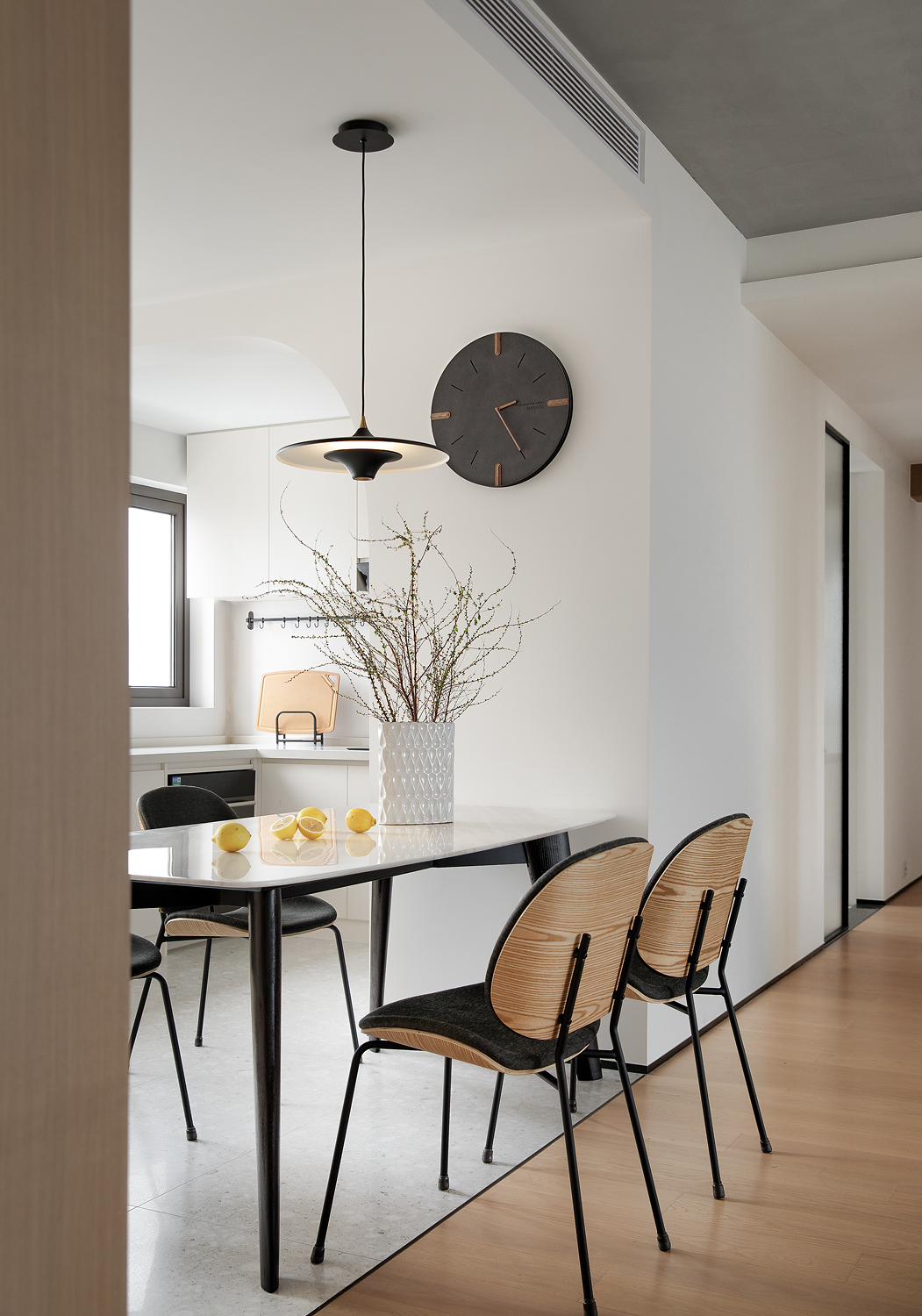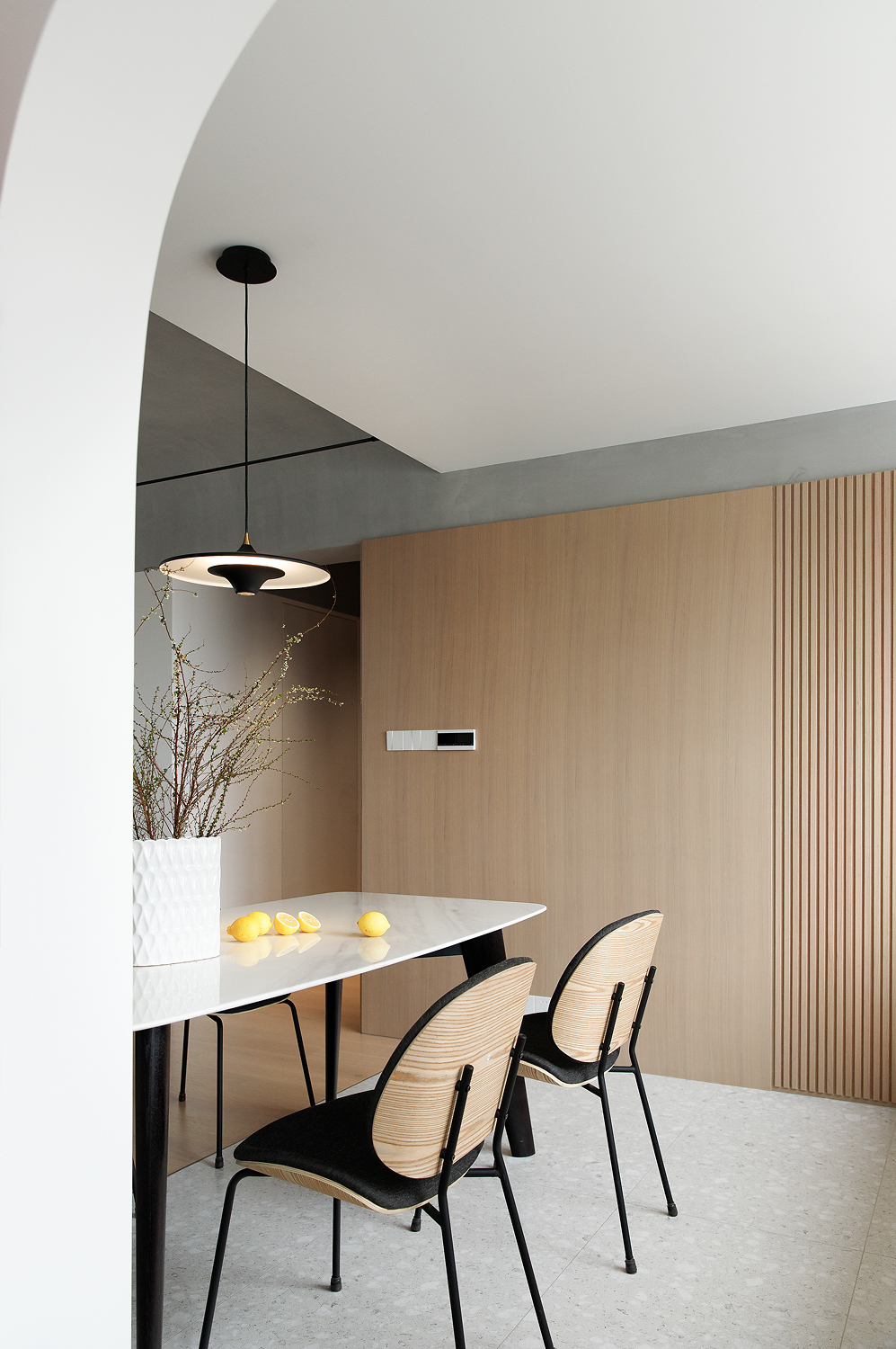 整面木饰面柜把杂物藏得严严实实,局部做了竖纹肌理,摸上去有温度,看着也不单调~餐桌选了黑框+原木椅的组合,冷调框架配暖木色,和客厅的材质刚好呼应。窗边的水吧台连咖啡机都藏好了,吃饭、备餐都在同一个空间里,动线顺得像“踩了棉花”。