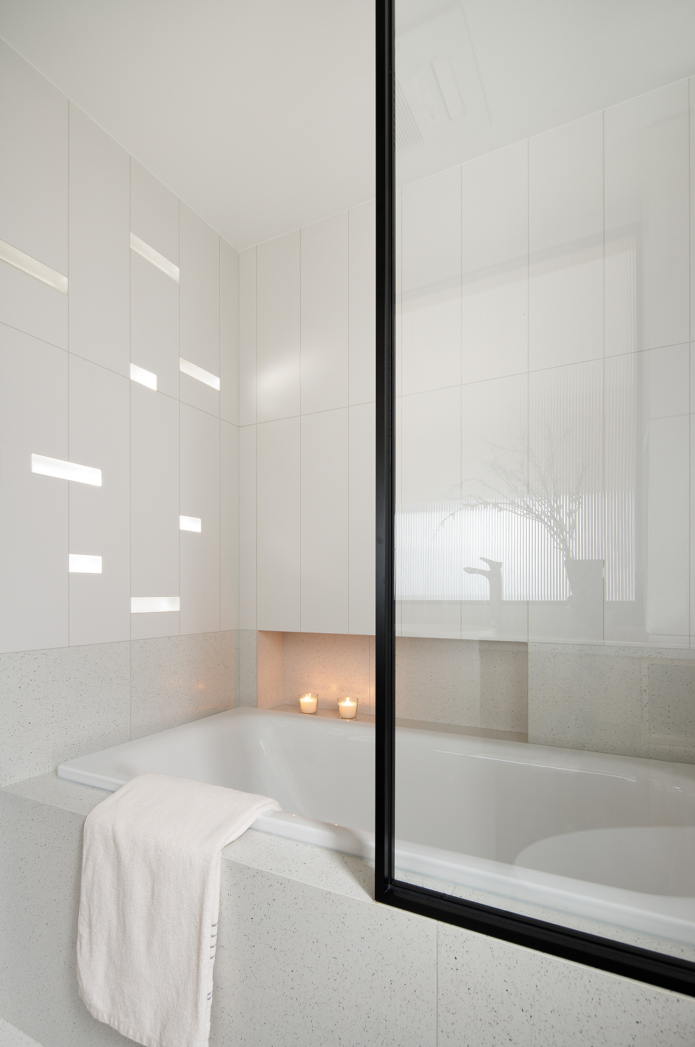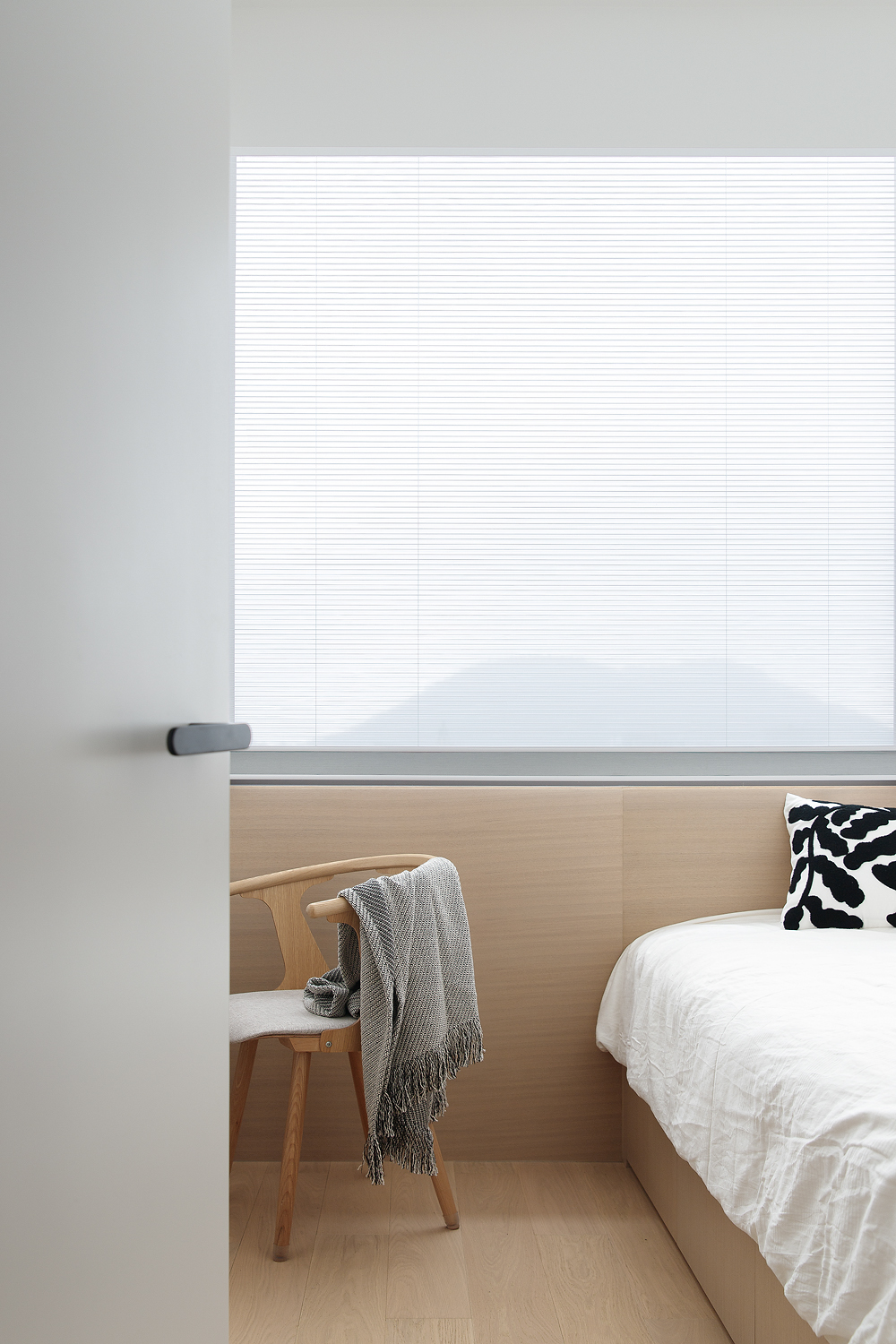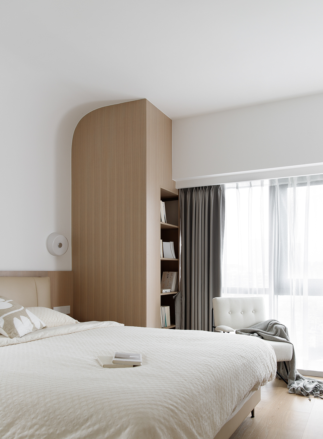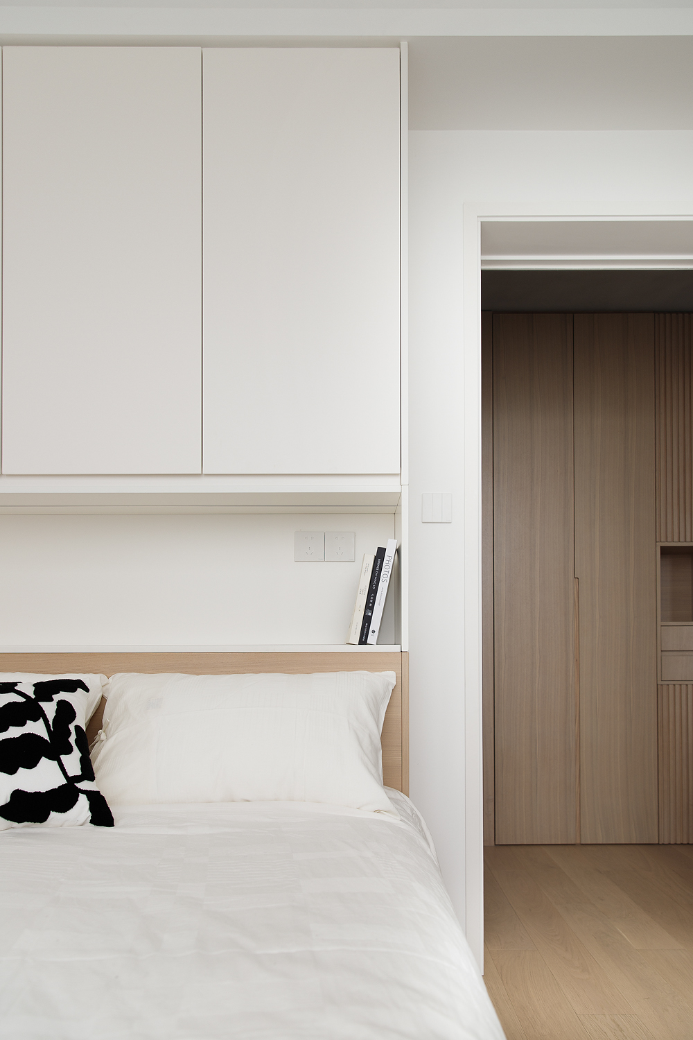 整面墙的白色衣柜把储物拉满,连门都做了隐形设计,视觉上“轻”得像没存在感~床头的木色软包自带温柔滤镜,配上素白床品,往床上一躺就像陷进了云里。墙上的长虹玻璃装饰,既能借到卫浴的光,又给素墙加了点朦胧的高级感,睡觉都变得有氛围。