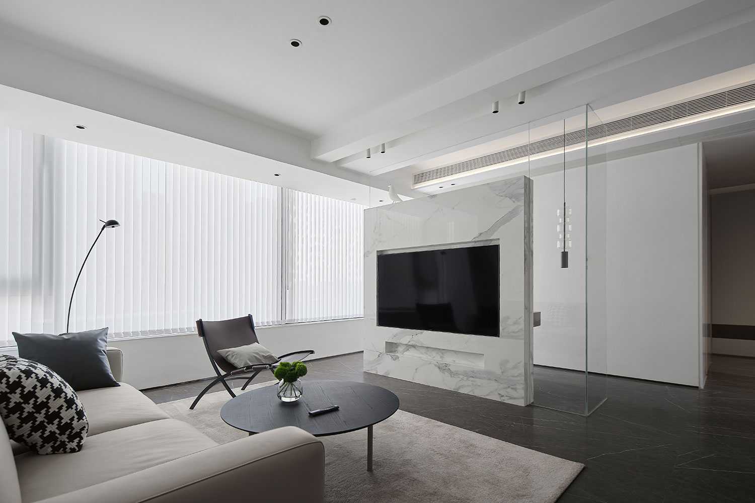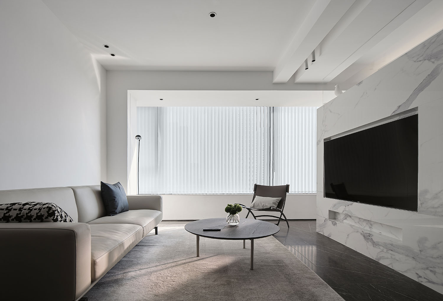 • 主色调是奶白+浅灰,背景墙直接用大理石纹理拉满质感,悬浮电视柜和墙面无缝衔接,极简到连电线都“隐形”;