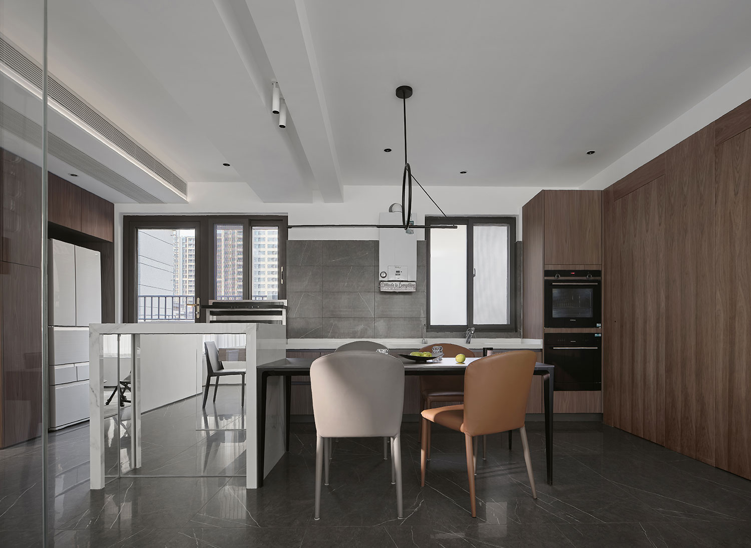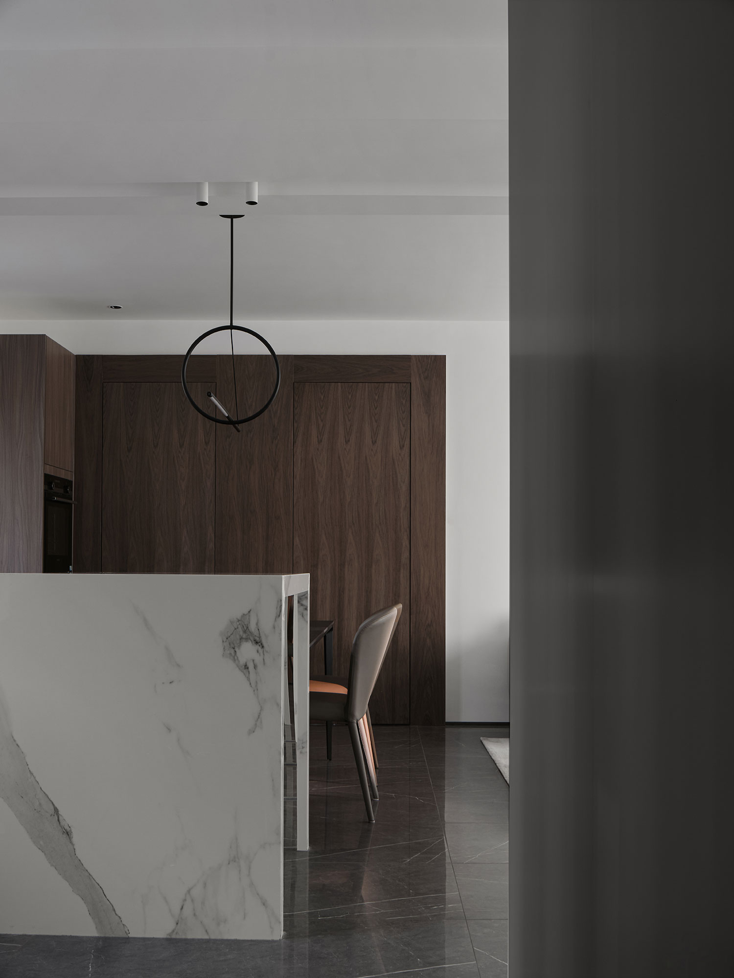 • 深木色柜面+深色岩板墙,中和了白色空间的清冷,餐椅选了奶茶色皮质款,随手一搭就是“低调的精致感”;