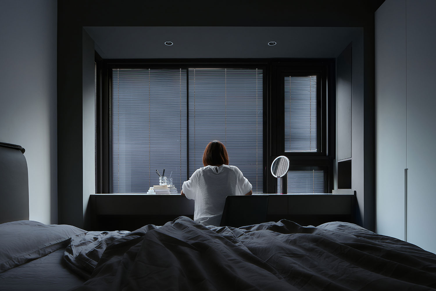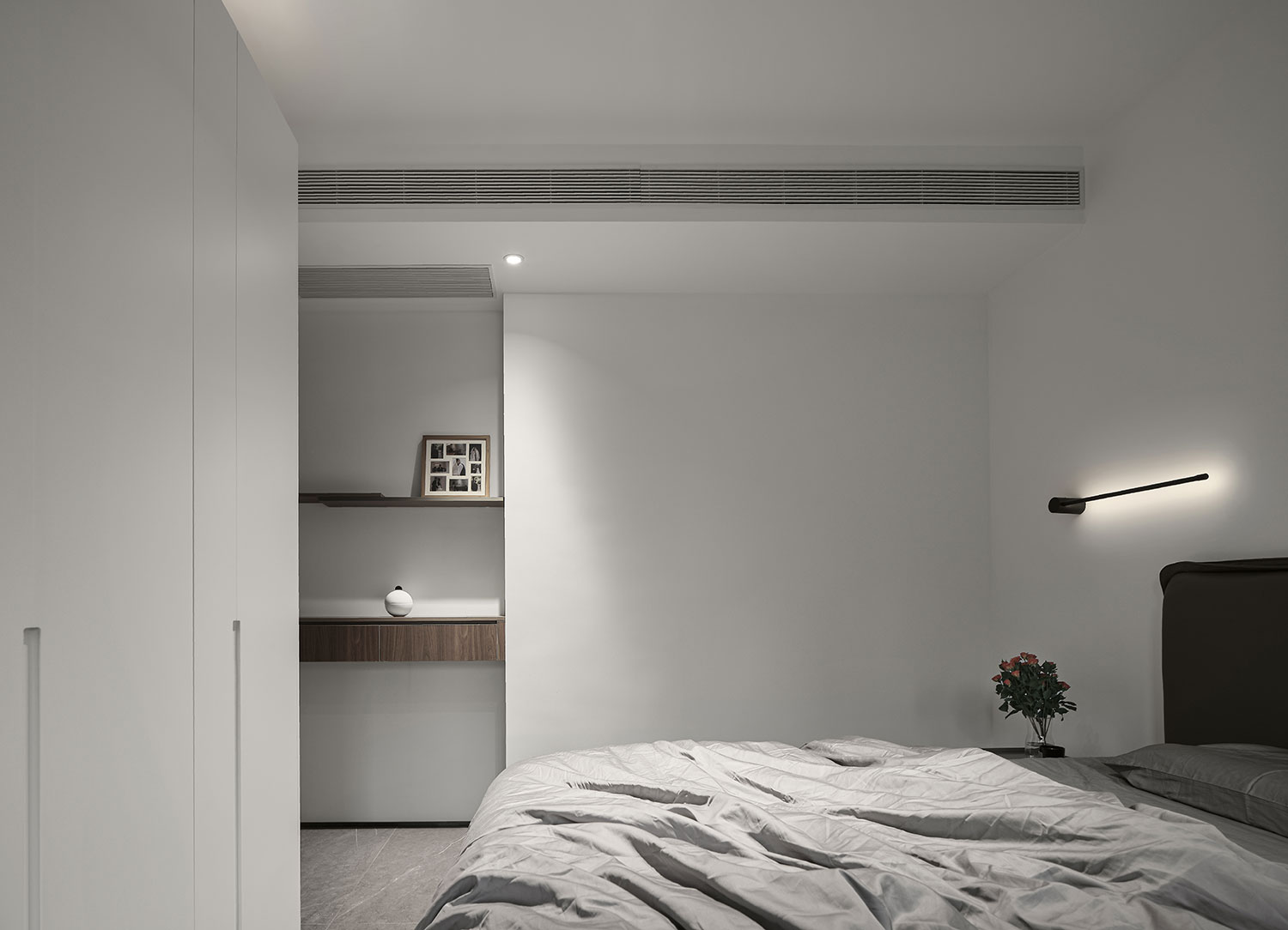• 窗边做了悬浮书桌,既省空间又能当梳妆台,长条形壁灯代替主灯,睡前开着刚好是“不刺眼的温柔光”。