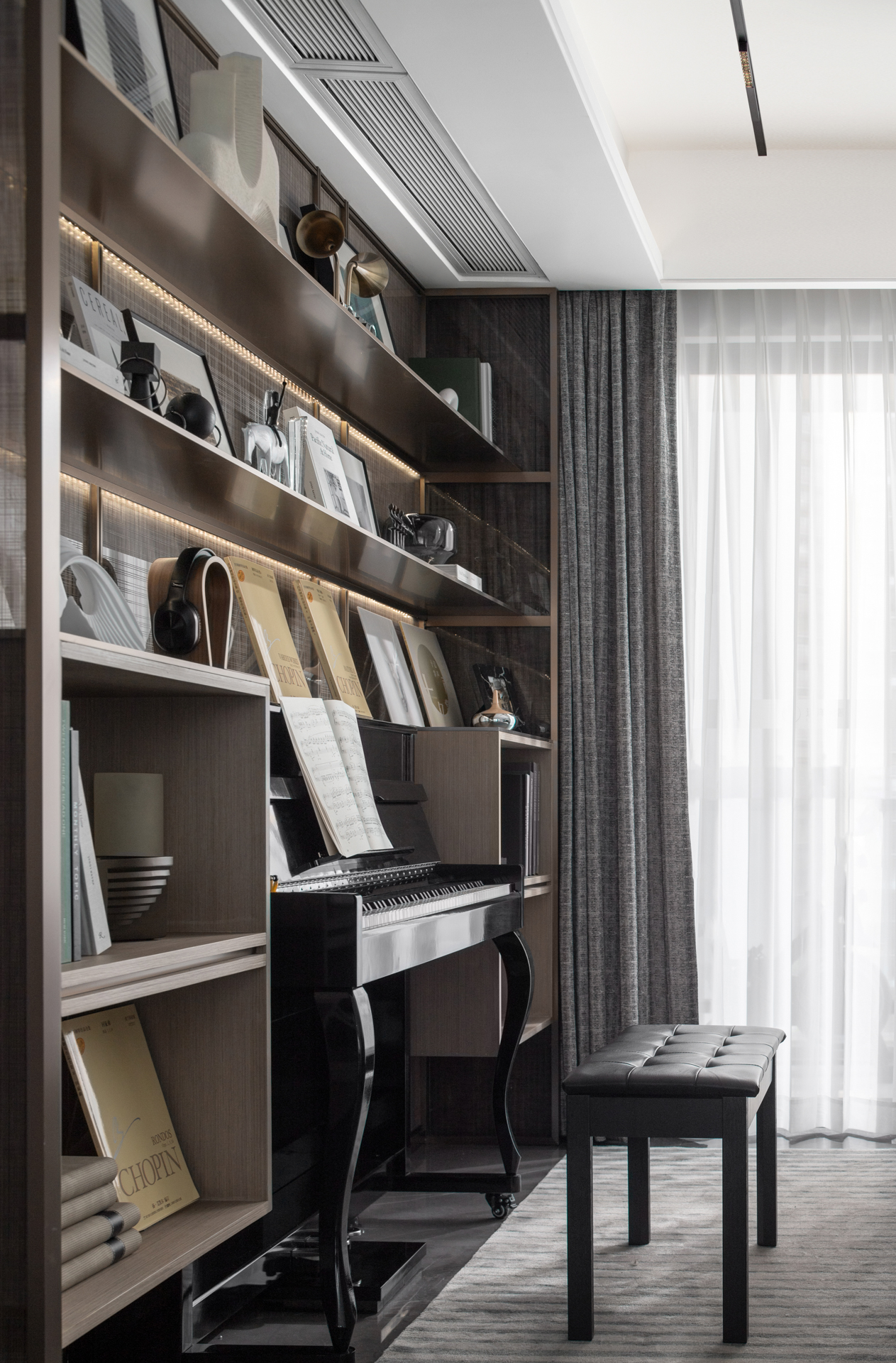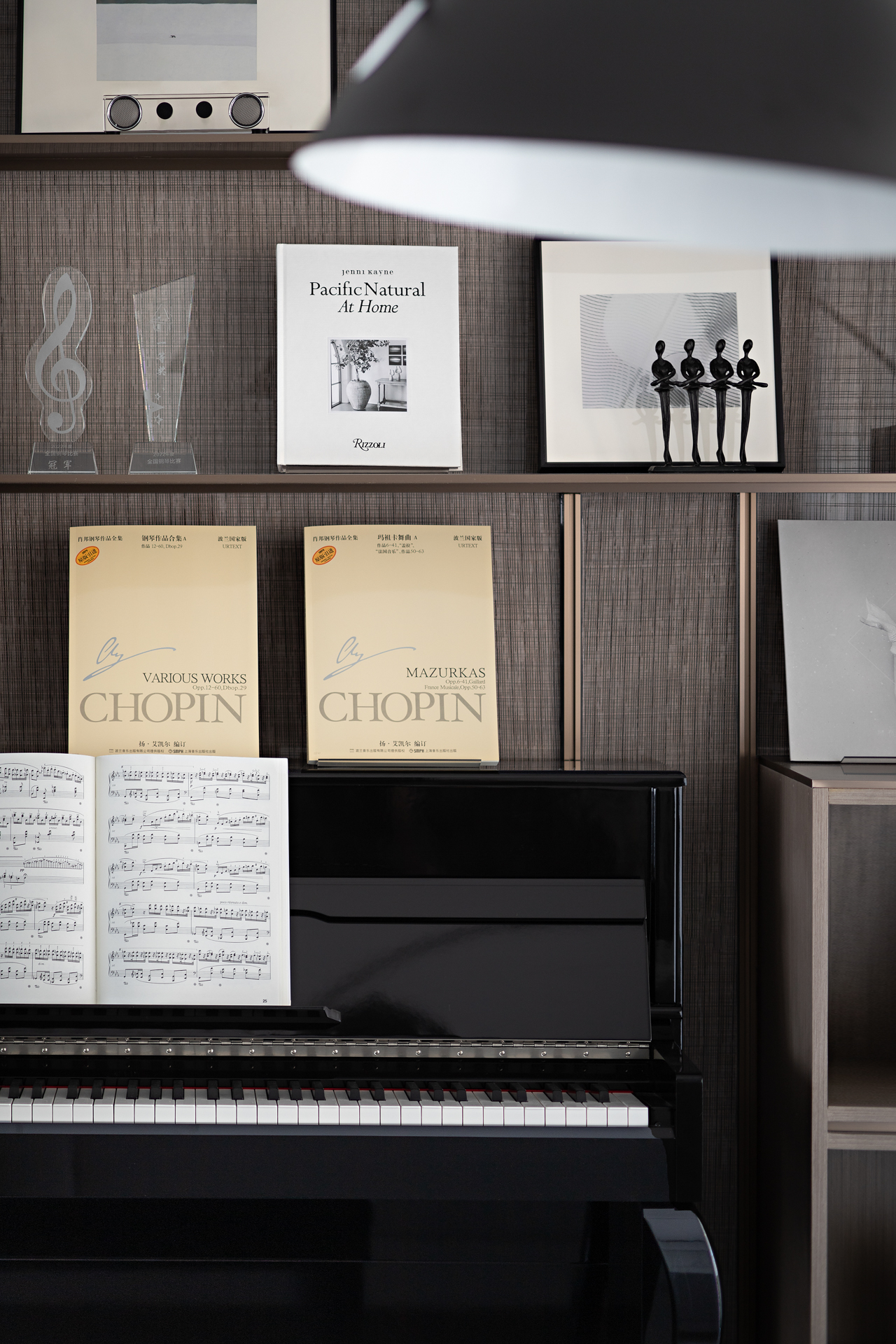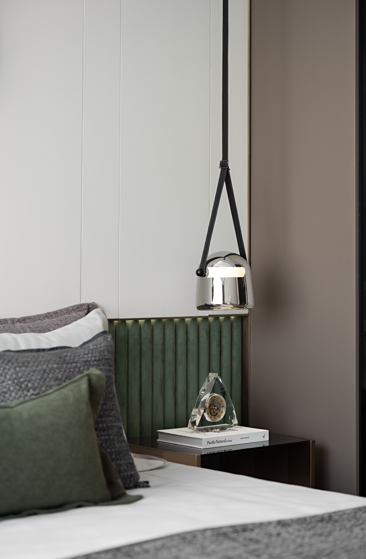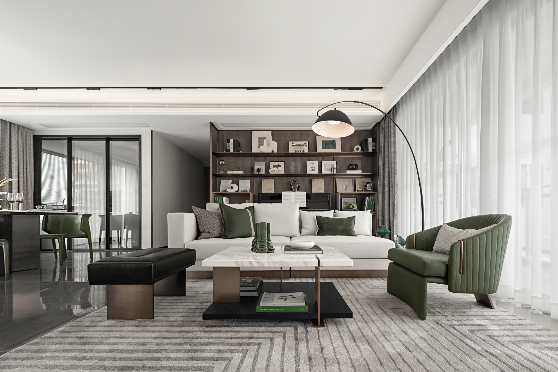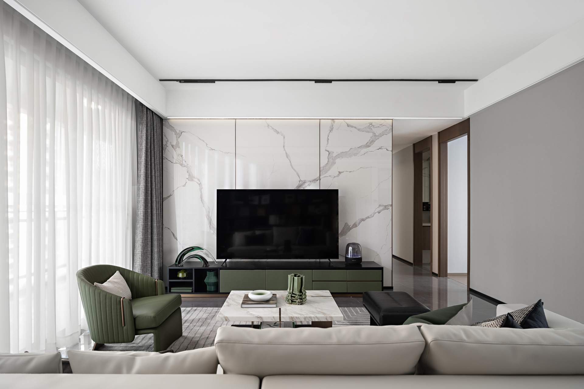 • 客厅用大理石背景墙+悬浮电视柜打底,搭配丝绒质感的墨绿单人椅,冷调的利落里藏着柔和的温度,光影透过纱帘落进来,连空气都带着松弛感;