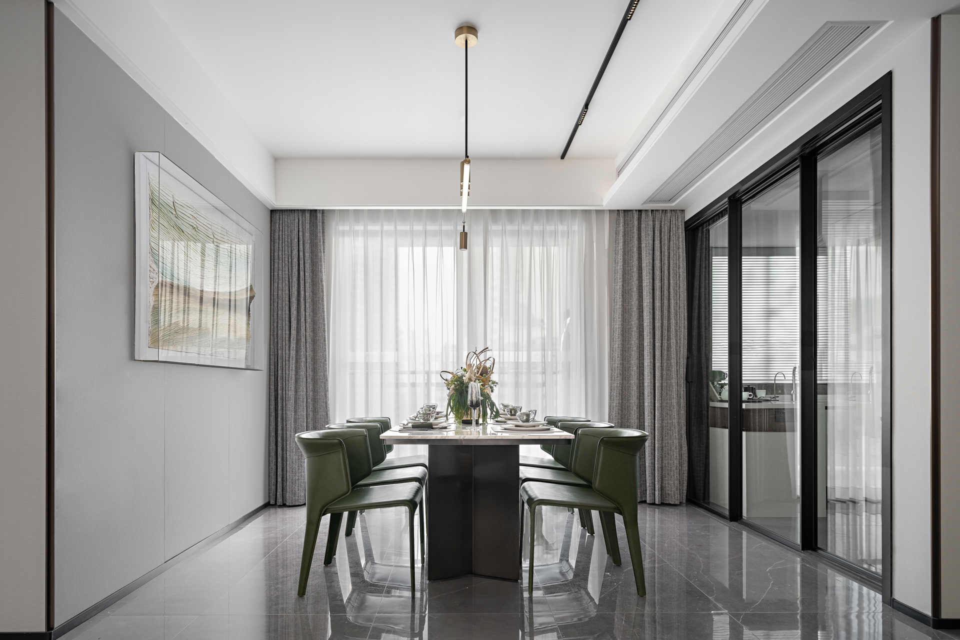 • 餐厅延续了同色系的墨绿餐椅,大理石桌面与客厅茶几呼应,黑框玻璃移门让空间通透又显层次,一盏长形吊灯轻轻勾出用餐的仪式感;