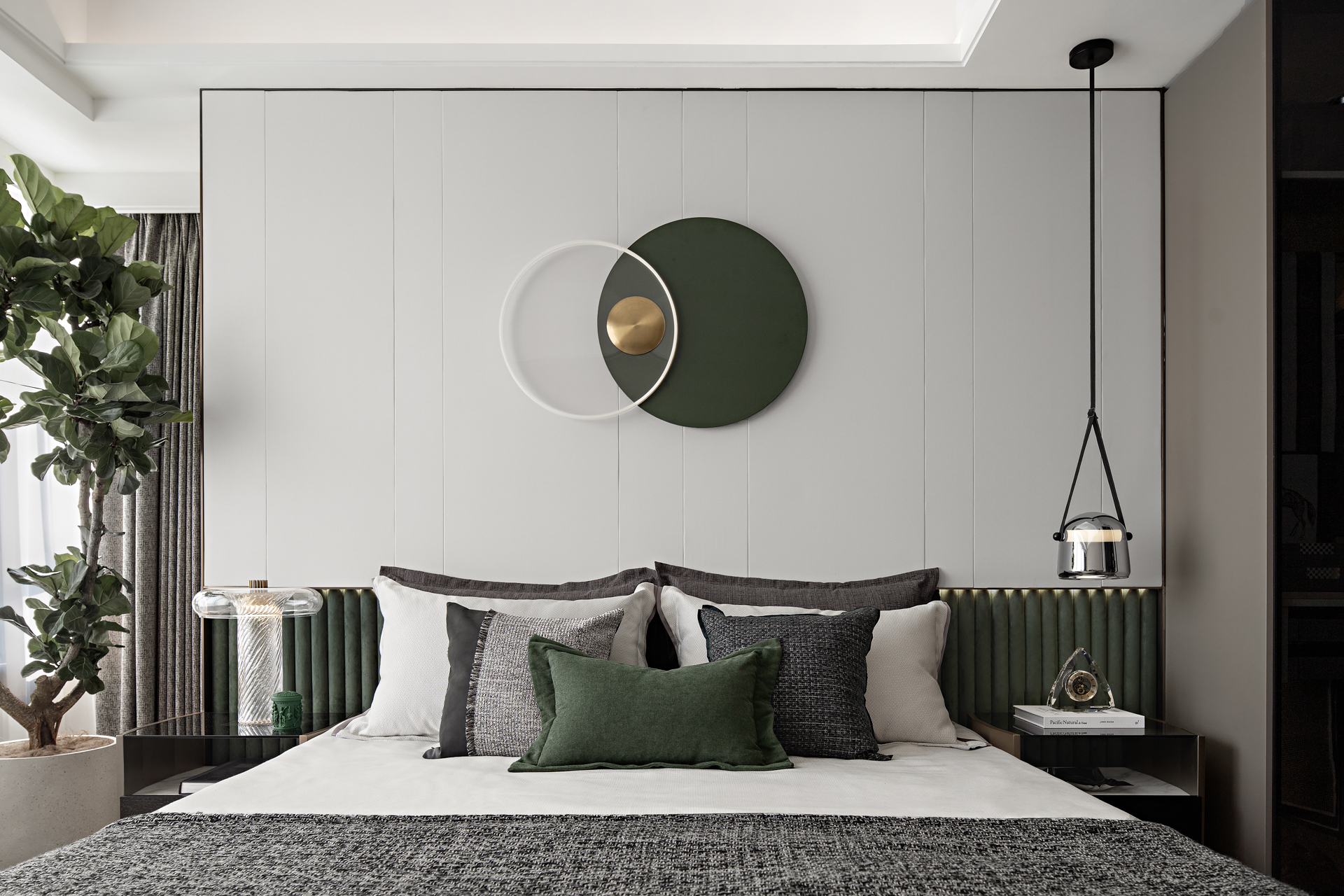 • 主卧是“安静的温柔乡”:软包床头+金属圆镜做点缀,暖棕单人椅配小边几,连植物的绿意都恰到好处,躺下就是被包裹的舒适;