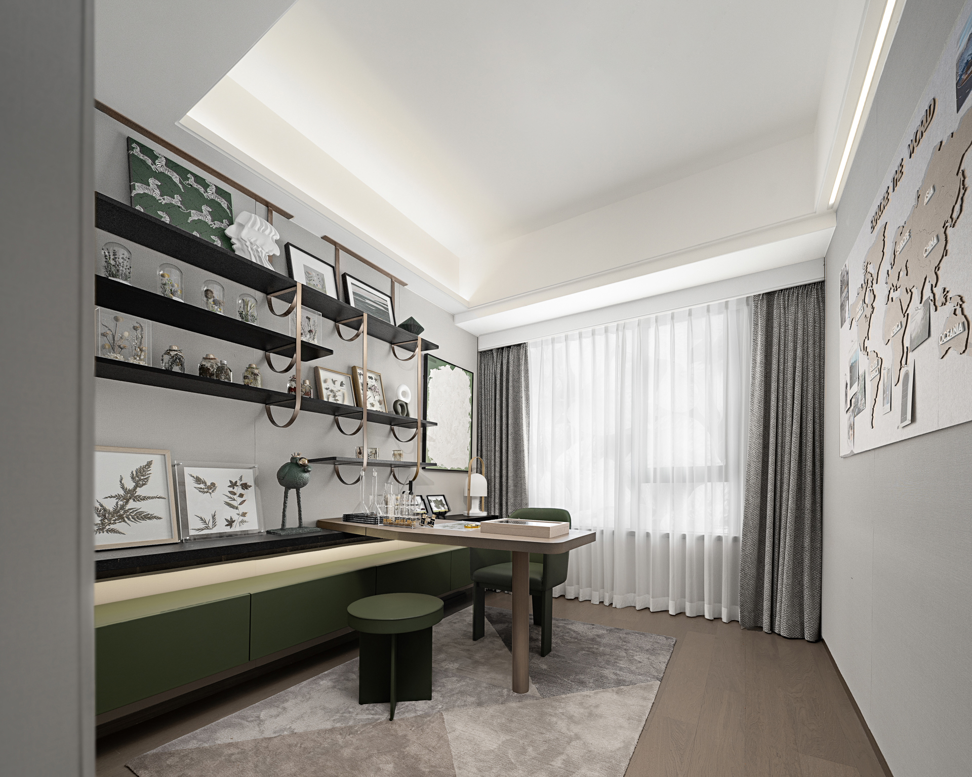 • 儿童房则是“童趣版的同色系”:圆弧墙面+恐龙书架+笑脸抱枕,把墨绿换成更活泼的浅绿,玩闹与学习的角落都藏着小心思,童趣却不杂乱。