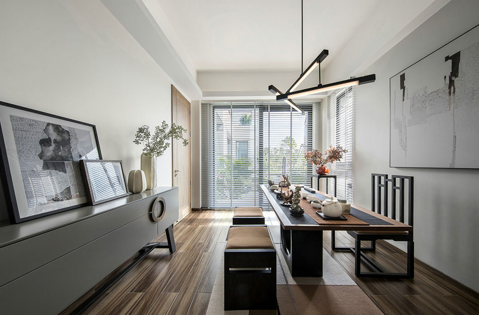 茶室的设计禅意尽显,茶台也可作为练习书法的书桌;温暖的原木色,与镂空隔栅,温馨色彩纹理和谐交融让整个空间的视觉呈现效果十分的舒适协调