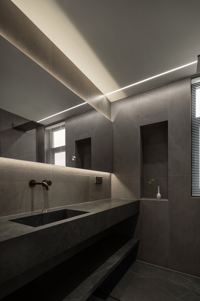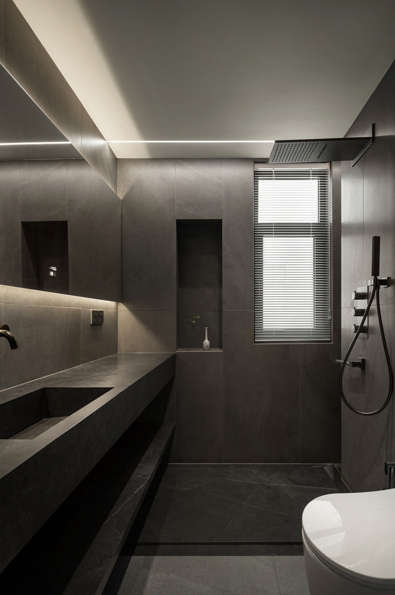 深灰调卫浴空间演绎「克制中的精致」:通体岩板的冷冽质感,被暗藏灯带的暖光温柔中和;壁龛里的一枝绿意,让功能性空间漾起生机。线性照明与极简五金的搭配,将「实用」与「美学」压缩进方寸之间,每一次沐浴都成为都市人卸下心防的治愈仪式。