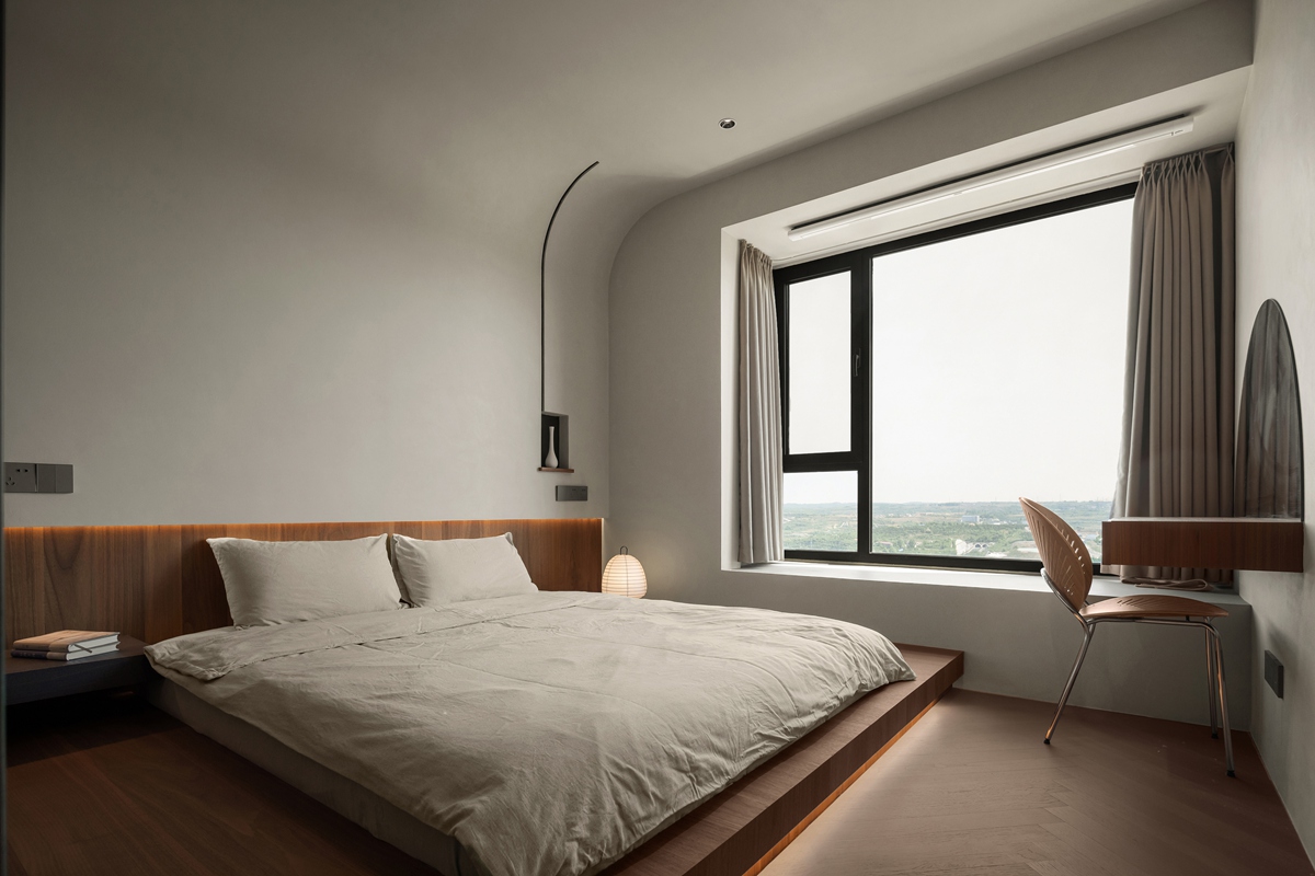 卧室是「城市观景台」与「私密庇护所」的共生体:抬高的木质床台如大地的延伸,内嵌灯带勾勒出悬浮般的轻盈;大幅窗景将天际线与绿意揽入室内,让睡眠成为「与自然共呼吸」的日常。弧形线条的墙面设计柔化空间棱角,搭配原木与素色床品,在极简中盛放着「归家即归心」的松弛力量。