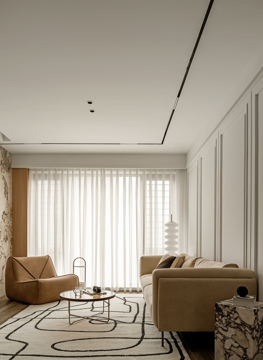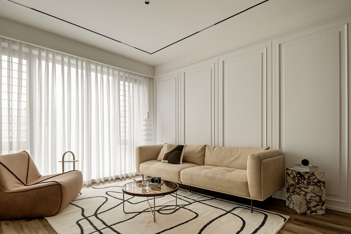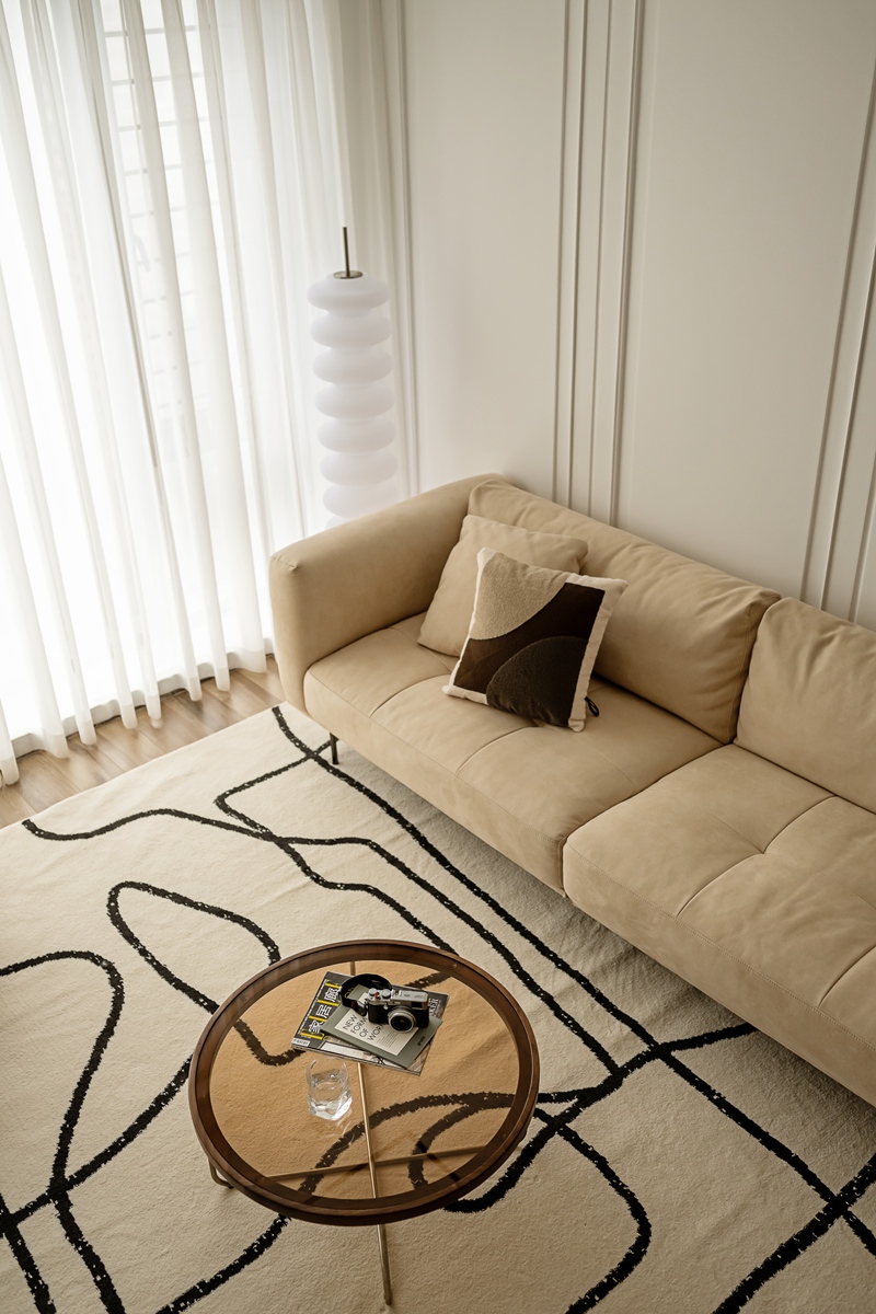 米杏色沙发如同被阳光晒暖的软云,搭配几何感黑白地毯,让空间在柔和中透出利落。白色护墙板以极简线条勾勒秩序,透光纱帘滤过的光线,让整个客厅成为“可呼吸”的松弛容器,静坐于此,便能感知时光的慢淌。