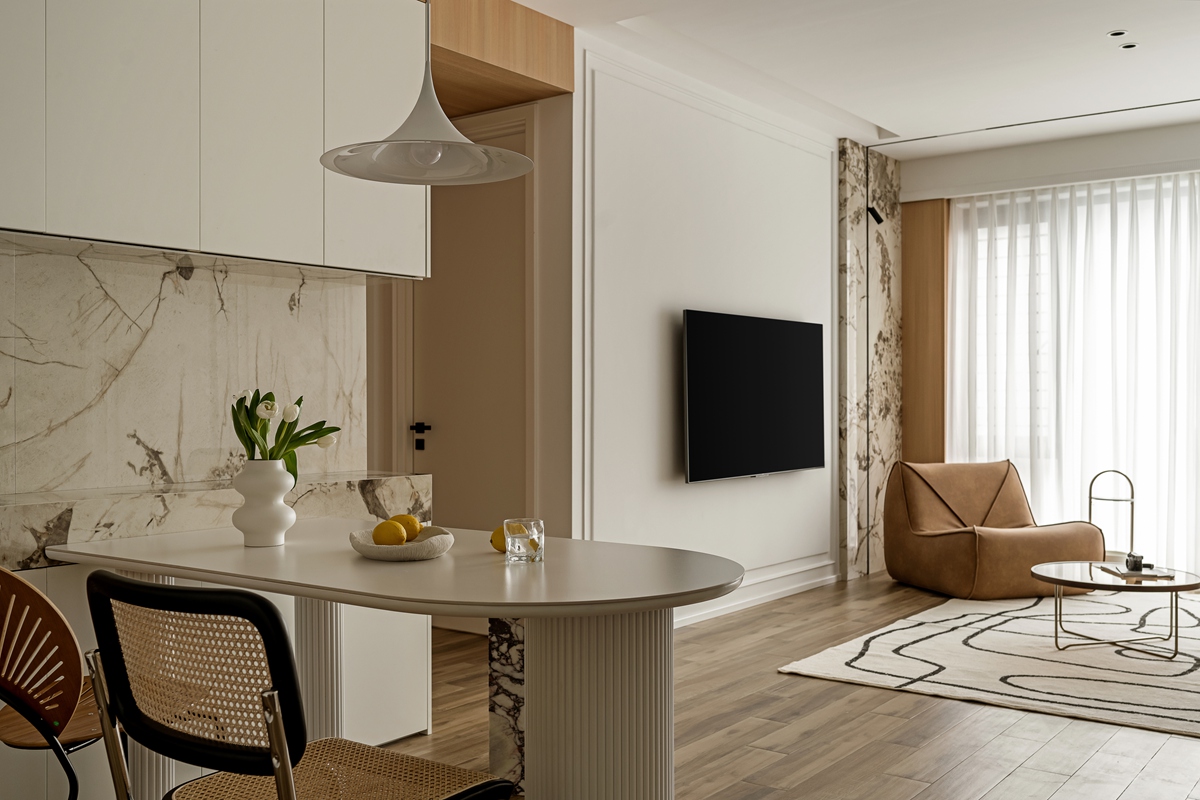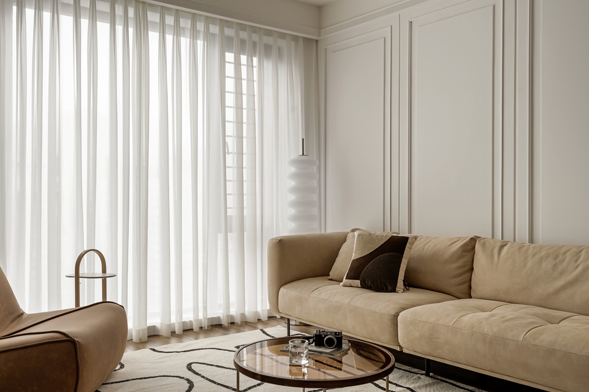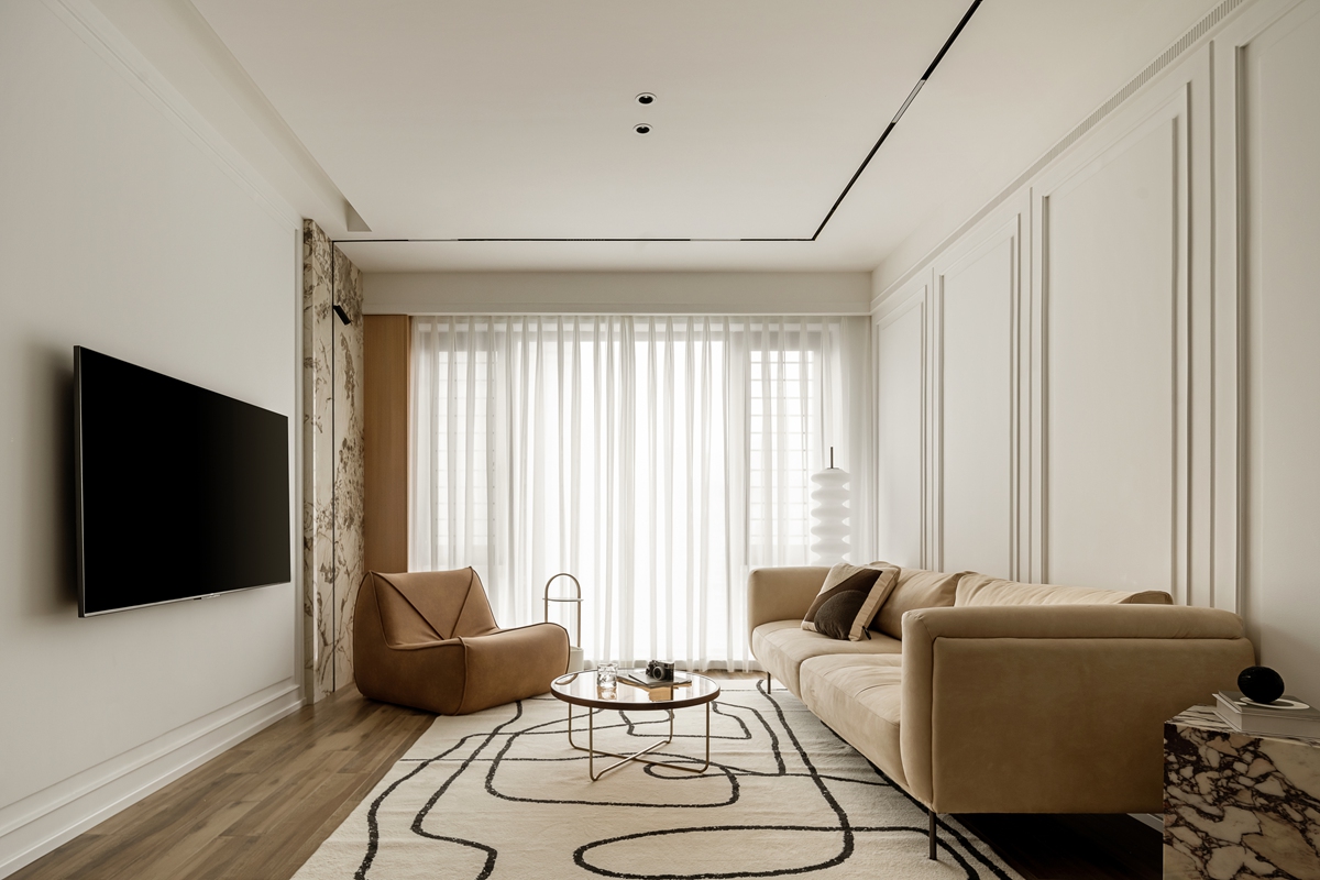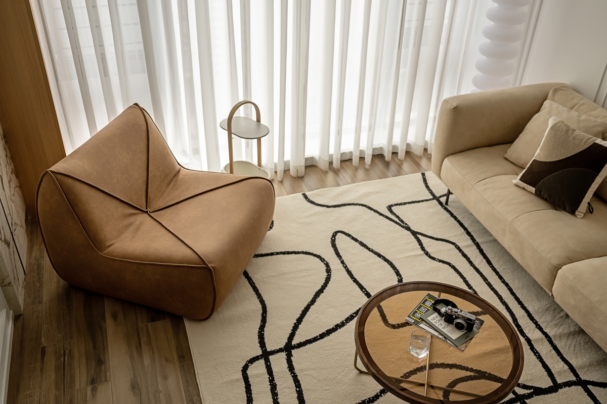 米杏色沙发如同被阳光晒暖的软云,搭配几何感黑白地毯,让空间在柔和中透出利落。白色护墙板以极简线条勾勒秩序,透光纱帘滤过的光线,让整个客厅成为“可呼吸”的松弛容器,静坐于此,便能感知时光的慢淌。