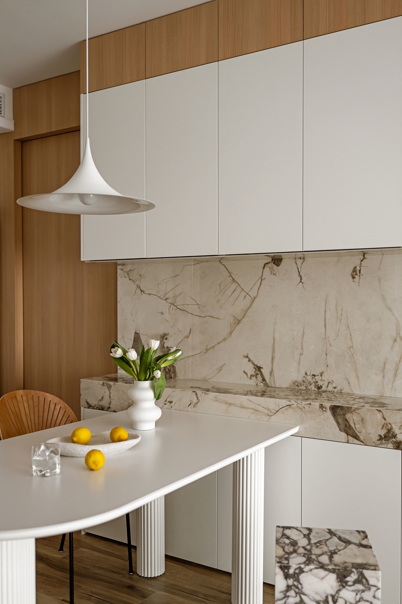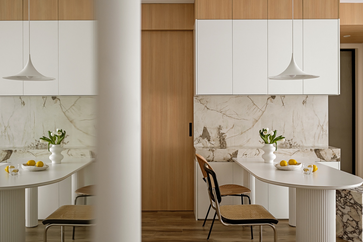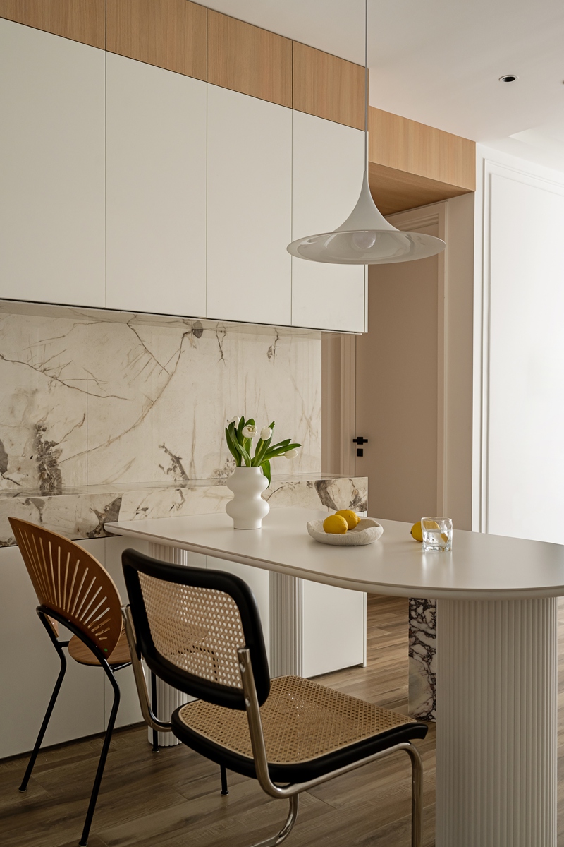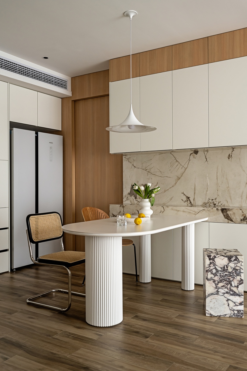 木质与大理石的碰撞,让餐厨区兼具自然温厚与轻奢质感。弧形餐桌的柱式设计自带艺术韵律,搭配藤编座椅的复古肌理,即使是日常三餐,也能成为一场“仪式感”的小剧场。大理石中岛与橱柜的简洁线条,让烹饪的烟火气,也染上了高级的底色。