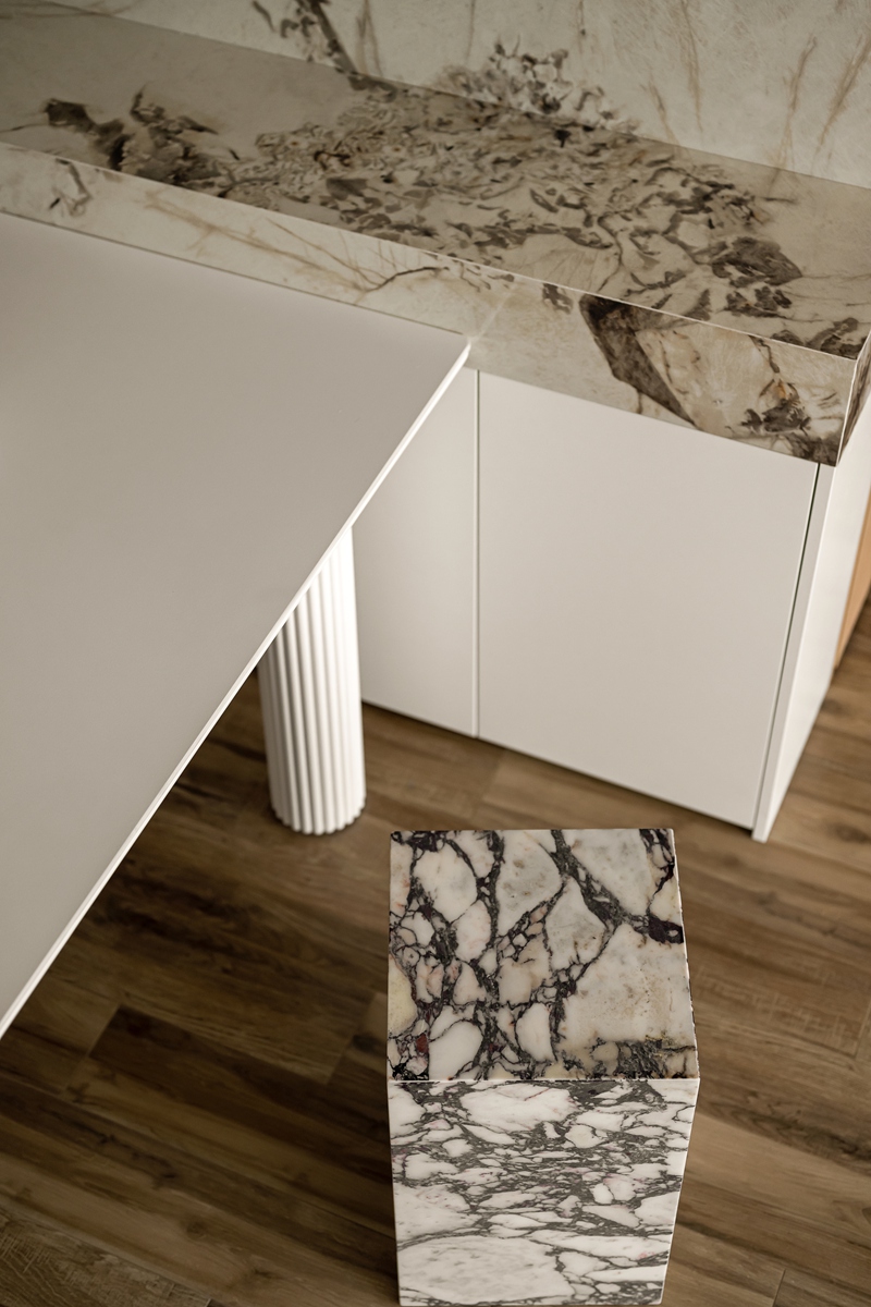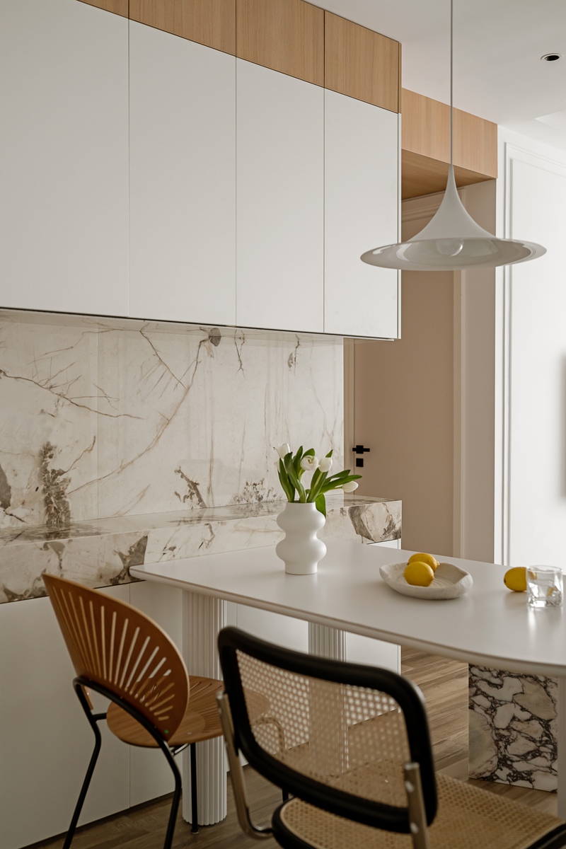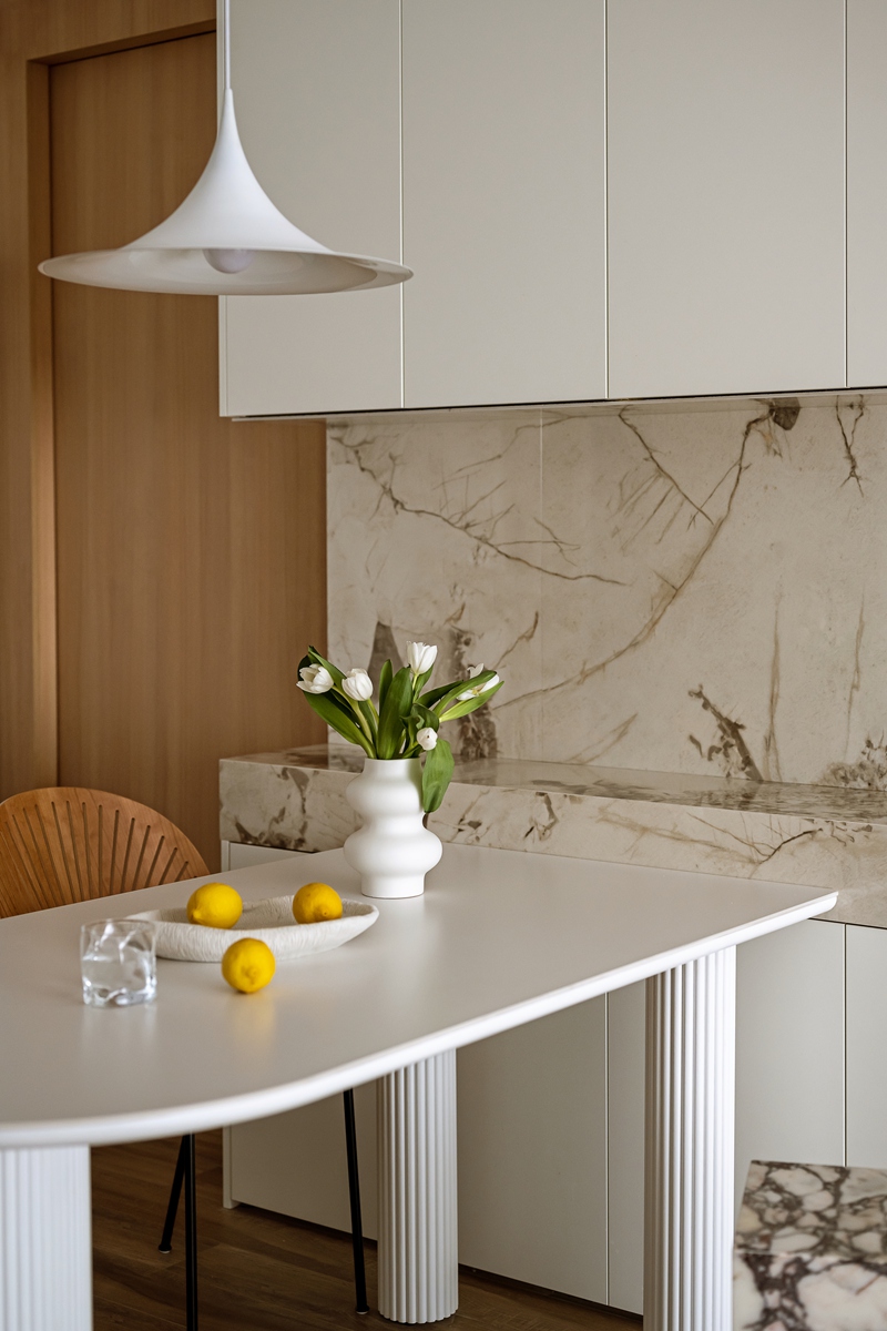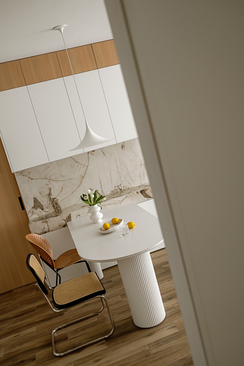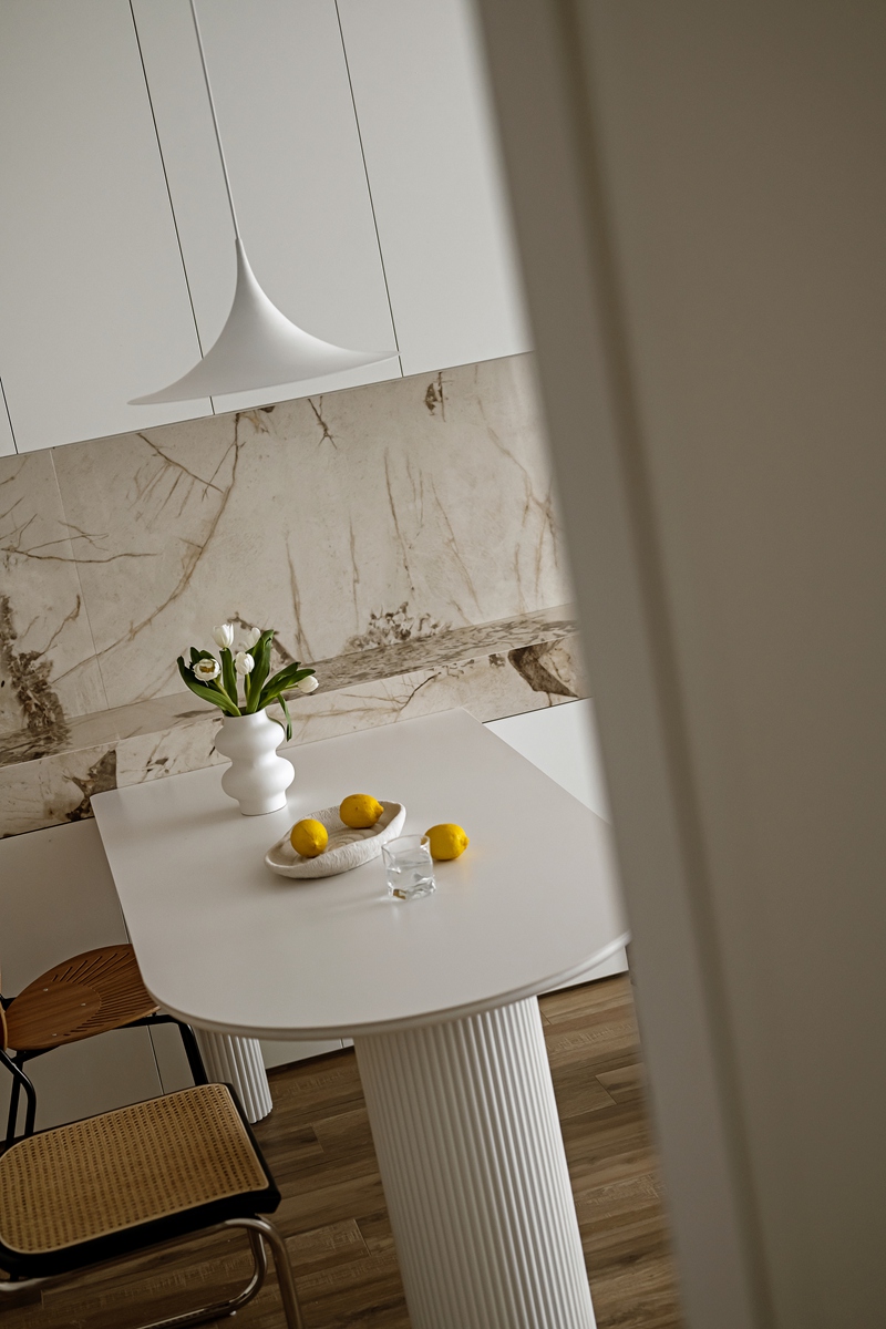 木质与大理石的碰撞,让餐厨区兼具自然温厚与轻奢质感。弧形餐桌的柱式设计自带艺术韵律,搭配藤编座椅的复古肌理,即使是日常三餐,也能成为一场“仪式感”的小剧场。大理石中岛与橱柜的简洁线条,让烹饪的烟火气,也染上了高级的底色。